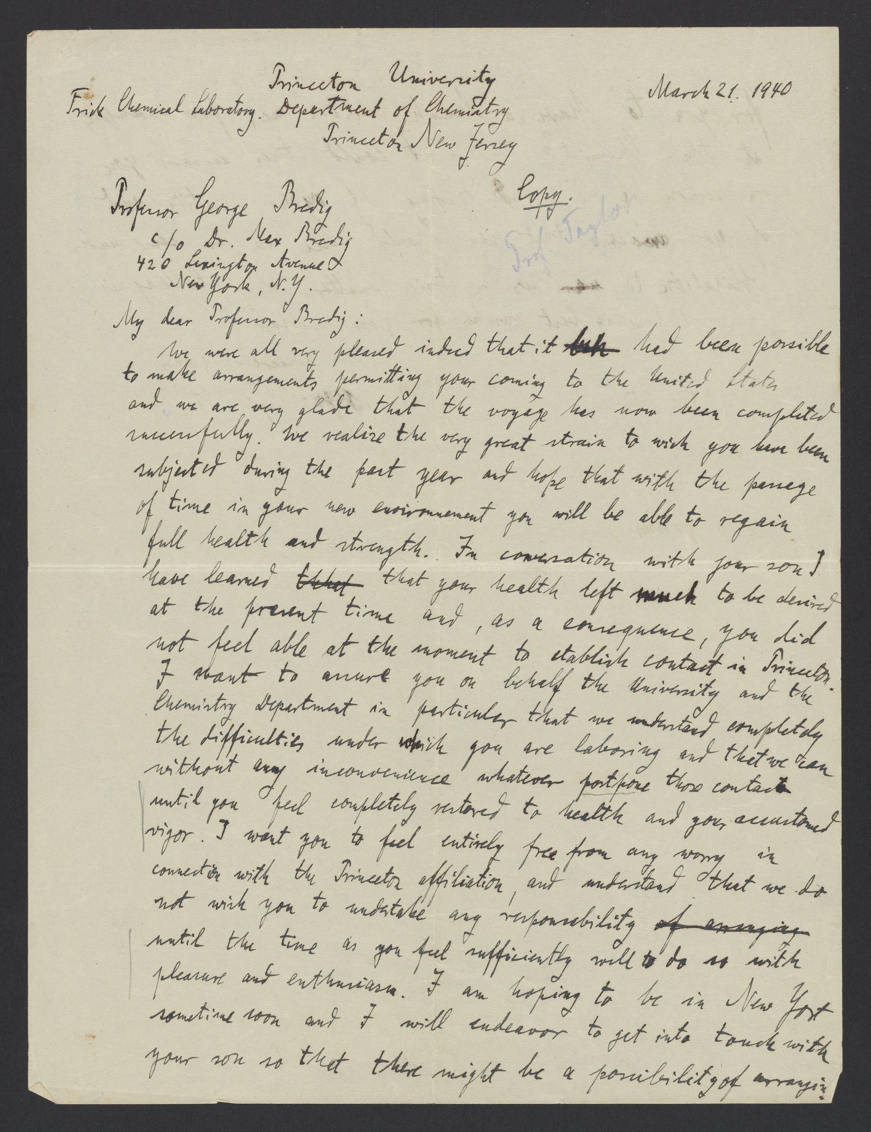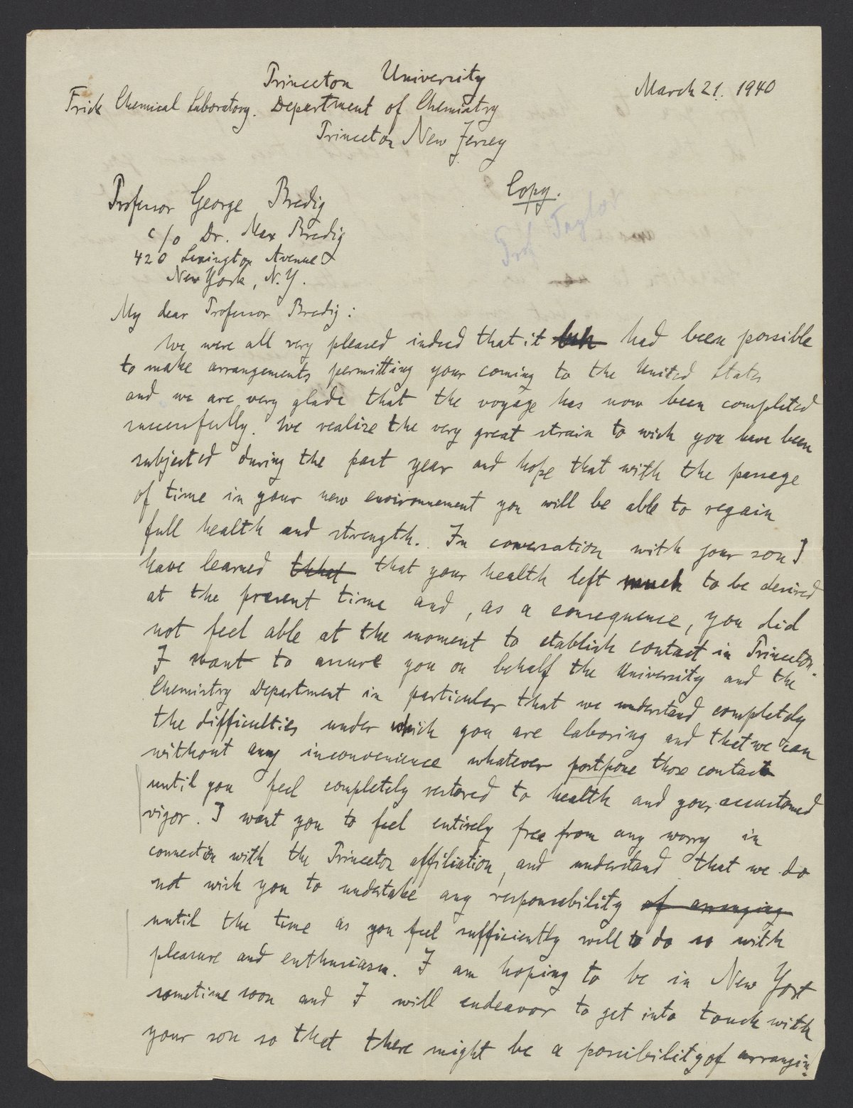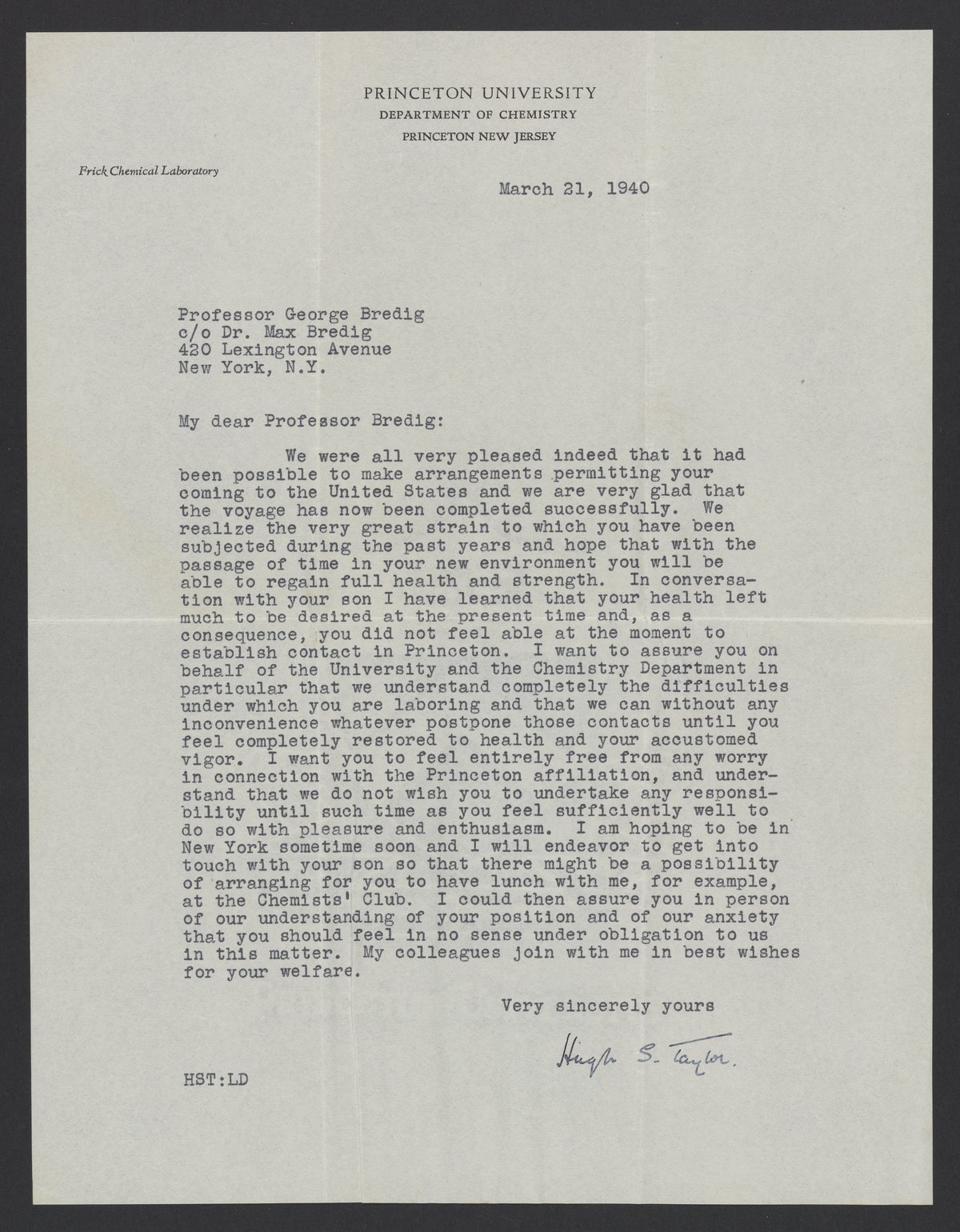 Letter from Hugh S. Taylor to Georg Bredig, March 21, 1940