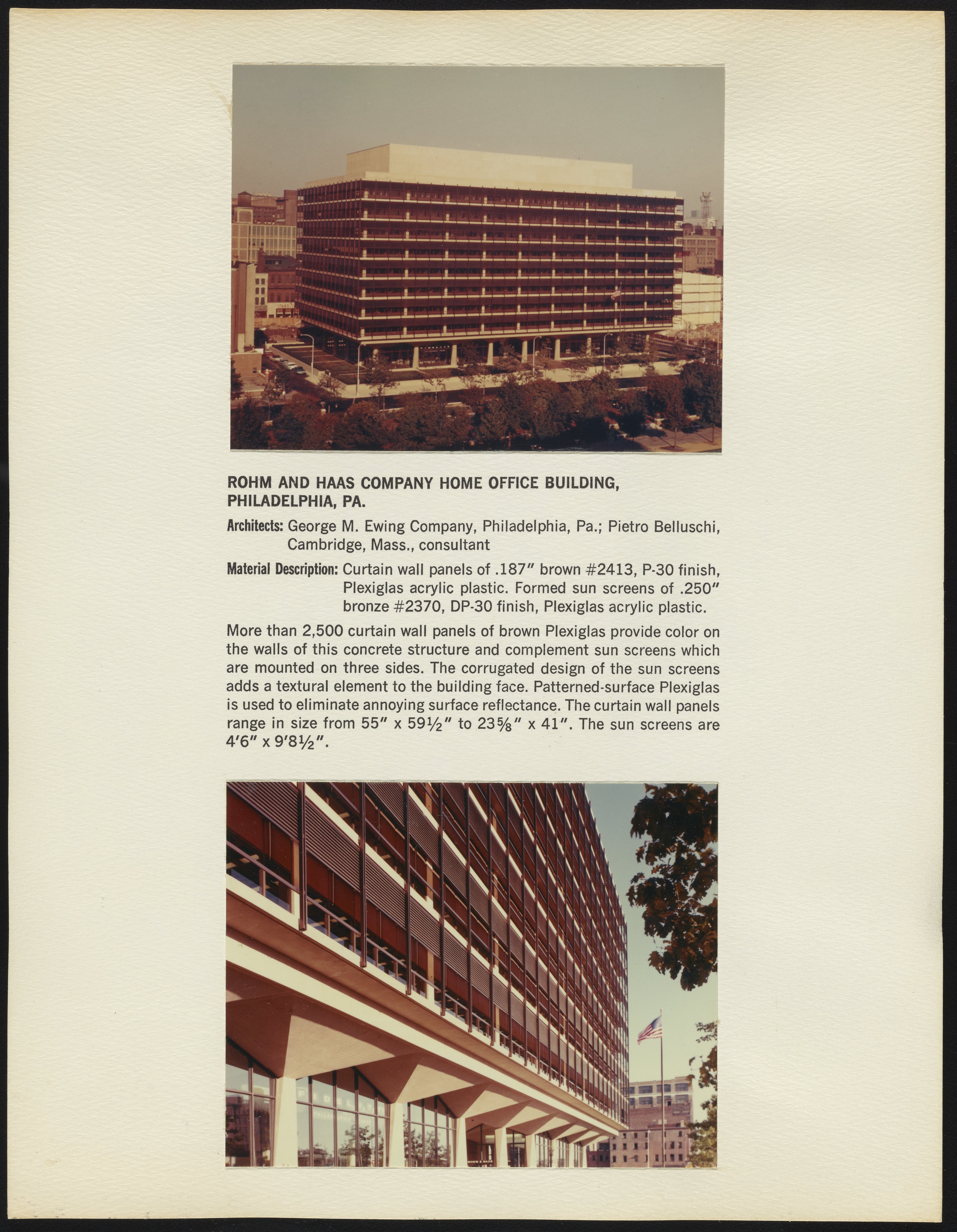 Two photographs depicting the Rohm and Haas Company home office building located in Philadelphia, Pennsylvania, part of a series documenting the use of Plexiglas in the building industry. Per notations accompanying the photographs, the building was designed by architectural firm George M. Ewing Company in consultation with Modernist architect Pietro Belluschi (1899-1994) and features brown Plexiglas curtain wall panels.