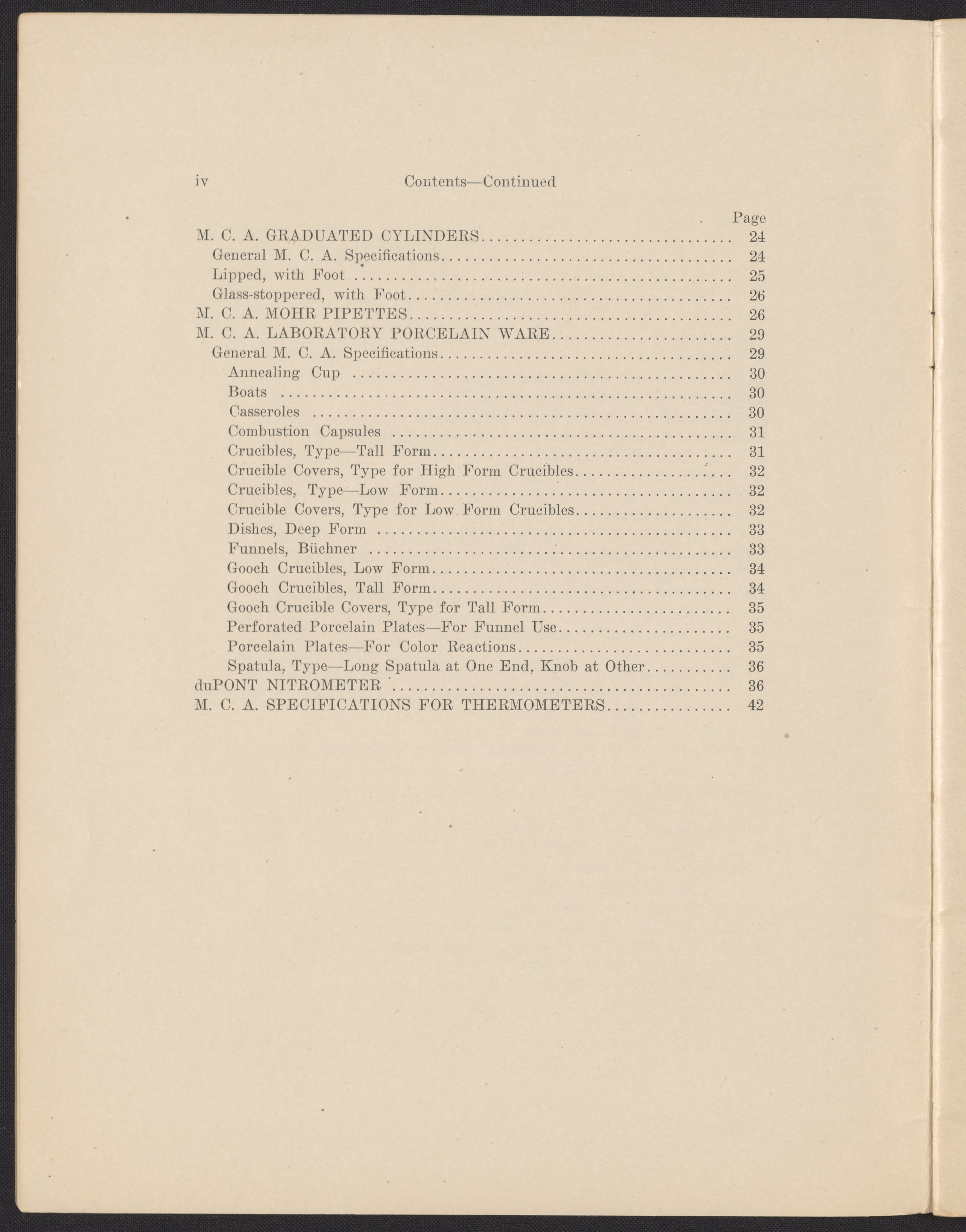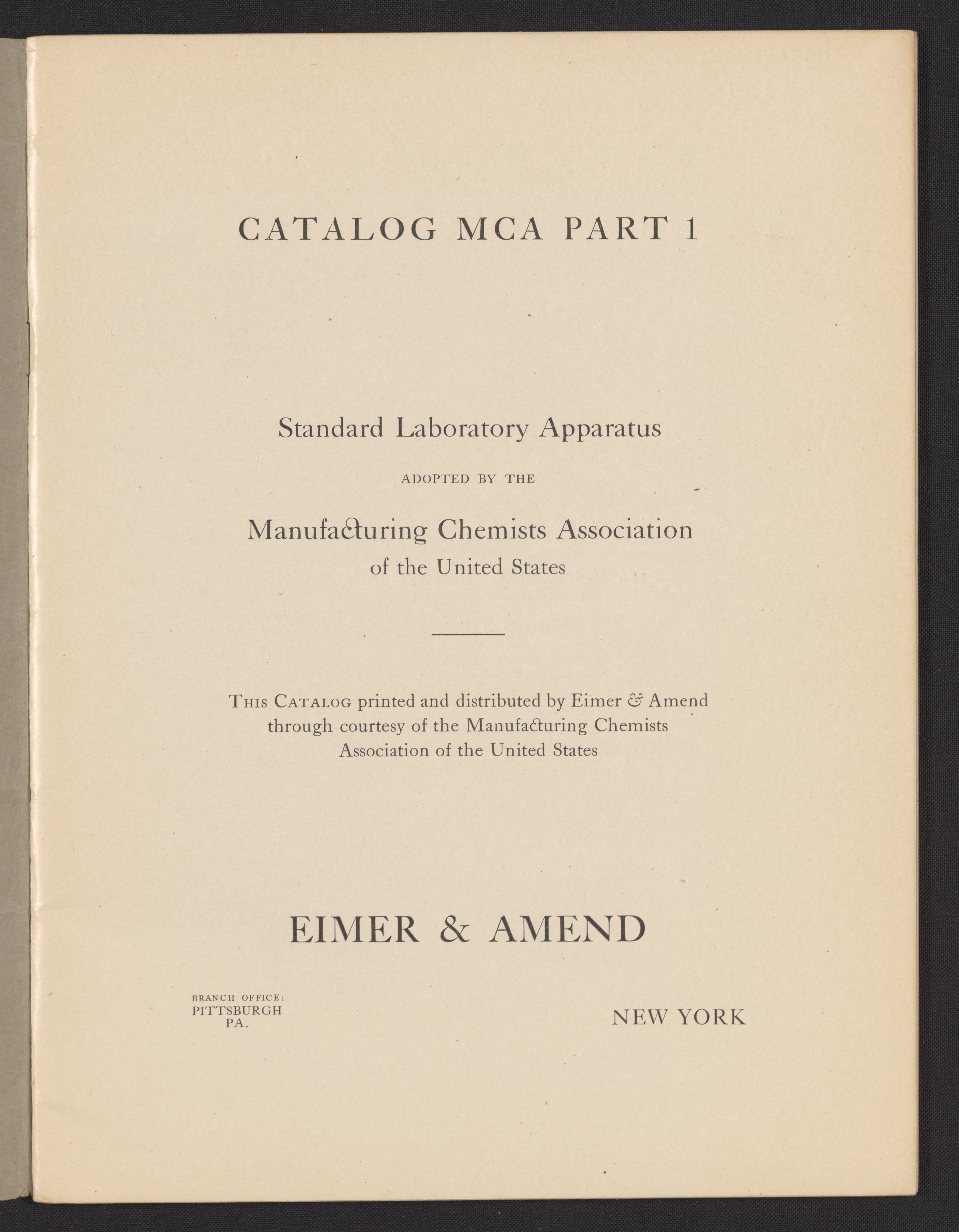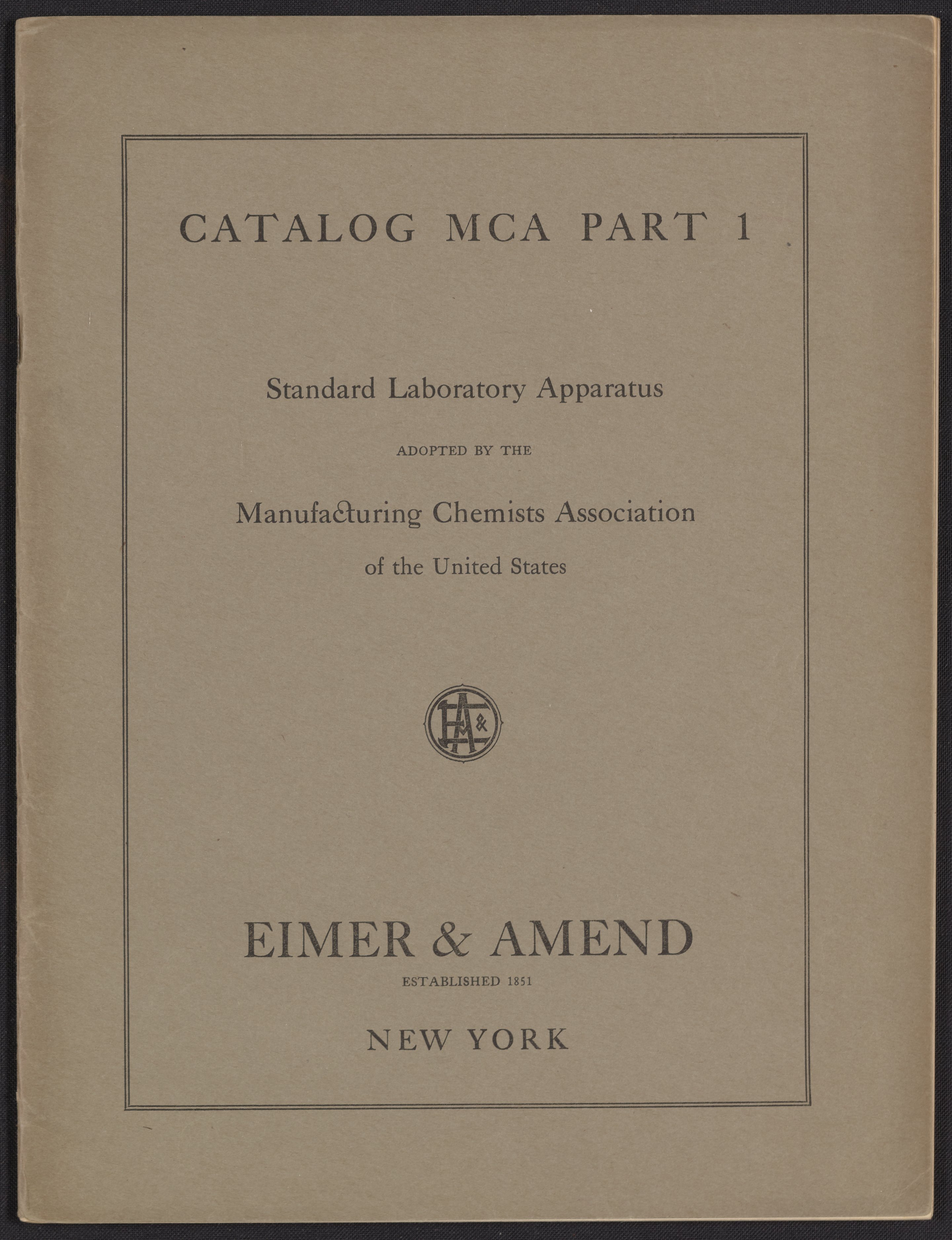Catalog published by Eimer & Amend in conjunction with the United States Manufacturing Chemists' Association (MCA) which reflects the standardization of apparatus manufactured by American chemical companies. Eimer & Amend, founded in 1851 by Bernard Amend (1821-1911) and Charles Eimer (1823- c. 1885), was an importer and supplier of chemical laboratory supplies. Eimer & Amend was acquired by the Fisher Scientific Company in 1940.