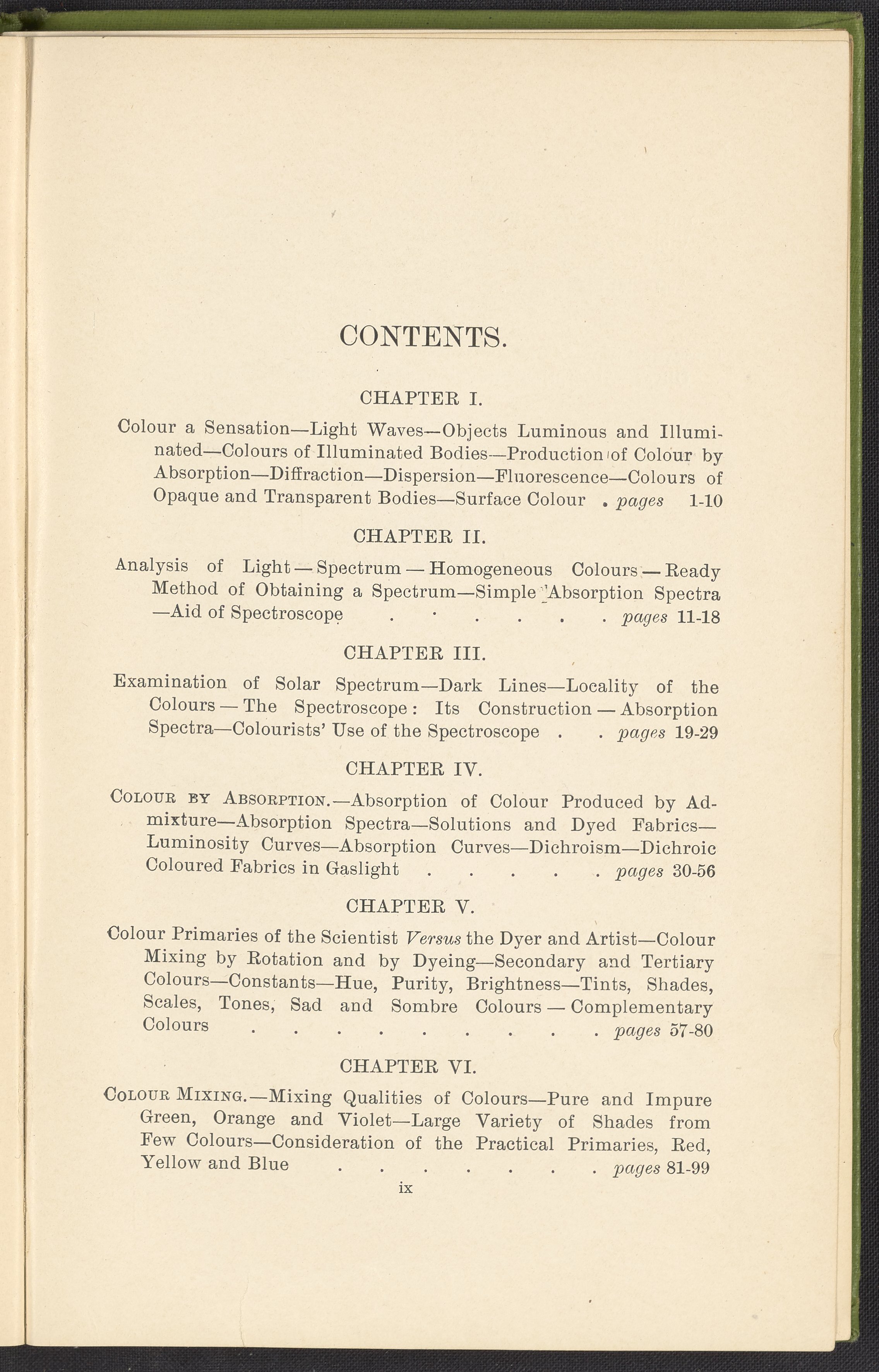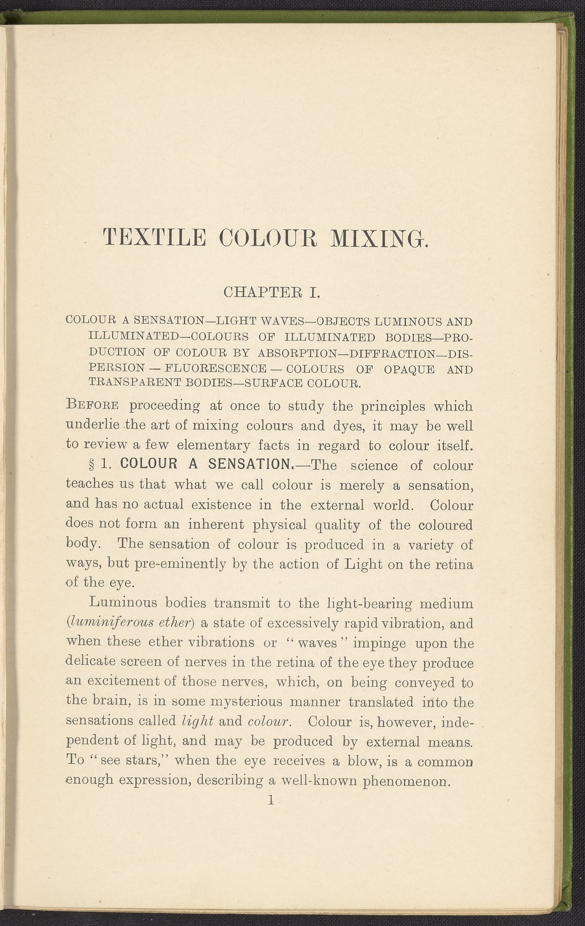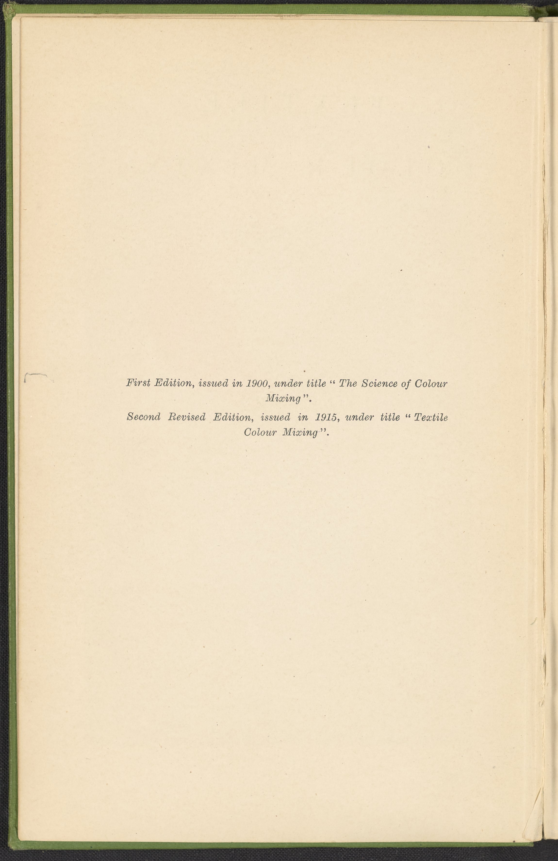 Small JPG1200 x 1784px — 330 KBFull-sized JPG2446 x 3636px — 1.2 MBOriginal fileTIFF — 2446 x 3636px — 25.5 MBA second revised edition of a text on color science. According to the author in his preface, this work deals “in a practical manner with the science of mixing ordinary colours and dyes… thus made applicable to the common everyday duties of the dyer and the colourist.” The work was written to complement the coursework of students enrolled in Textile Colleges as well as to provide technical context for color professionals. Contents include absorption spectroscopy, light waves and analysis, color mixing, primary colors, secondary colors, and tertiary shades. Includes five colored plates, four plates with dye samples, and 40 figures and illustrations. Work is digitized in its entirety.