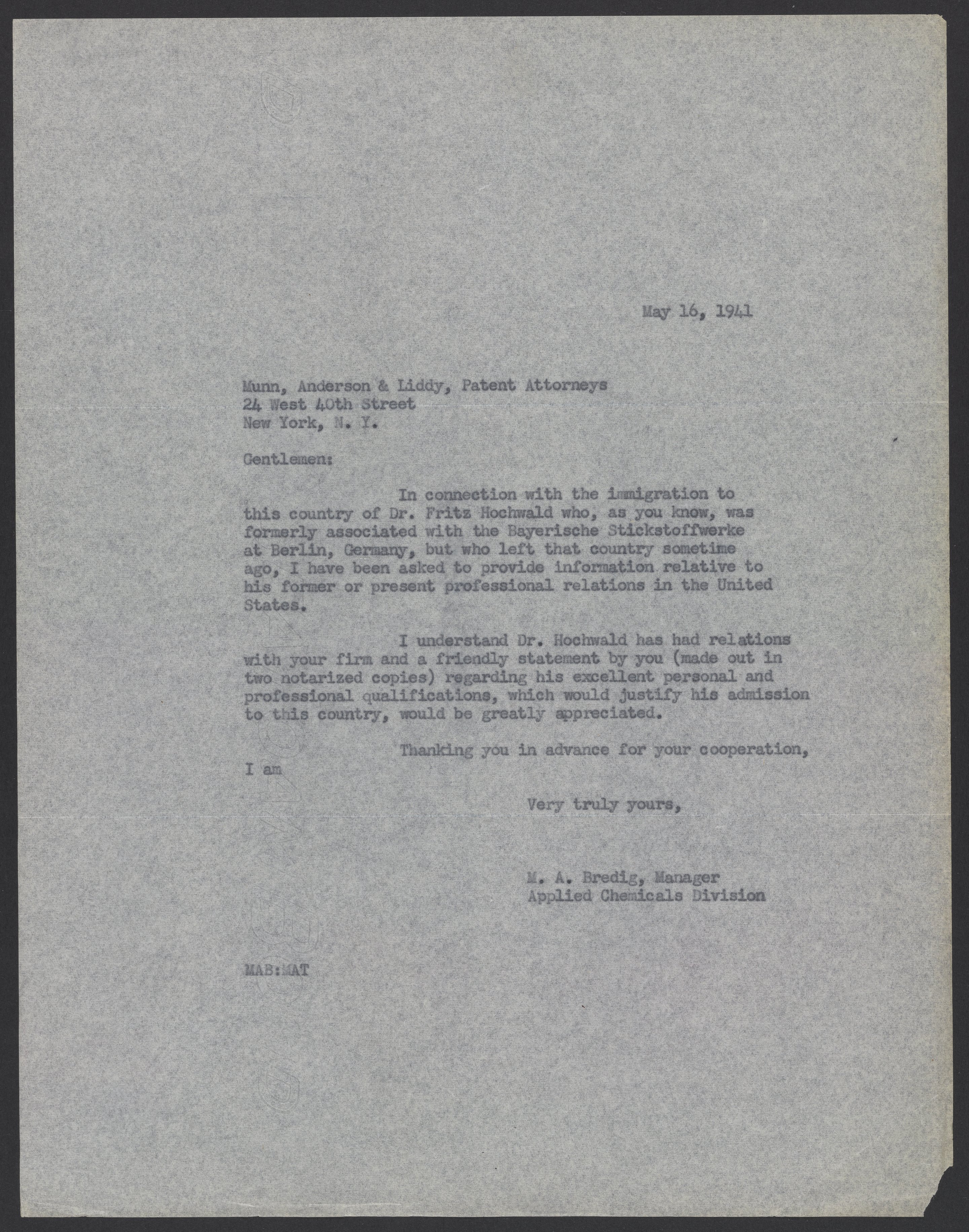 Letter from Max Bredig to Munn, Anderson and Liddy, May 16, 1941