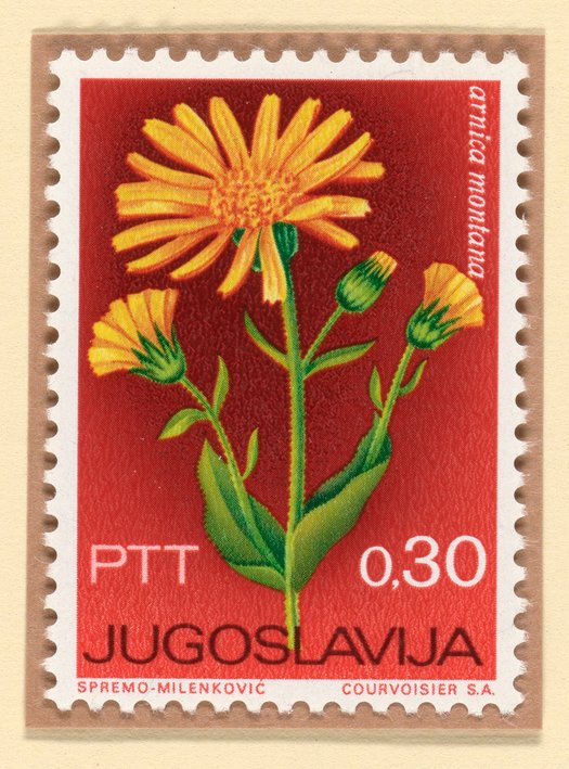 Small JPG1200 x 1621px — 426 KBFull-sized JPG1249 x 1687px — 457 KBOriginal fileTIFF — 1249 x 1687px — 6.0 MB1967 Yugoslavian postage stamp featuring an illustration of Mountain Arnica flowers. Mountain arnica is a poisonous plant, but it has been used in herbal medicines. Extracts of mountain arnica have been studied on its effectiveness in topical medications to treat pain, swelling, and bruising.