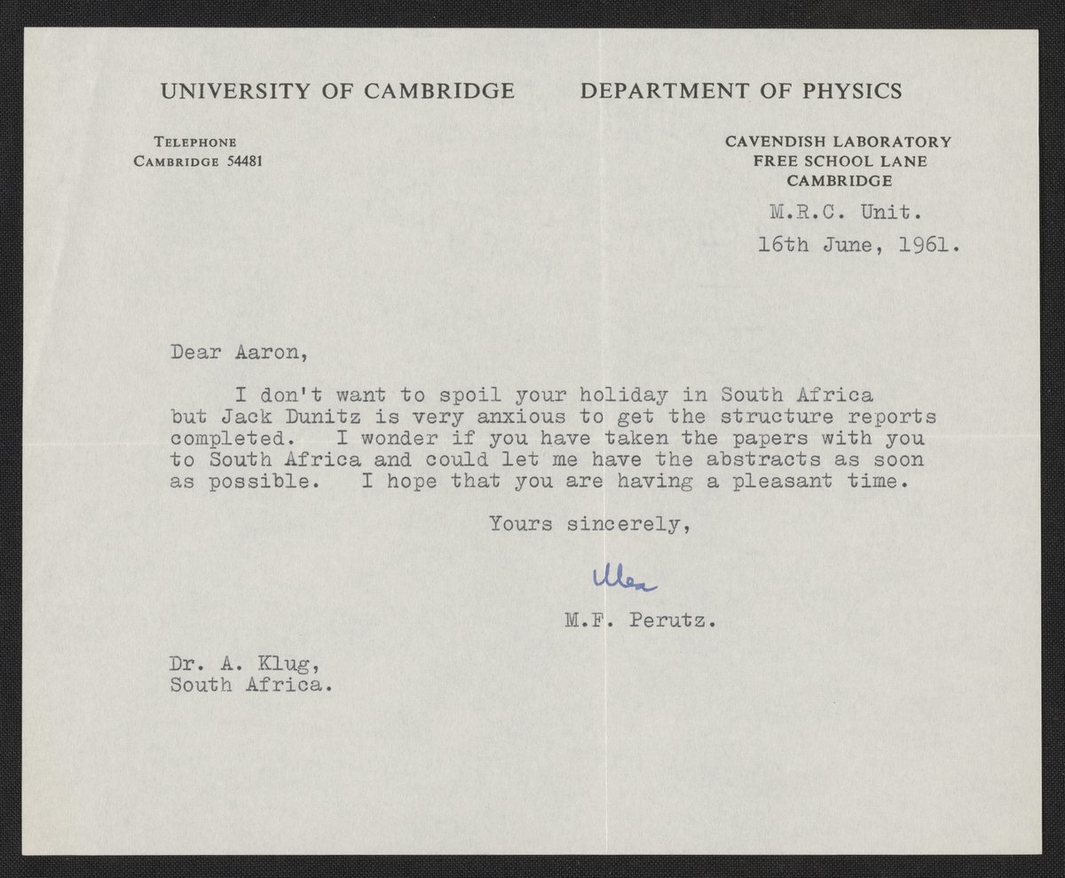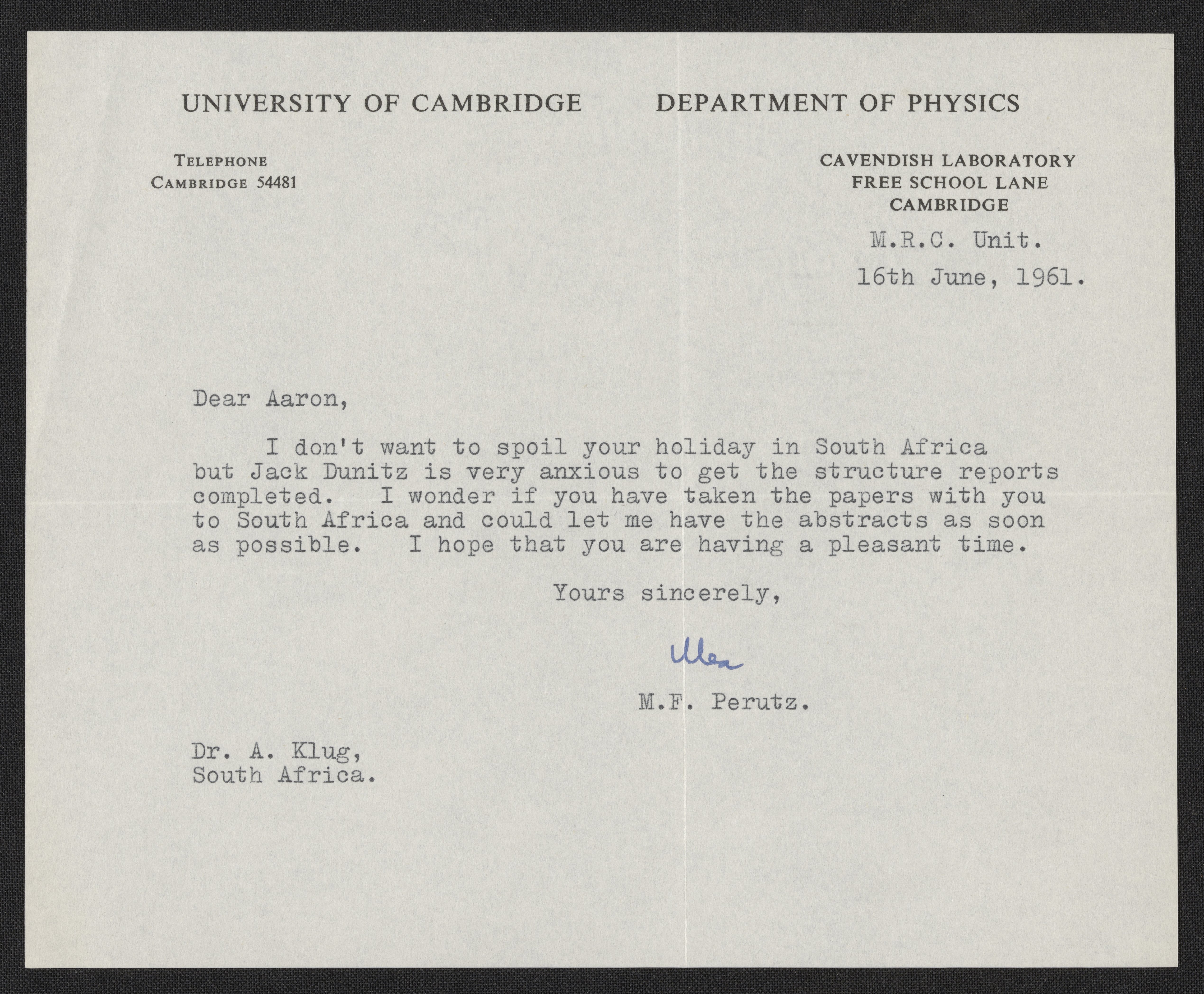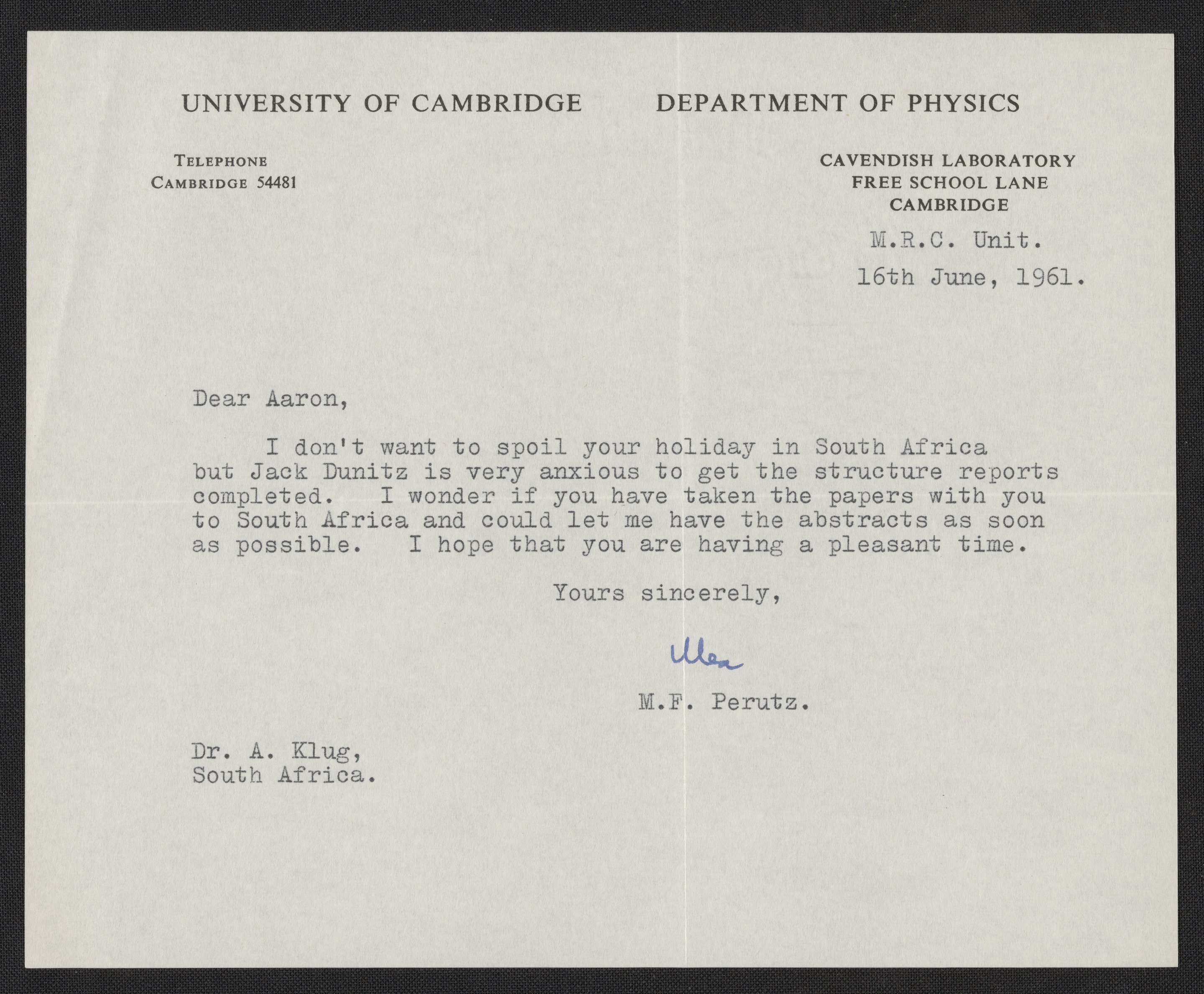 Letter from Max Perutz (1914-2002) to Aaron Klug (1926-2018), written June 16th, 1961.