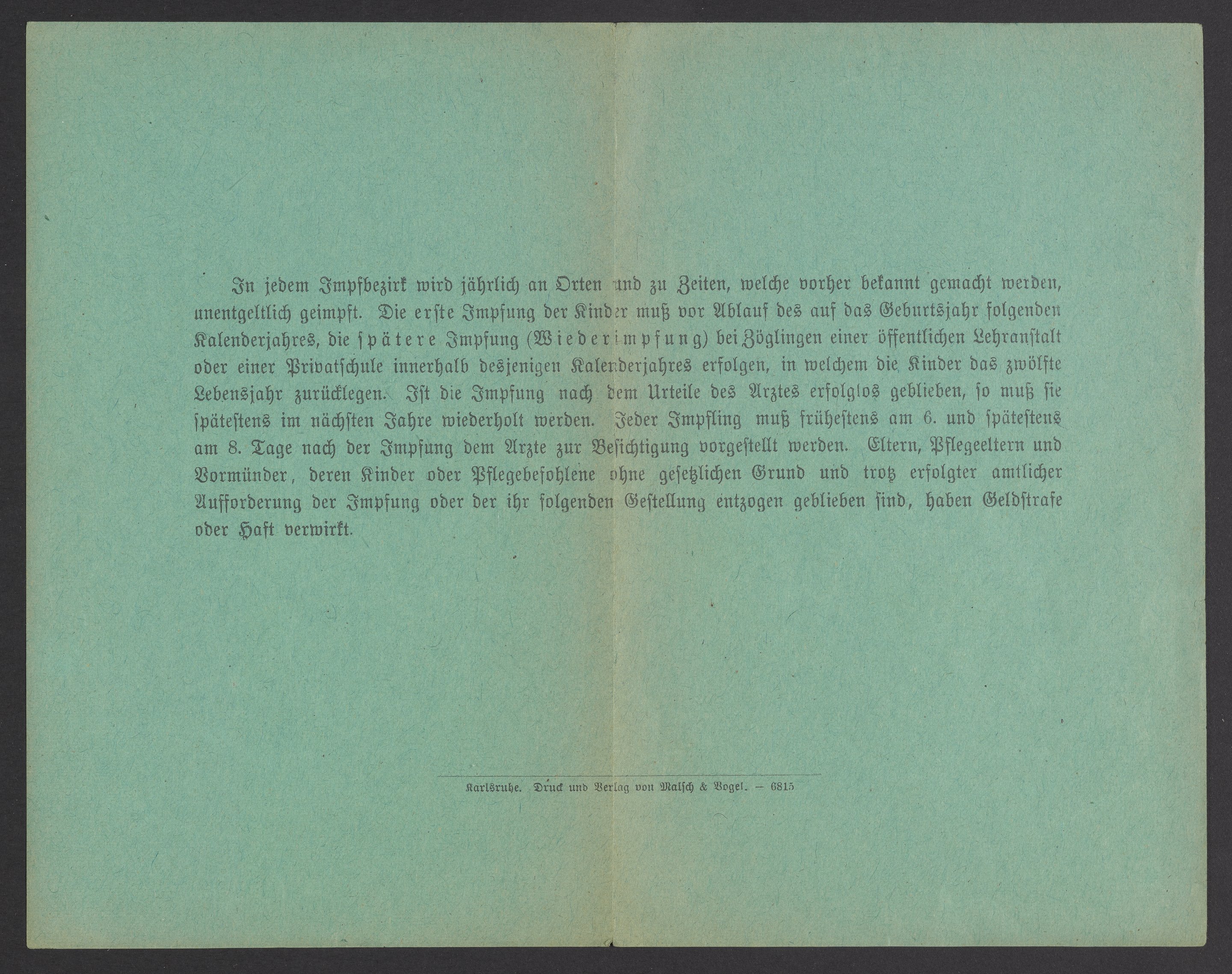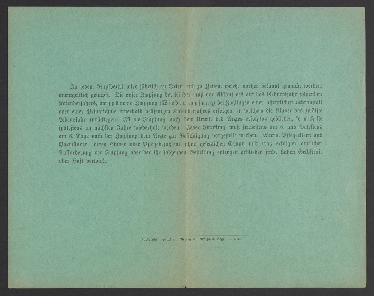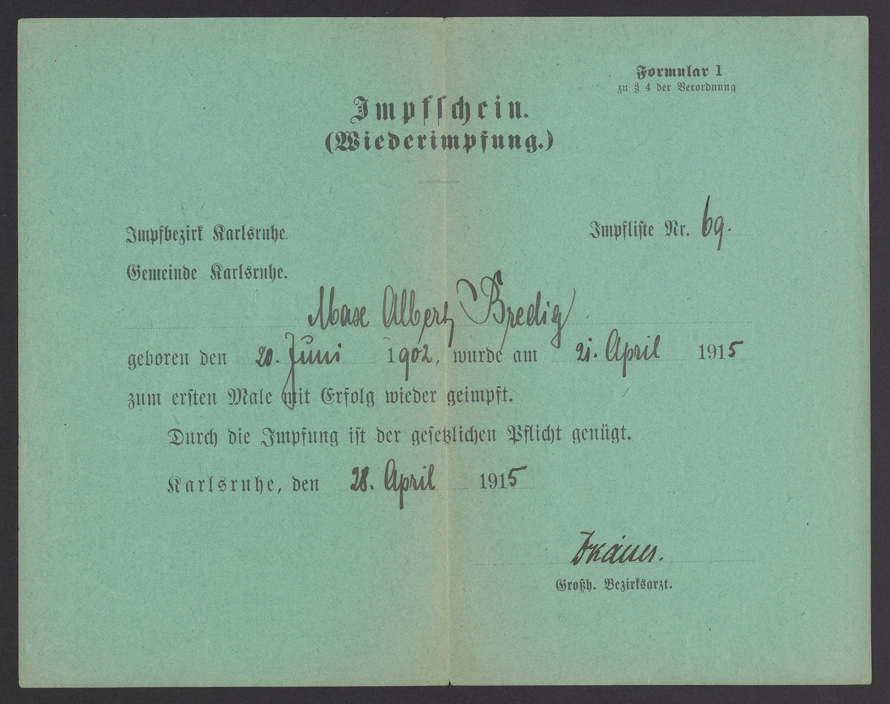 Max Bredig's vaccination card, 1915