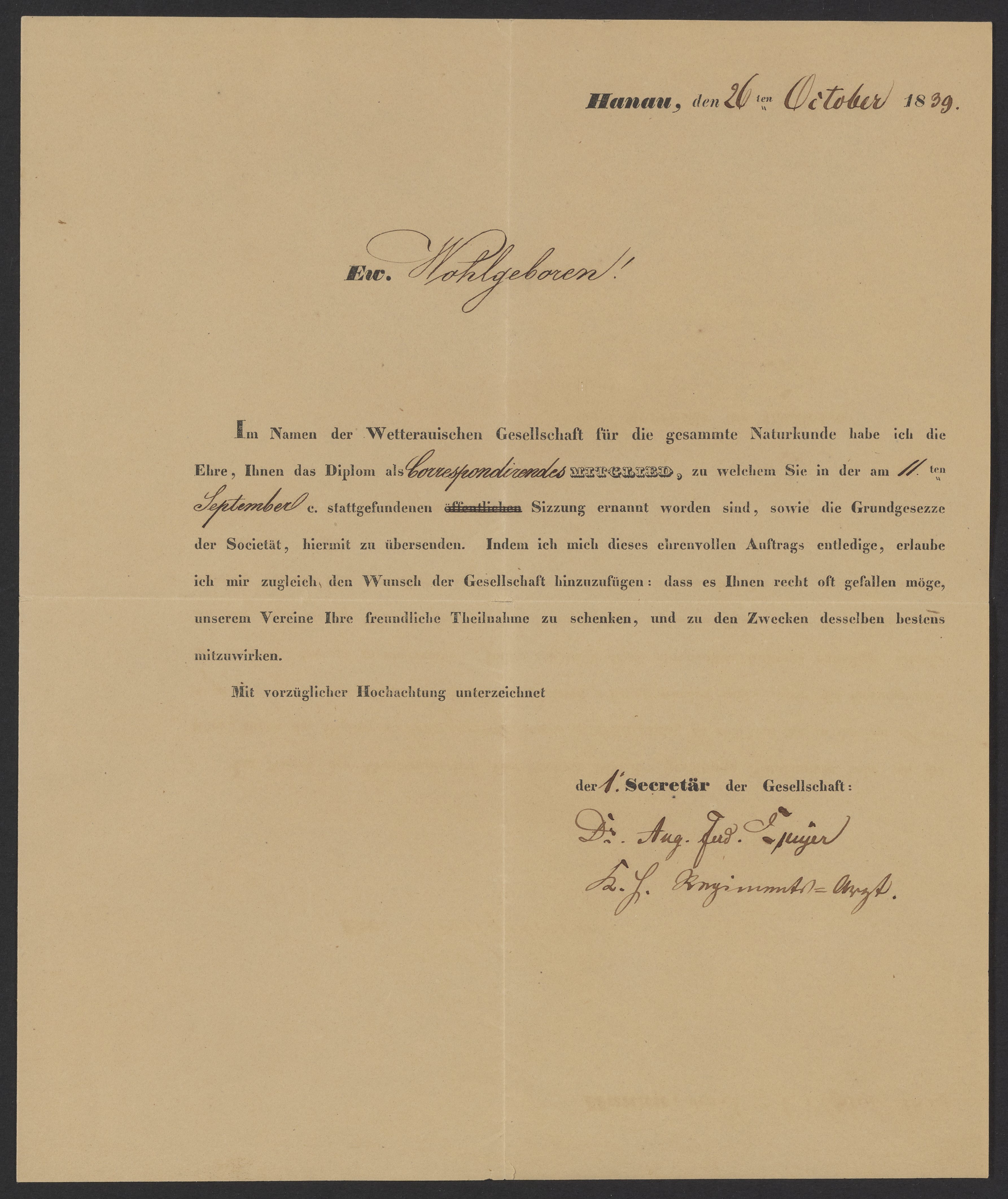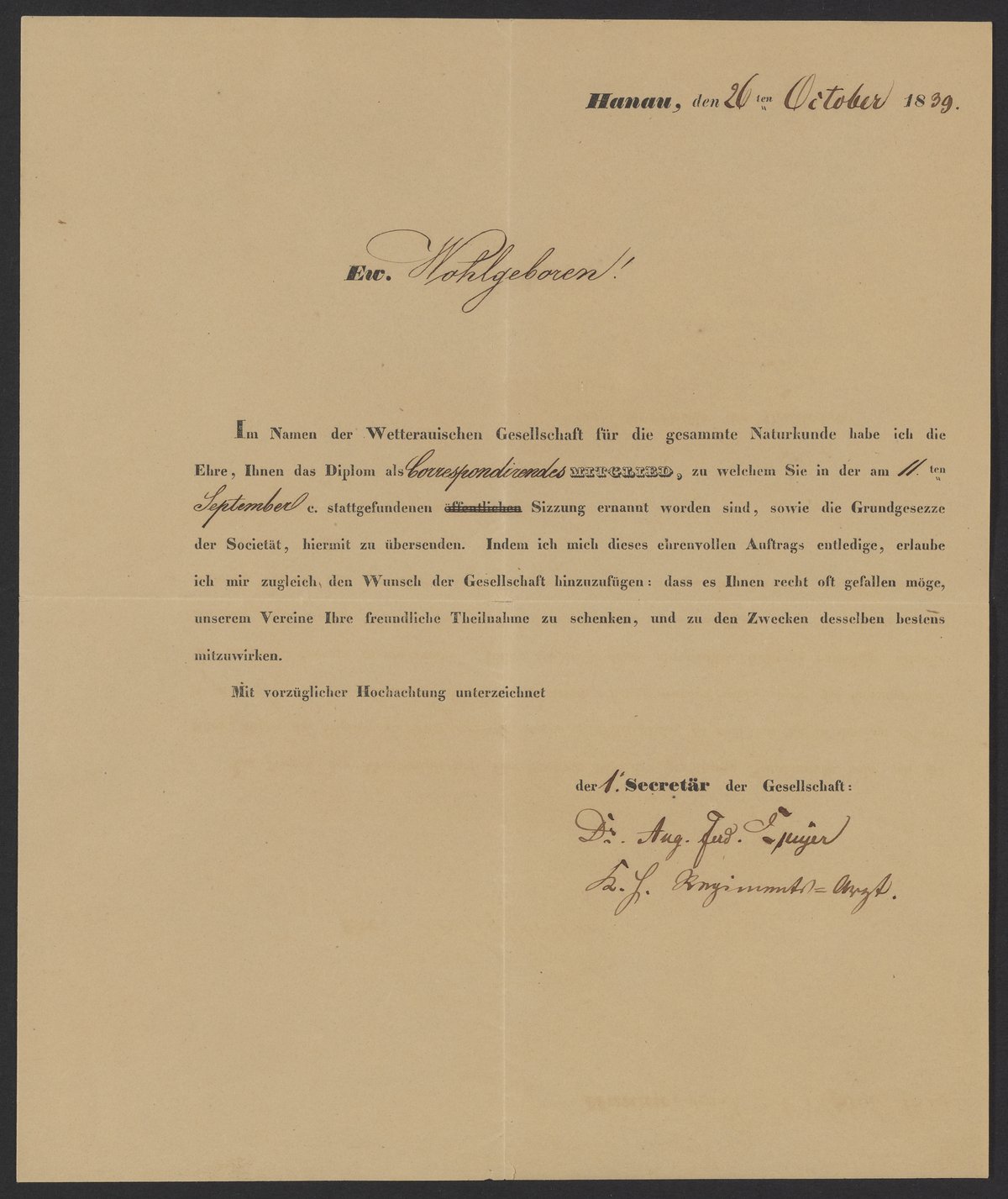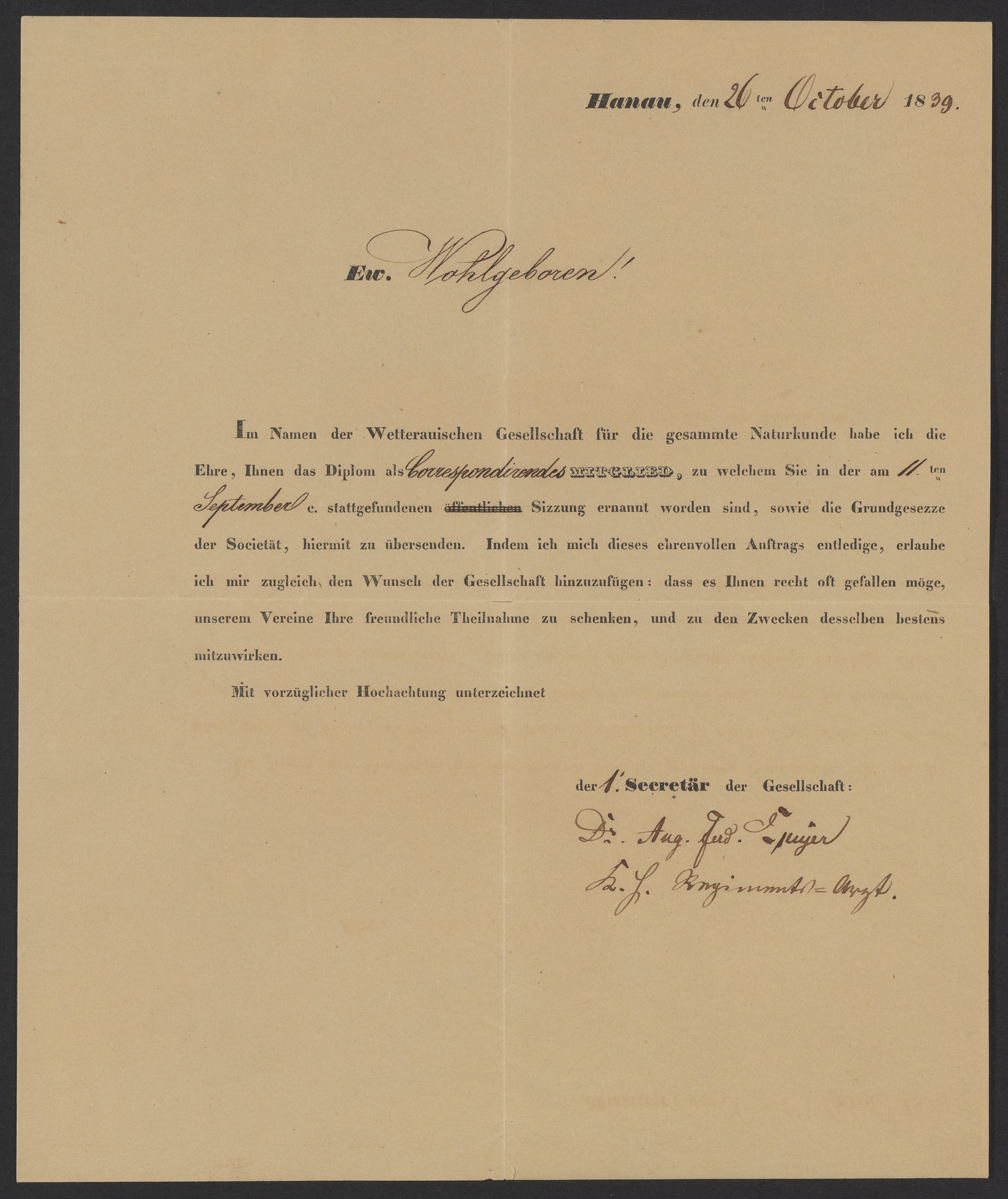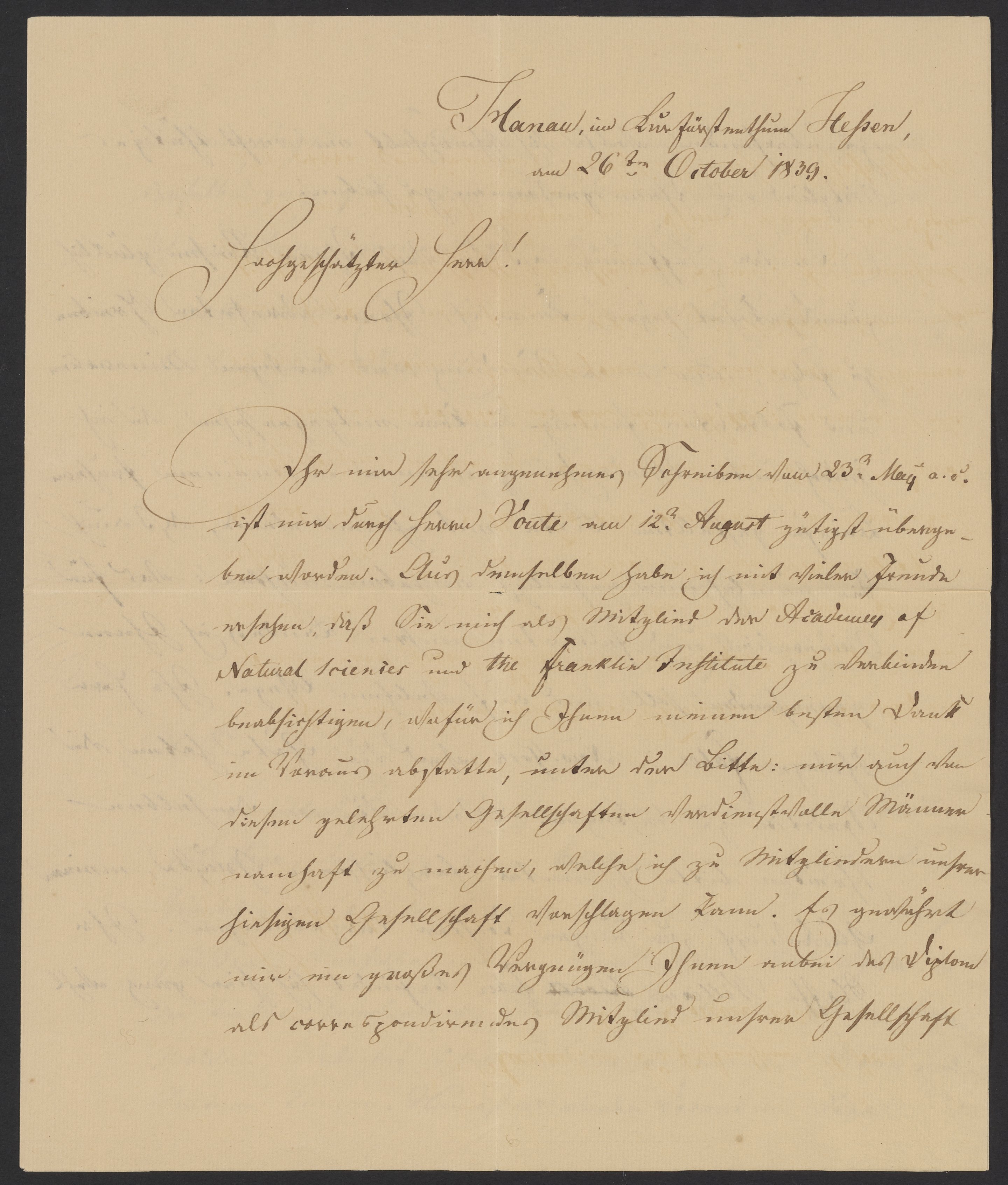 Wetterauische Gesellschaft für die gesammte Naturkunde. “Letters from the Secretary of the Wetterauischen Gesellschaft Fur Die Gesammte Naturkunde [Society of Natural History] to James Curtis Booth,” October 26, 1839. Papers of James Curtis Booth, Box 1, Folder 2. Science History Institute. Philadelphia. https://digital.sciencehistory.org/works/awyuox5.