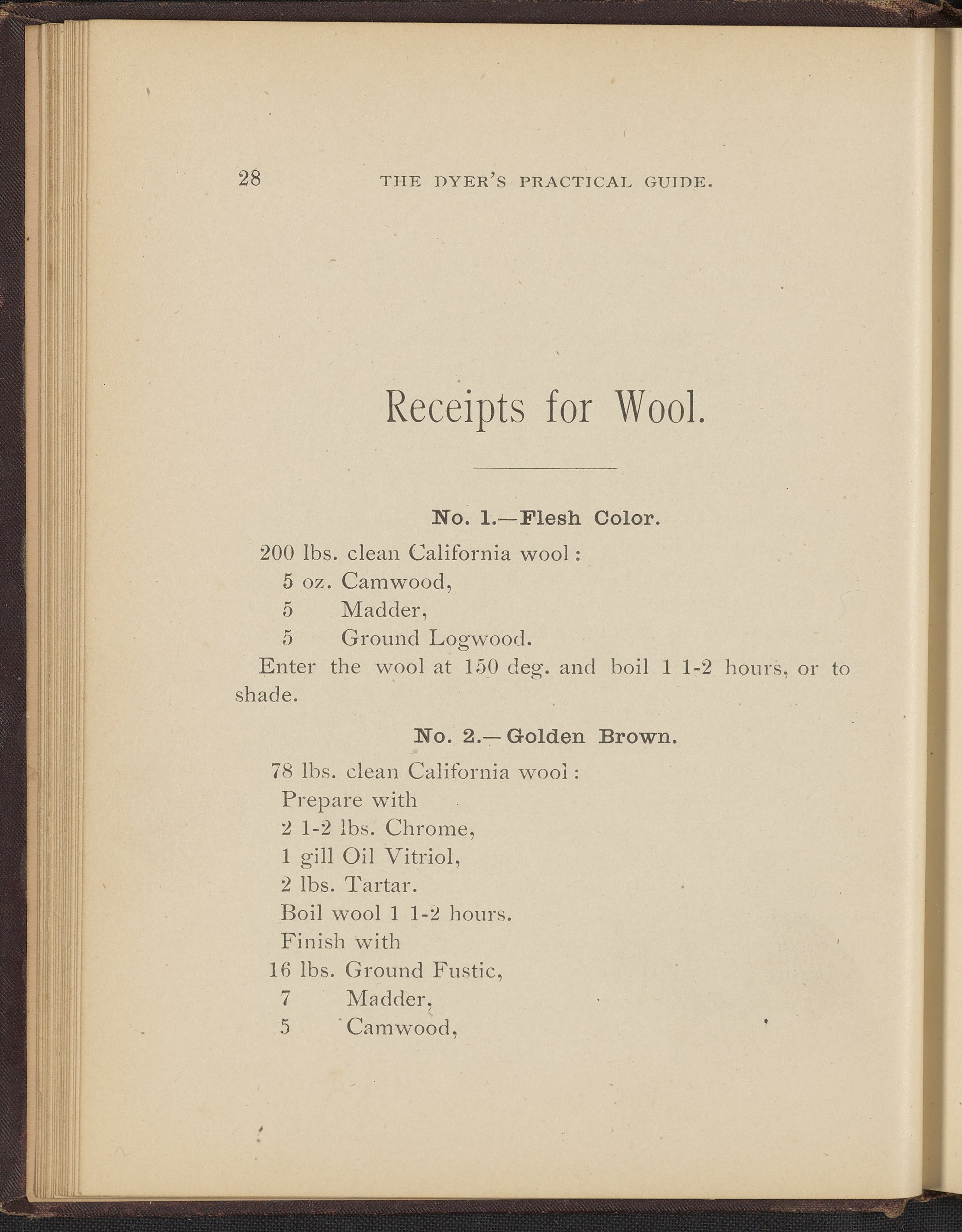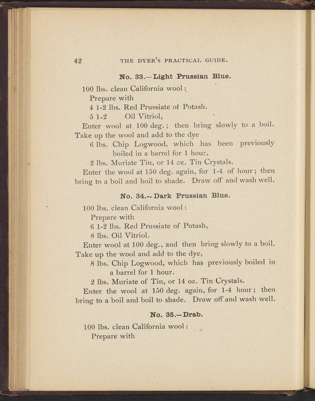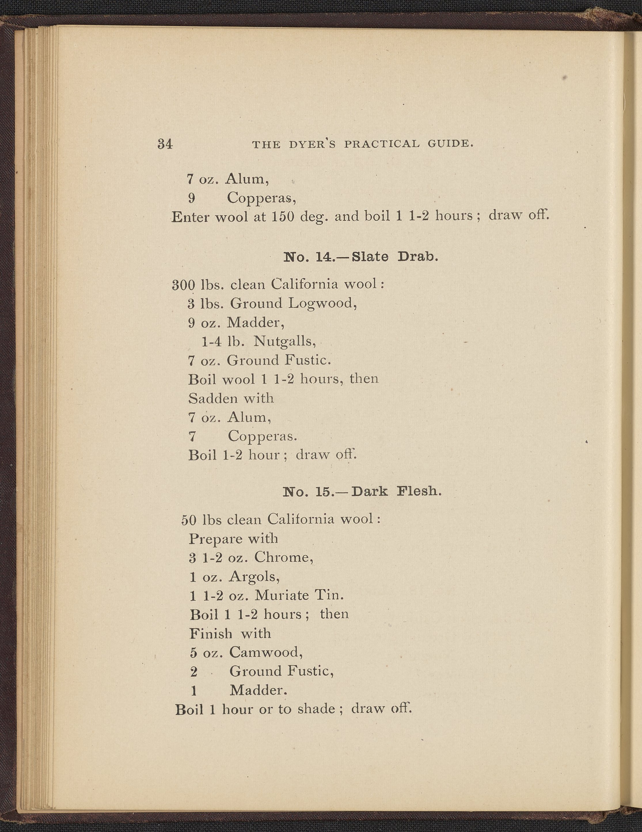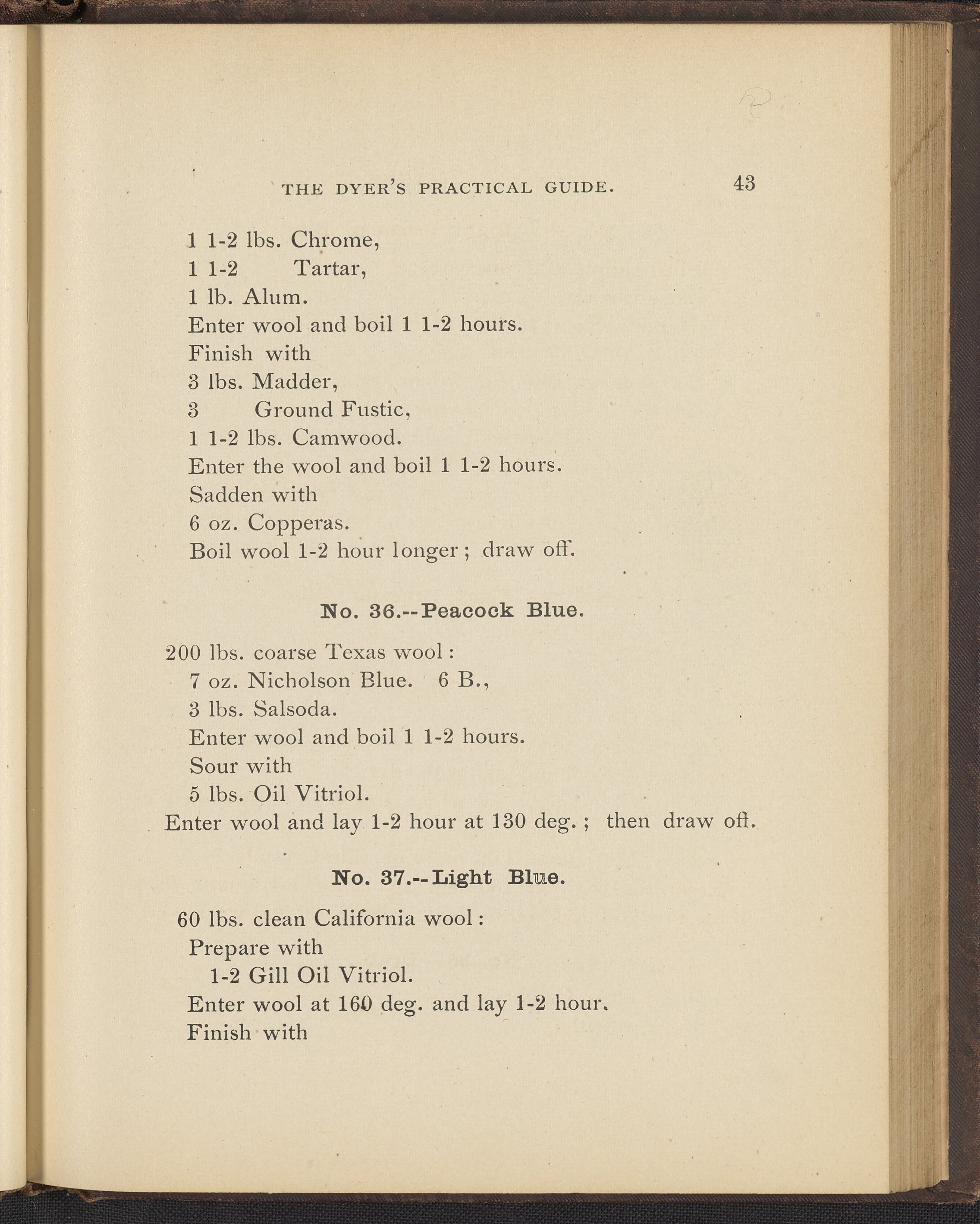 Small JPG1200 x 1496px — 493 KBFull-sized JPG2356 x 2937px — 1.7 MBOriginal fileTIFF — 2356 x 2937px — 19.8 MBTreatise containing "practical knowledge" on dyeing for manufacturers, with sections on mordants, chemicals used in dyeing, wool scouring, extracting cotton from wool, and 253 dye recipes for wool, cotton, and shoddy (recycled wool).