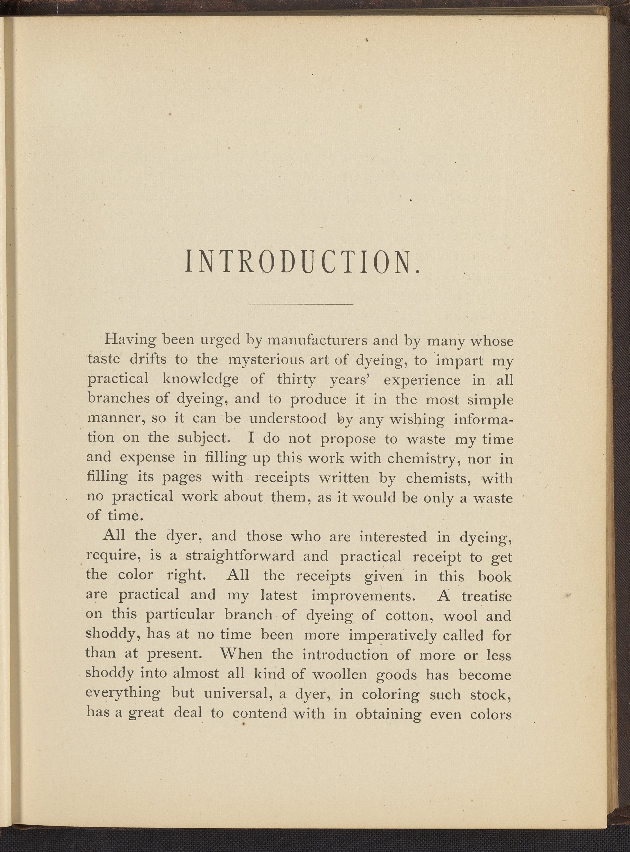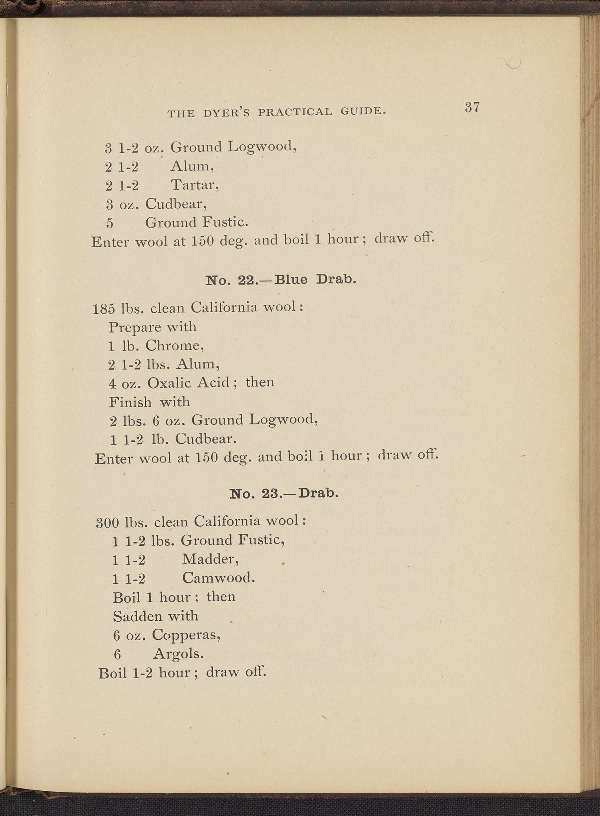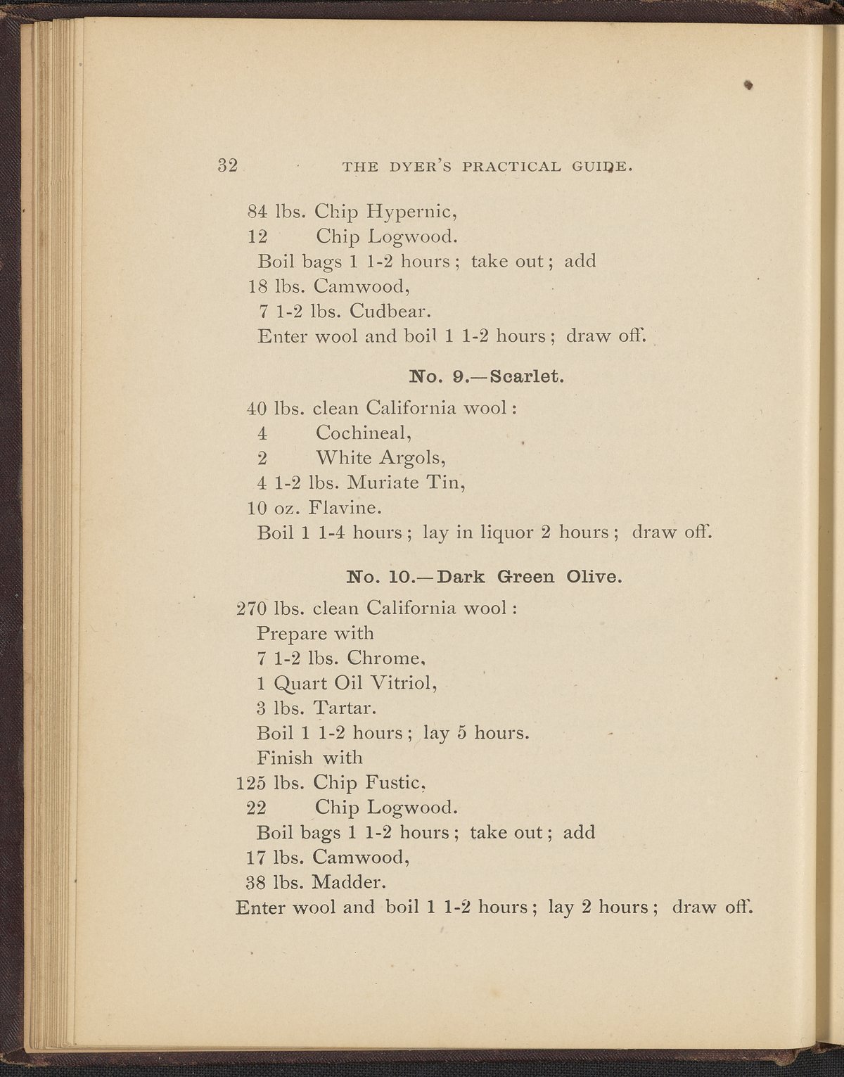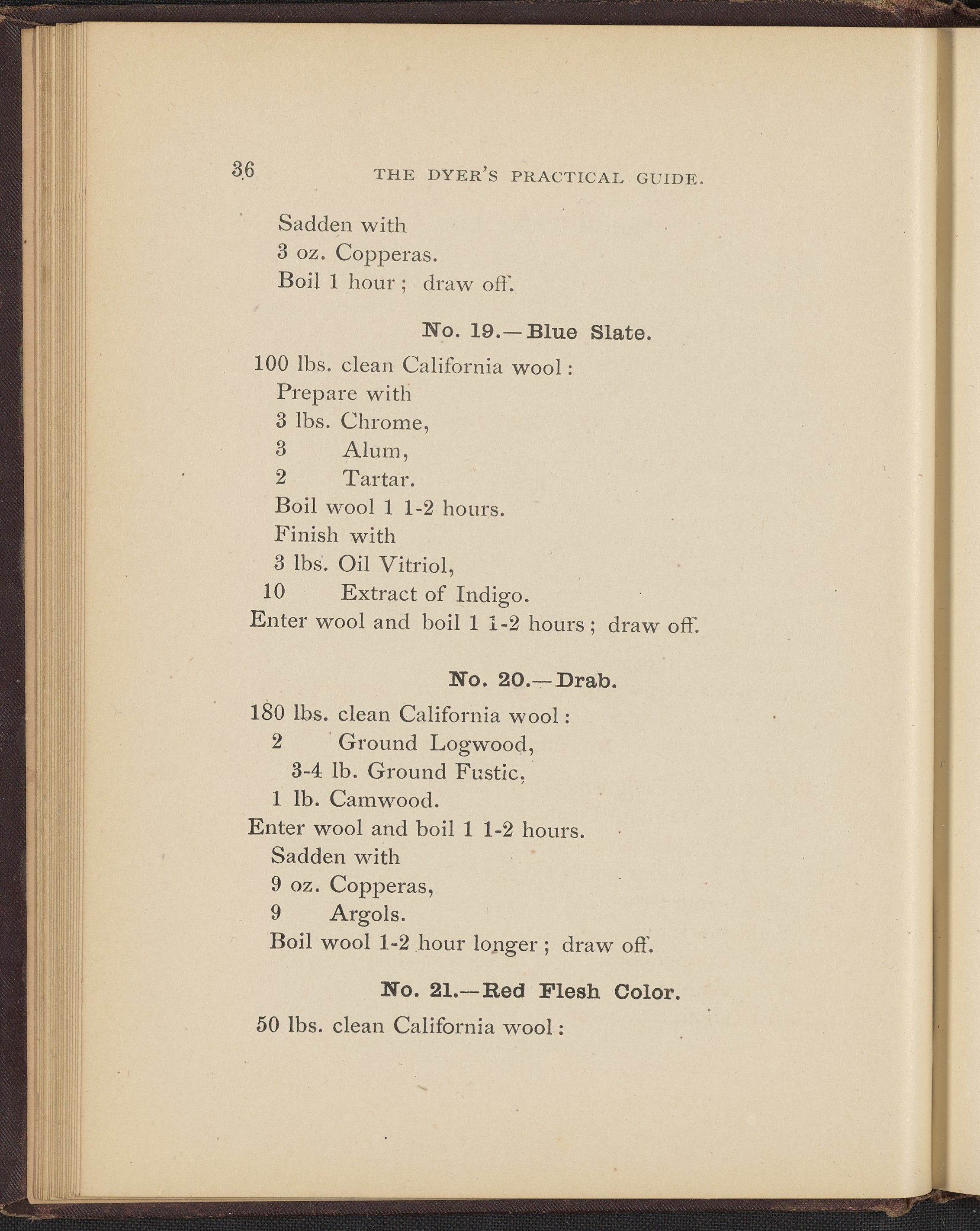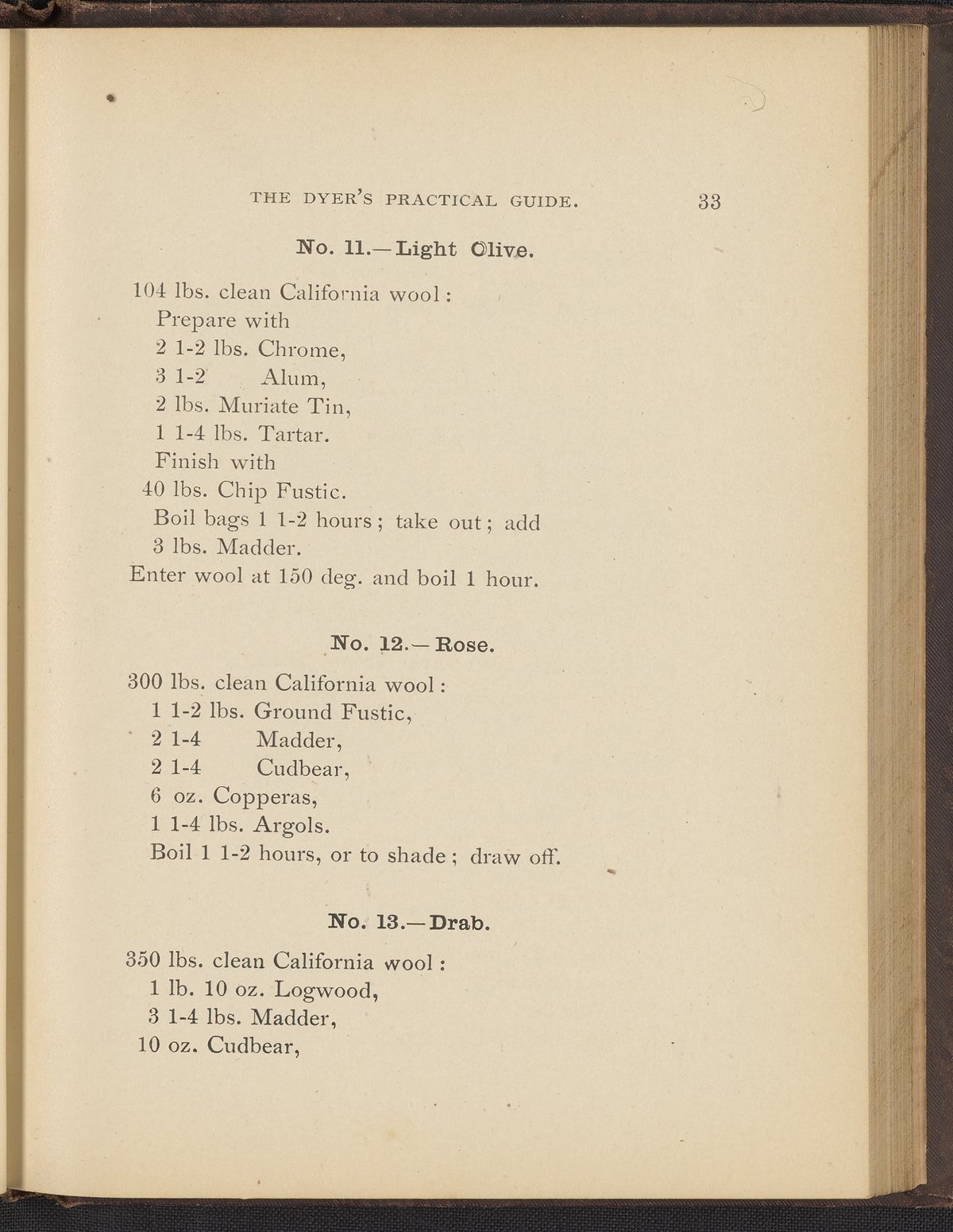 Small JPG1200 x 1496px — 493 KBFull-sized JPG2356 x 2937px — 1.7 MBOriginal fileTIFF — 2356 x 2937px — 19.8 MBTreatise containing "practical knowledge" on dyeing for manufacturers, with sections on mordants, chemicals used in dyeing, wool scouring, extracting cotton from wool, and 253 dye recipes for wool, cotton, and shoddy (recycled wool).