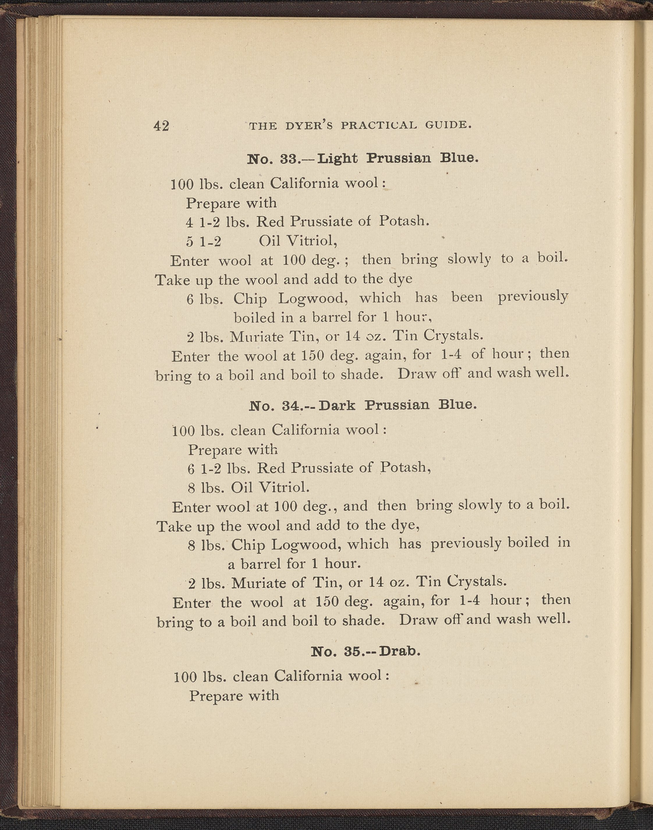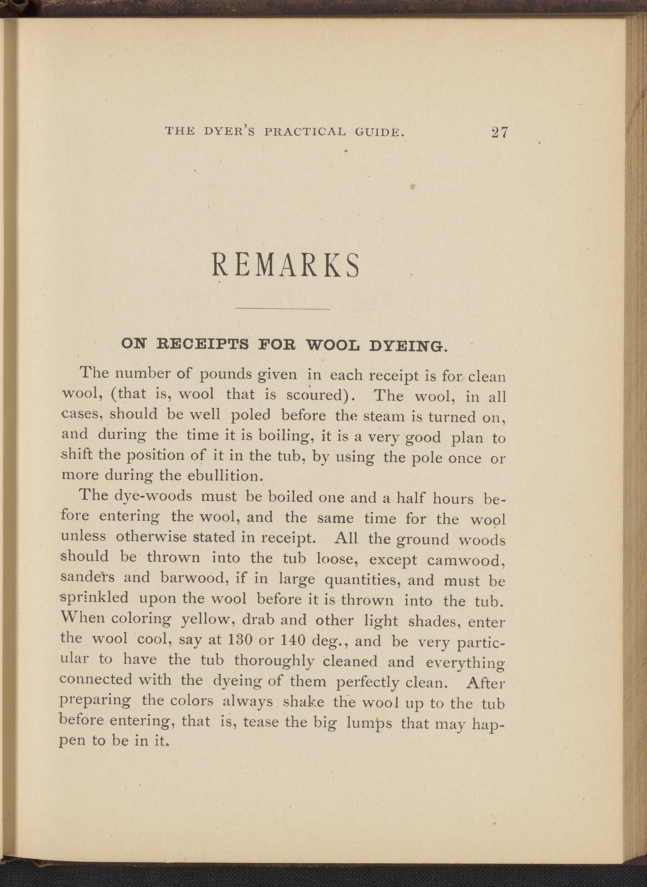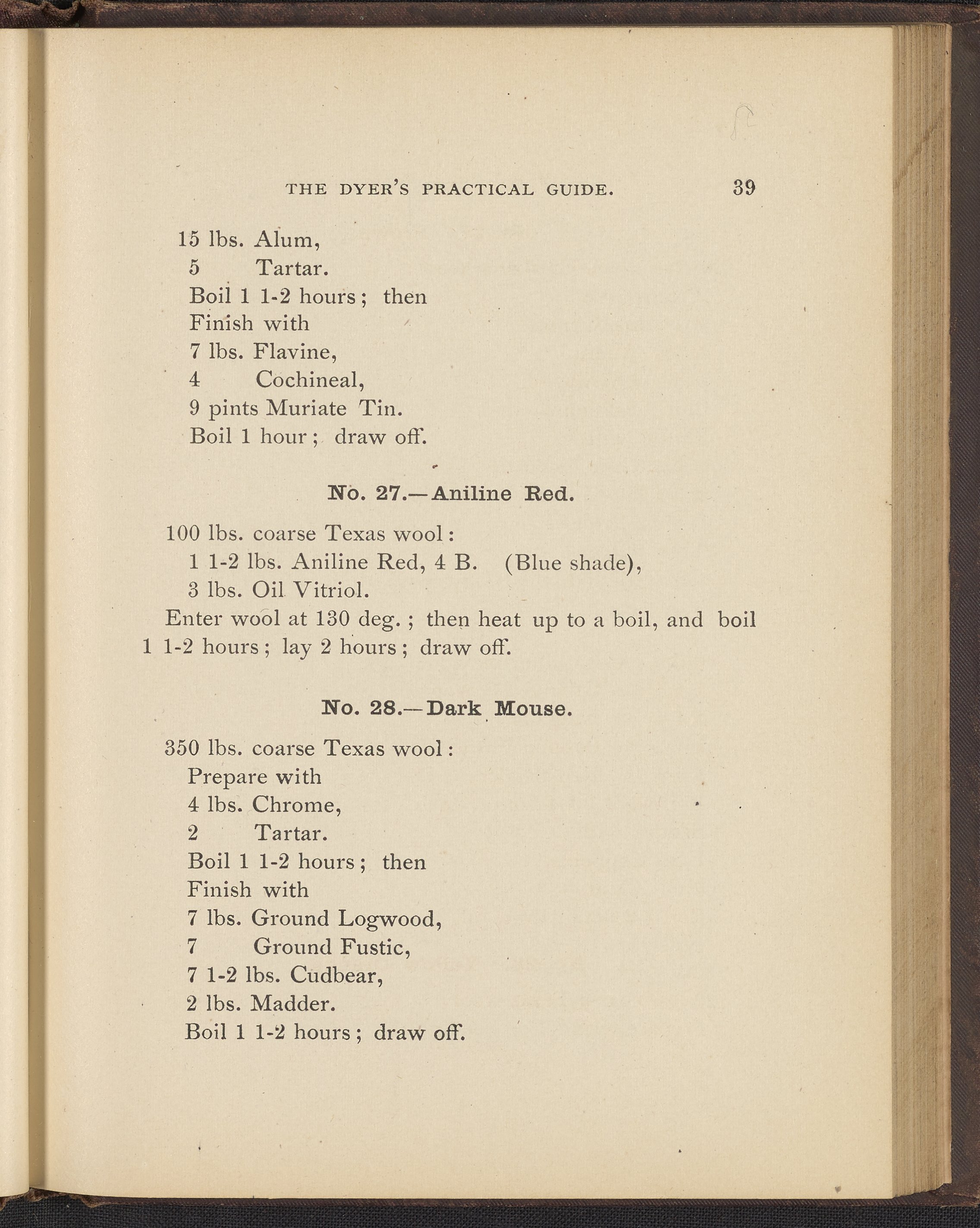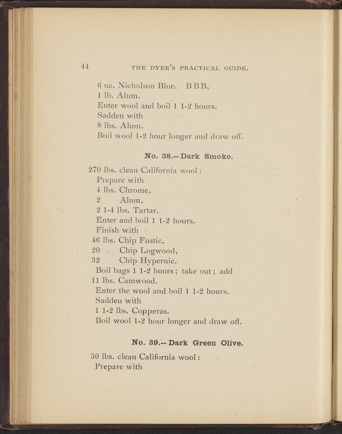 Small JPG1200 x 1496px — 493 KBFull-sized JPG2356 x 2937px — 1.7 MBOriginal fileTIFF — 2356 x 2937px — 19.8 MBTreatise containing "practical knowledge" on dyeing for manufacturers, with sections on mordants, chemicals used in dyeing, wool scouring, extracting cotton from wool, and 253 dye recipes for wool, cotton, and shoddy (recycled wool).