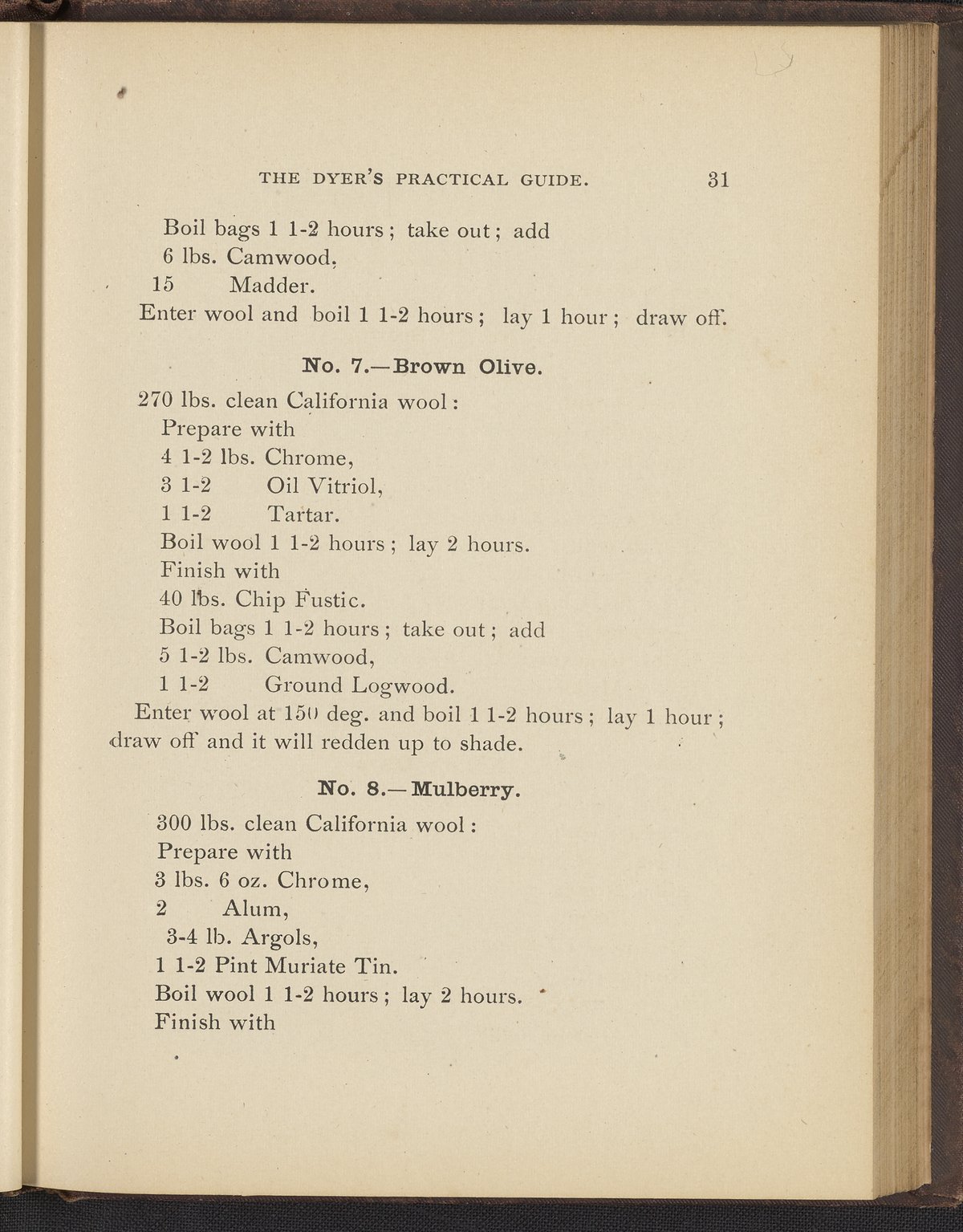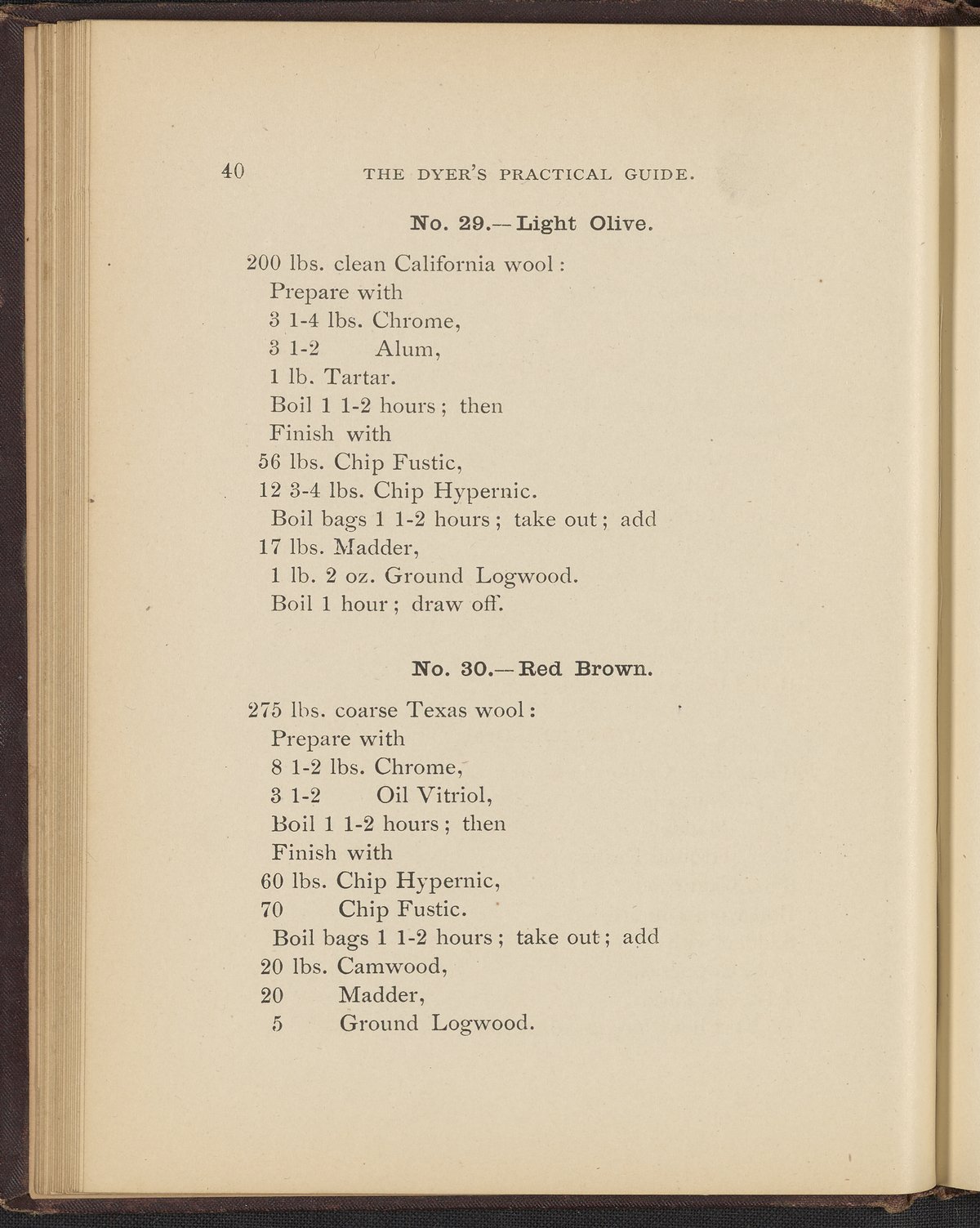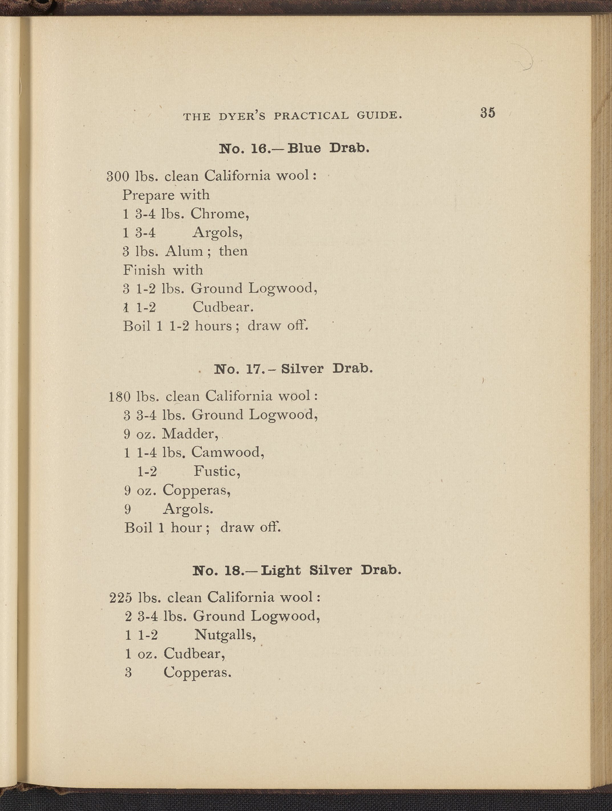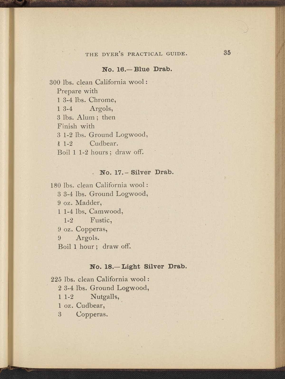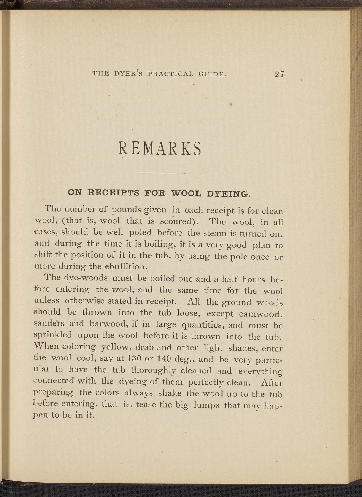 Small JPG1200 x 1496px — 493 KBFull-sized JPG2356 x 2937px — 1.7 MBOriginal fileTIFF — 2356 x 2937px — 19.8 MBTreatise containing "practical knowledge" on dyeing for manufacturers, with sections on mordants, chemicals used in dyeing, wool scouring, extracting cotton from wool, and 253 dye recipes for wool, cotton, and shoddy (recycled wool).