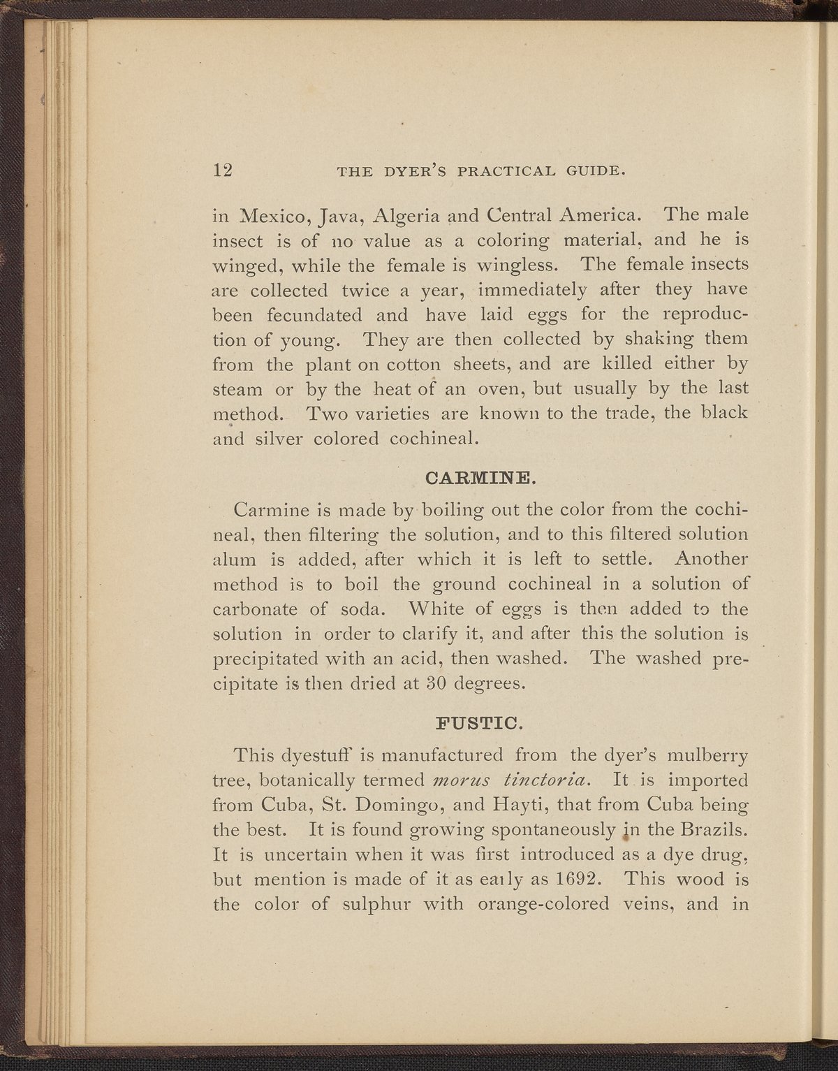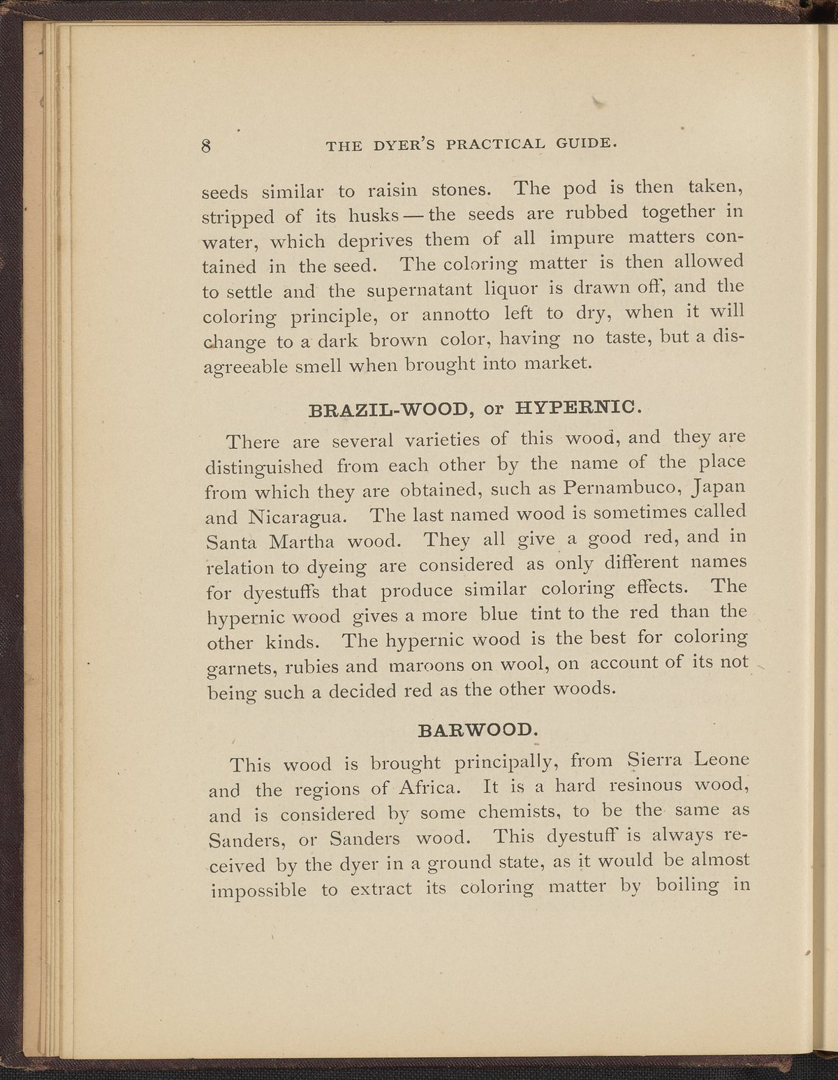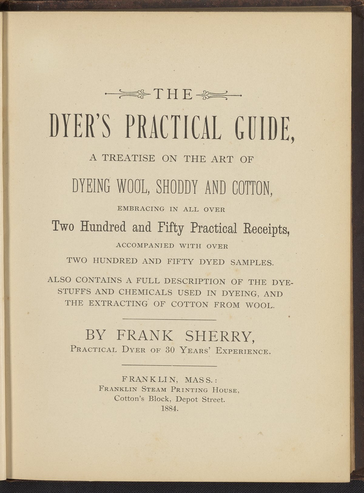 Sherry, Frank. “The Dyer's Practical Guide : A Treatise on the Art of Dyeing Wool, Shoddy and Cotton.” Franklin, Massachusetts: Franklin Steam Printing House, 1884. TP897 .S54 1884. Science History Institute. Philadelphia. https://digital.sciencehistory.org/works/aznpi7s.