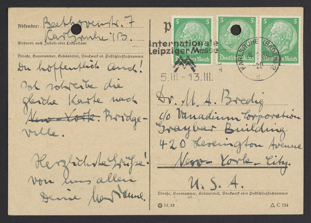 Homburger, Marianne. “Postcard from Marianne Homburger to Max Bredig, January 24, 1939,” January 24, 1939. Papers of Georg and Max Bredig, Box 8, Folder 18. Science History Institute. Philadelphia. https://digital.sciencehistory.org/works/b18qbcw.