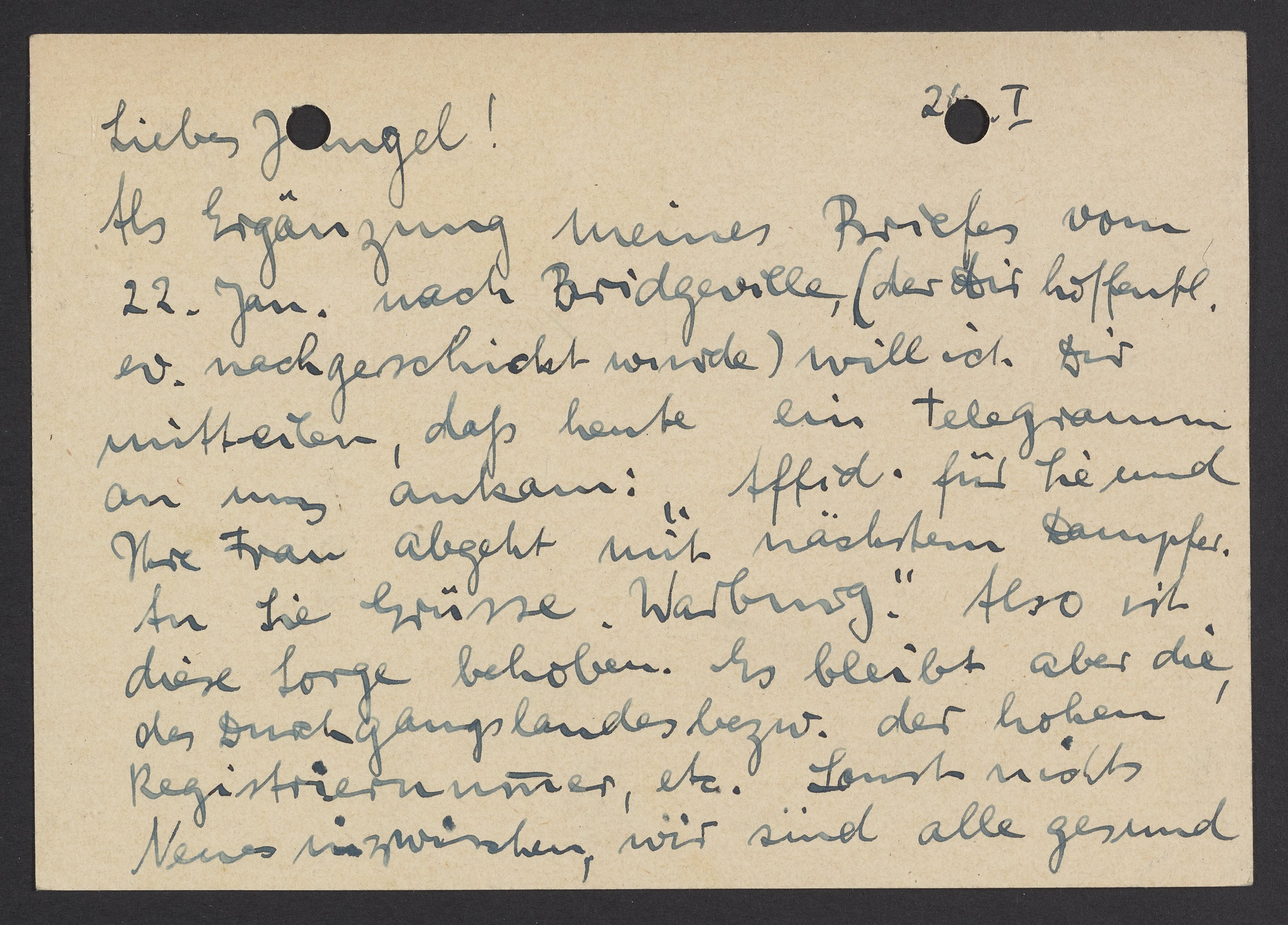 Als Ergänzung meines Briefes vom 22. Jan. nach Bridgeville (der der hoffentlich nachgeschickt wurde) will ich Dir mitteilen, daß heute ein Telegramm an uns ankam: „Affid. für Sie und Ihre Frau abgeht mit nächstem Dampfer. An Sie Grüsse. Warburg.“ Also ist diese Sorge behoben. Es bleibt aber die, des Durchganglandes bezw. der hohen Registriernummer etc. sonst nichts Neues inzwischen. Wir sind alle gesund