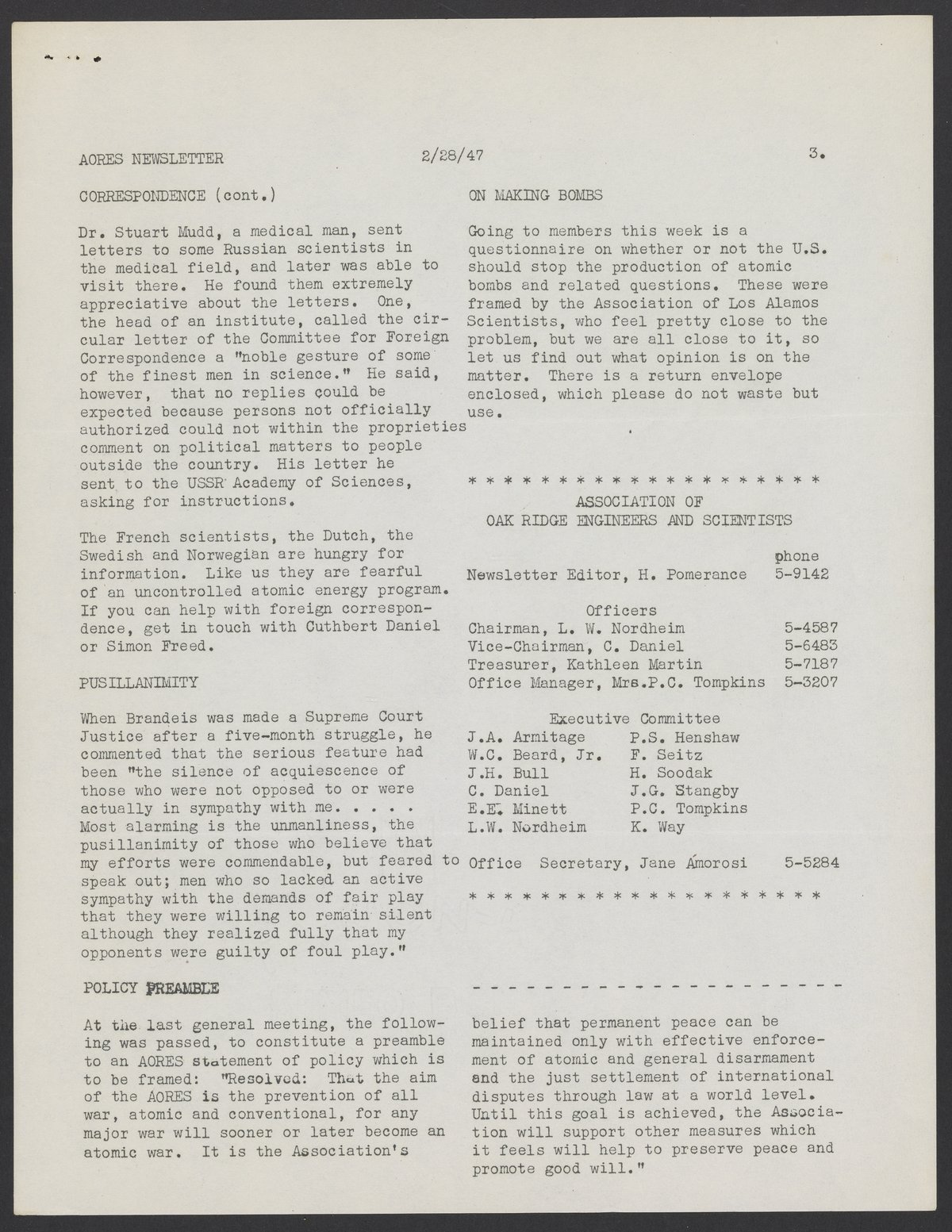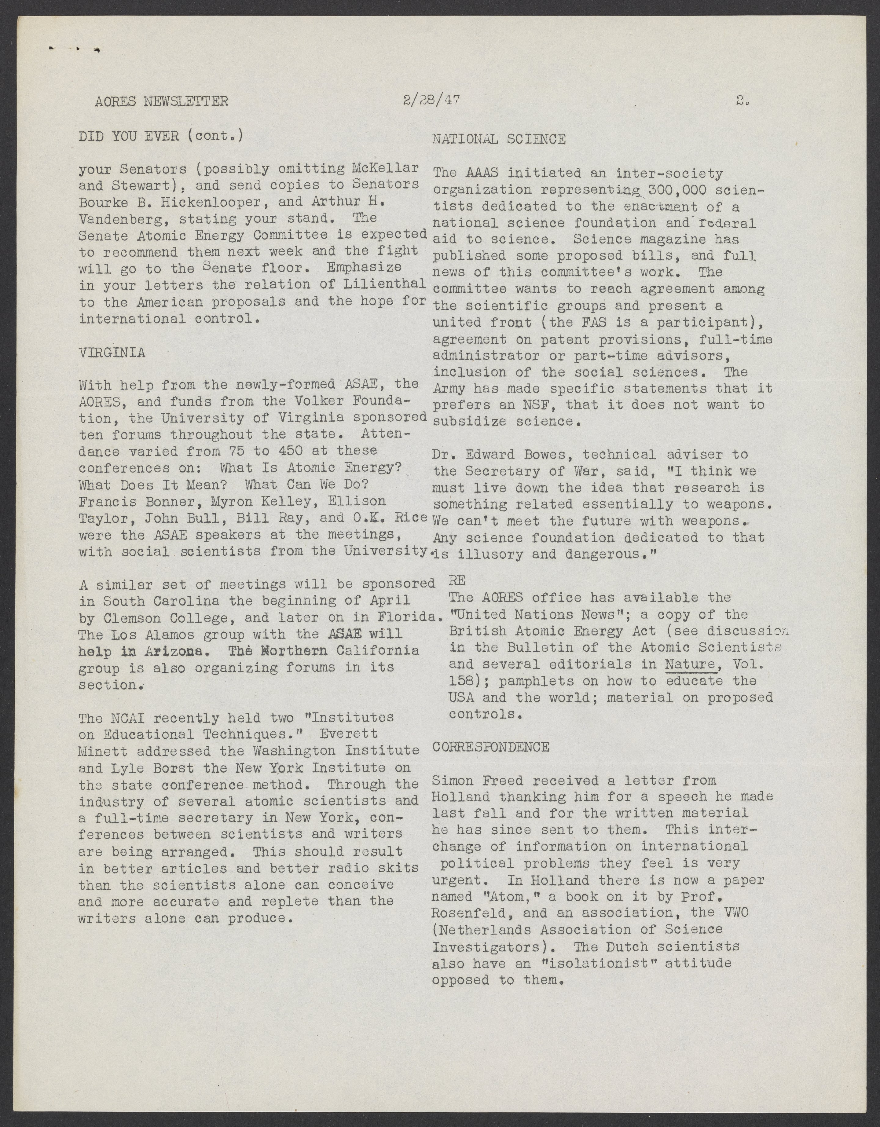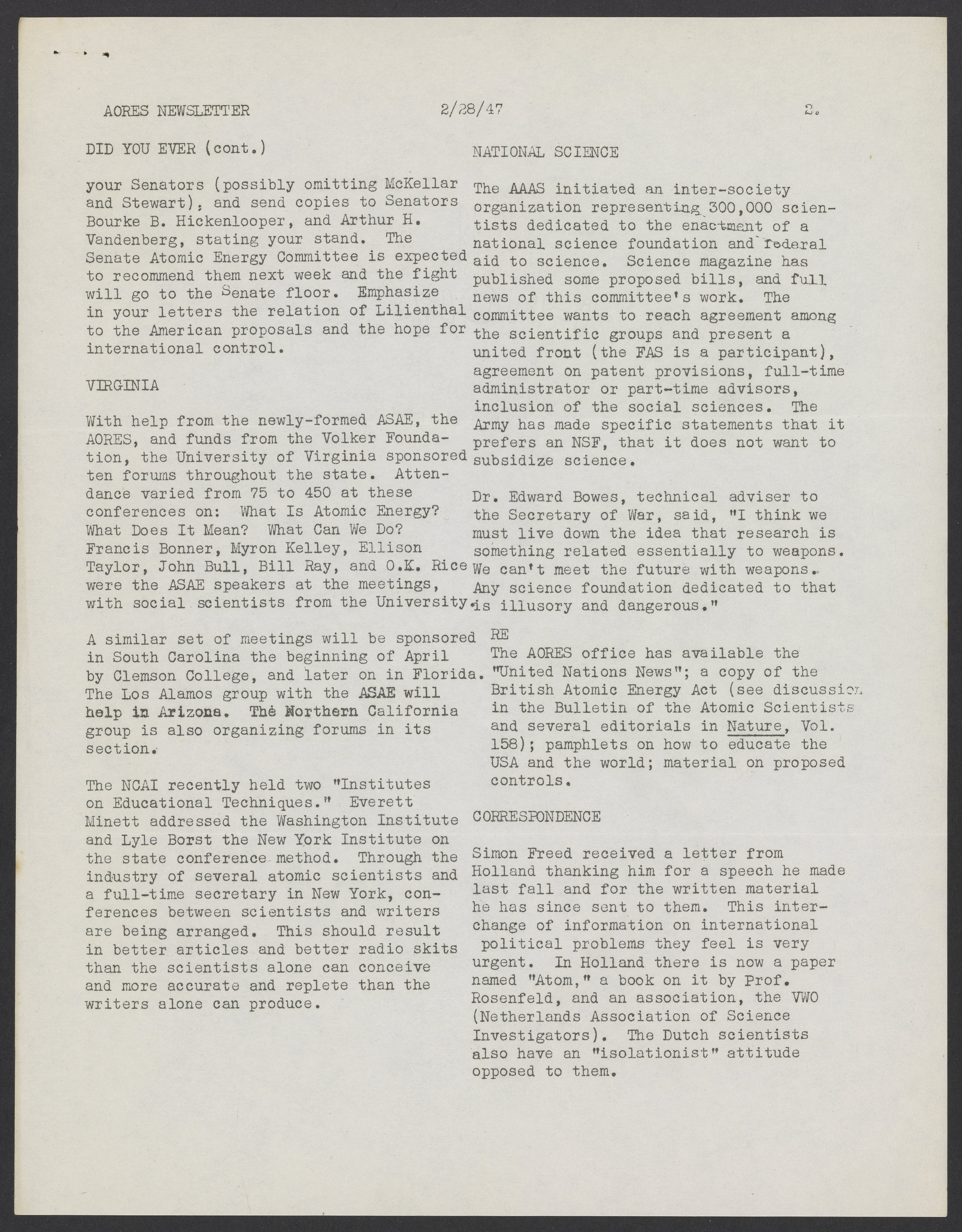 Newsletter for the Association of Oak Ridge Engineers and Scientists (AORES), February 28, 1947