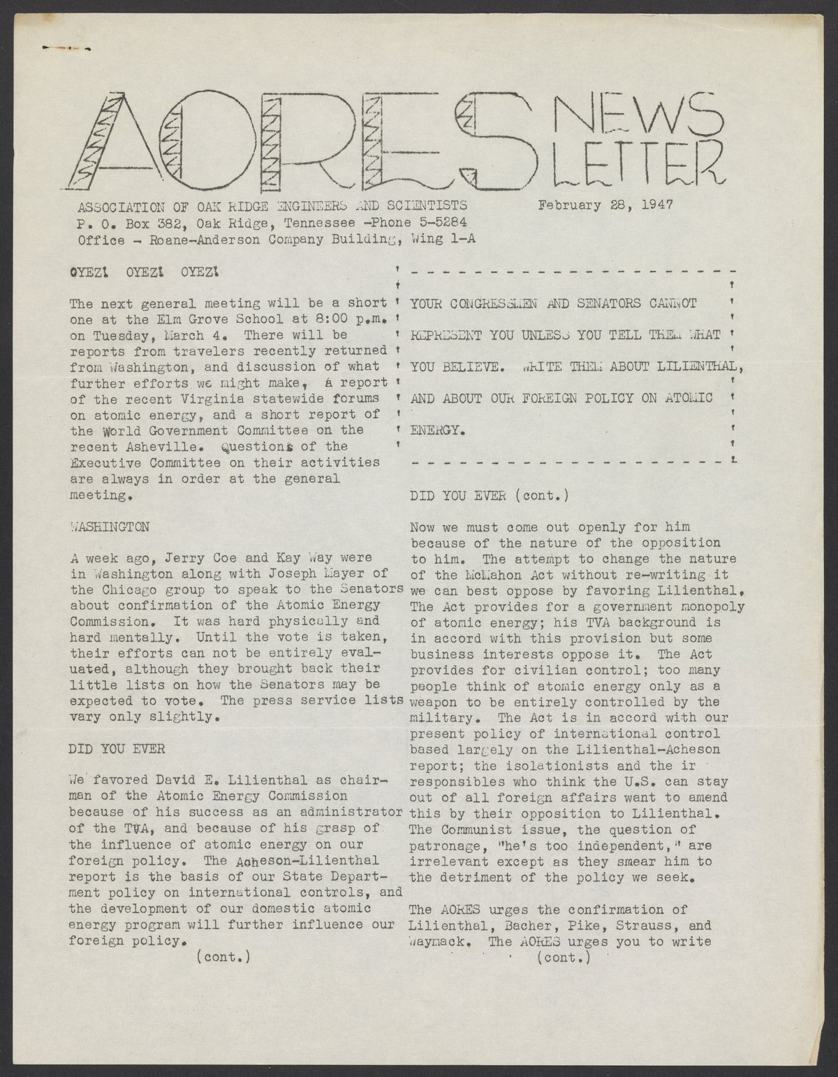 Newsletter for the Association of Oak Ridge Engineers and Scientists (AORES), February 28, 1947