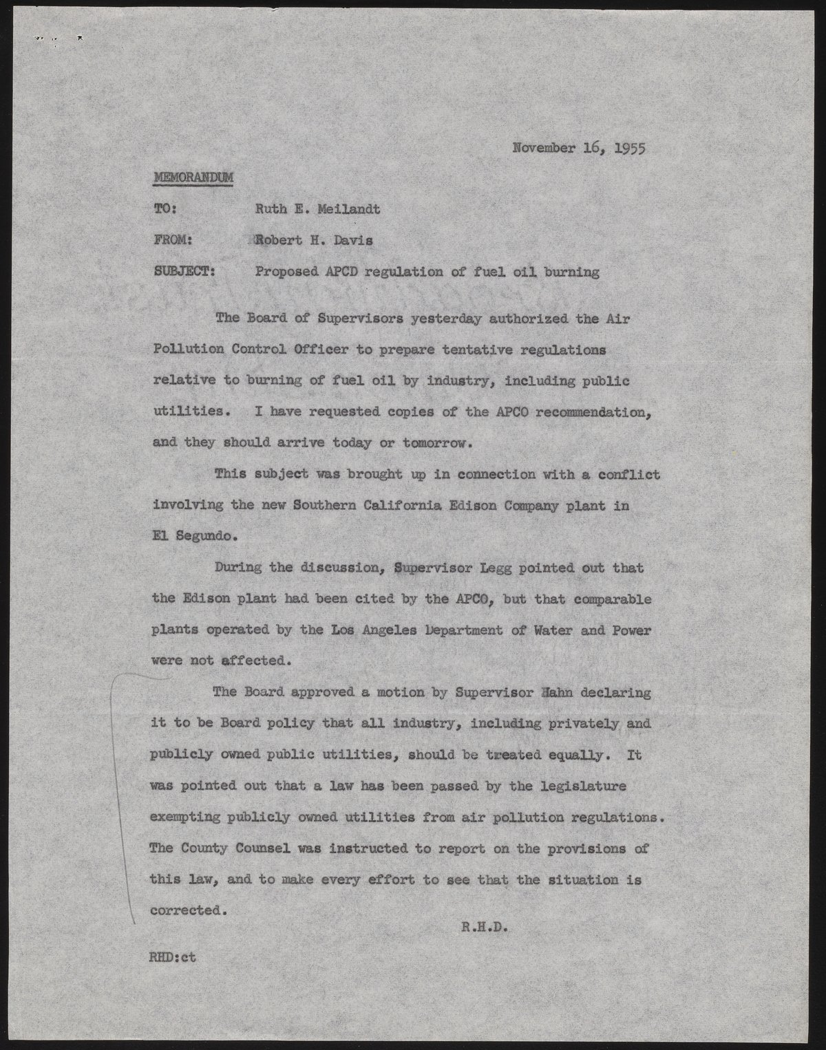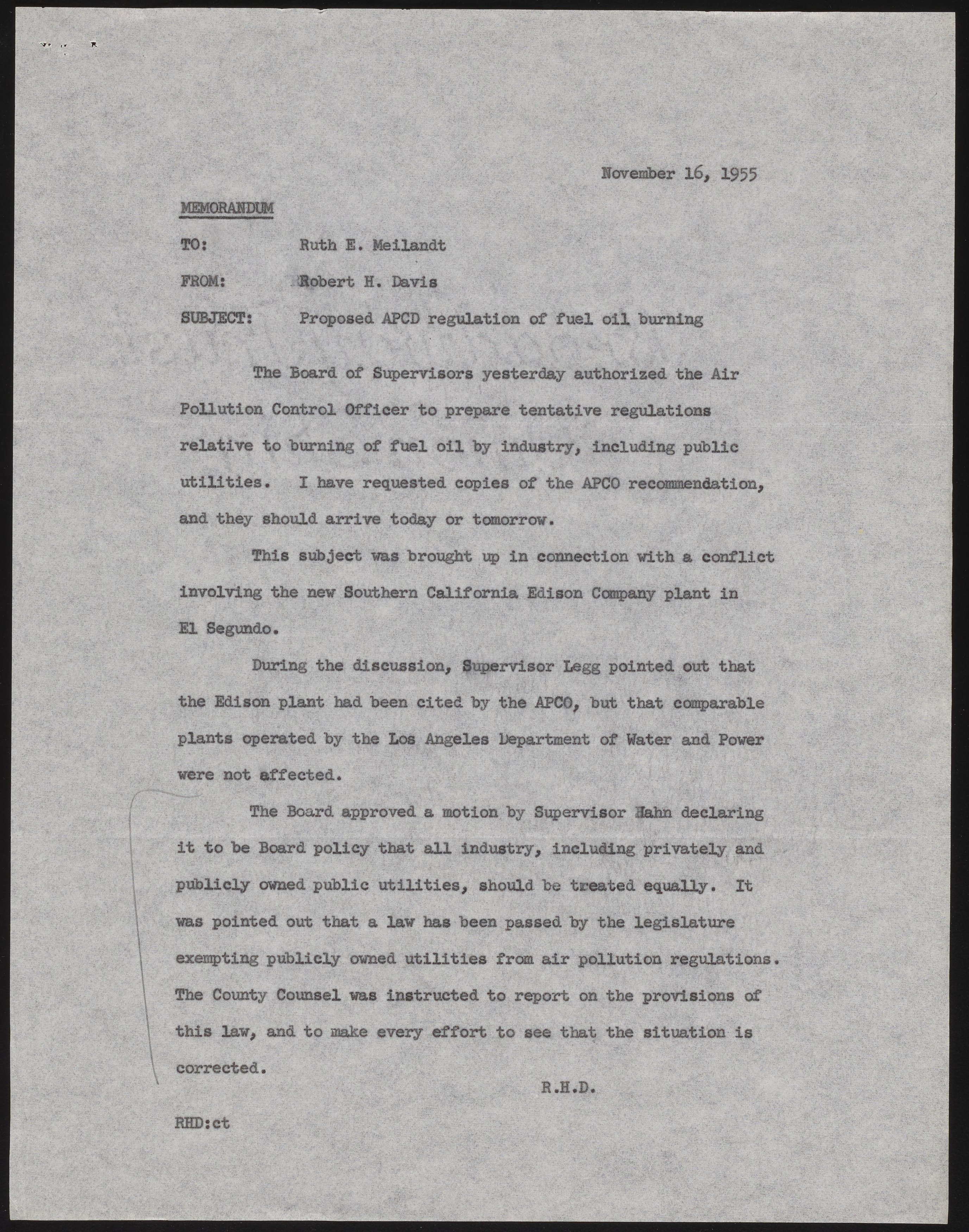 Memo regarding proposed Air Pollution Control District regulation of fuel oil burning by industrial facilities. Robert H. Davis points out that publicly owned utilities are not being given the same scrutiny as privately owned companies.