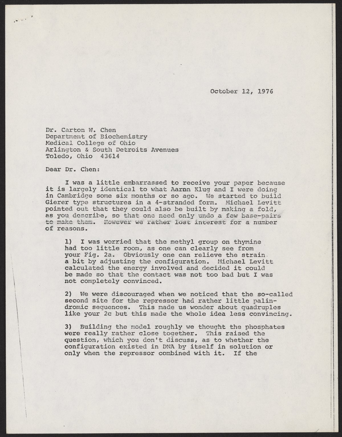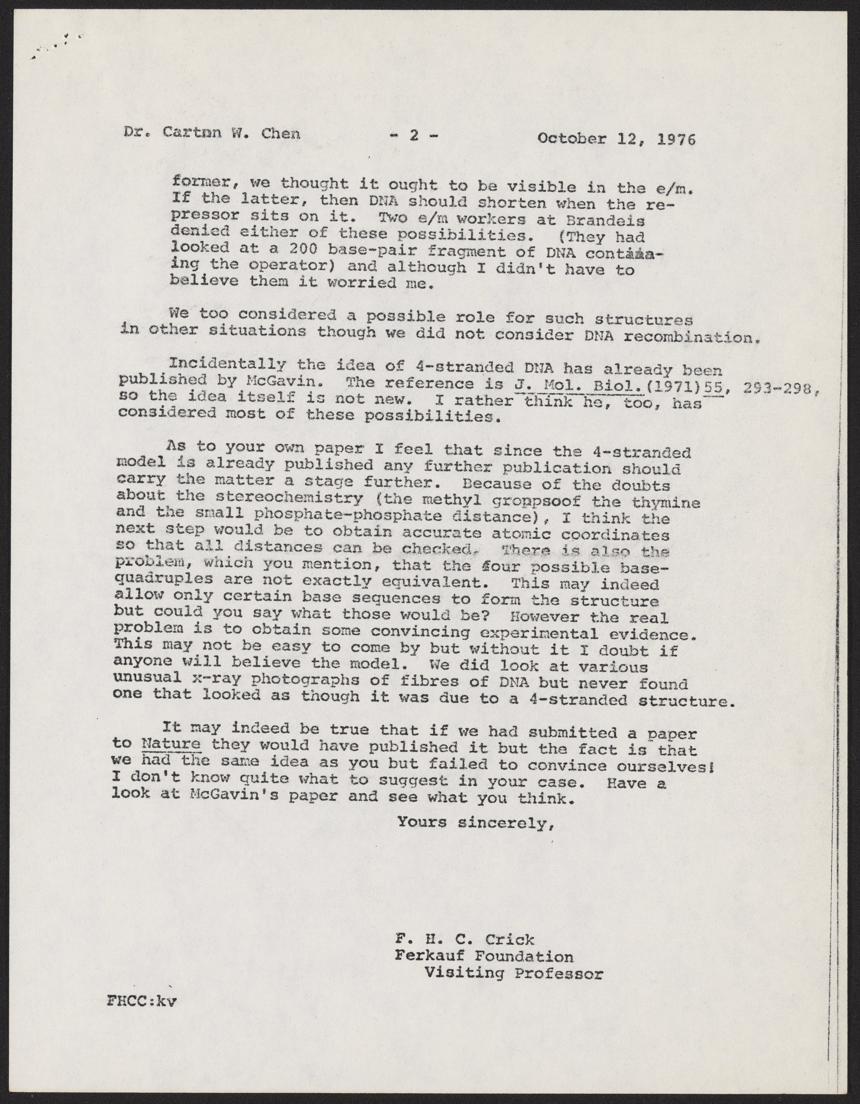 Crick, Francis. “Letter from Francis Crick to Carton W. Chen, October 12, 1976,” October 12, 1976. History of Molecular Biology Collection, Box 19, Folder 25. Science History Institute. Philadelphia. https://digital.sciencehistory.org/works/b87nkgf.