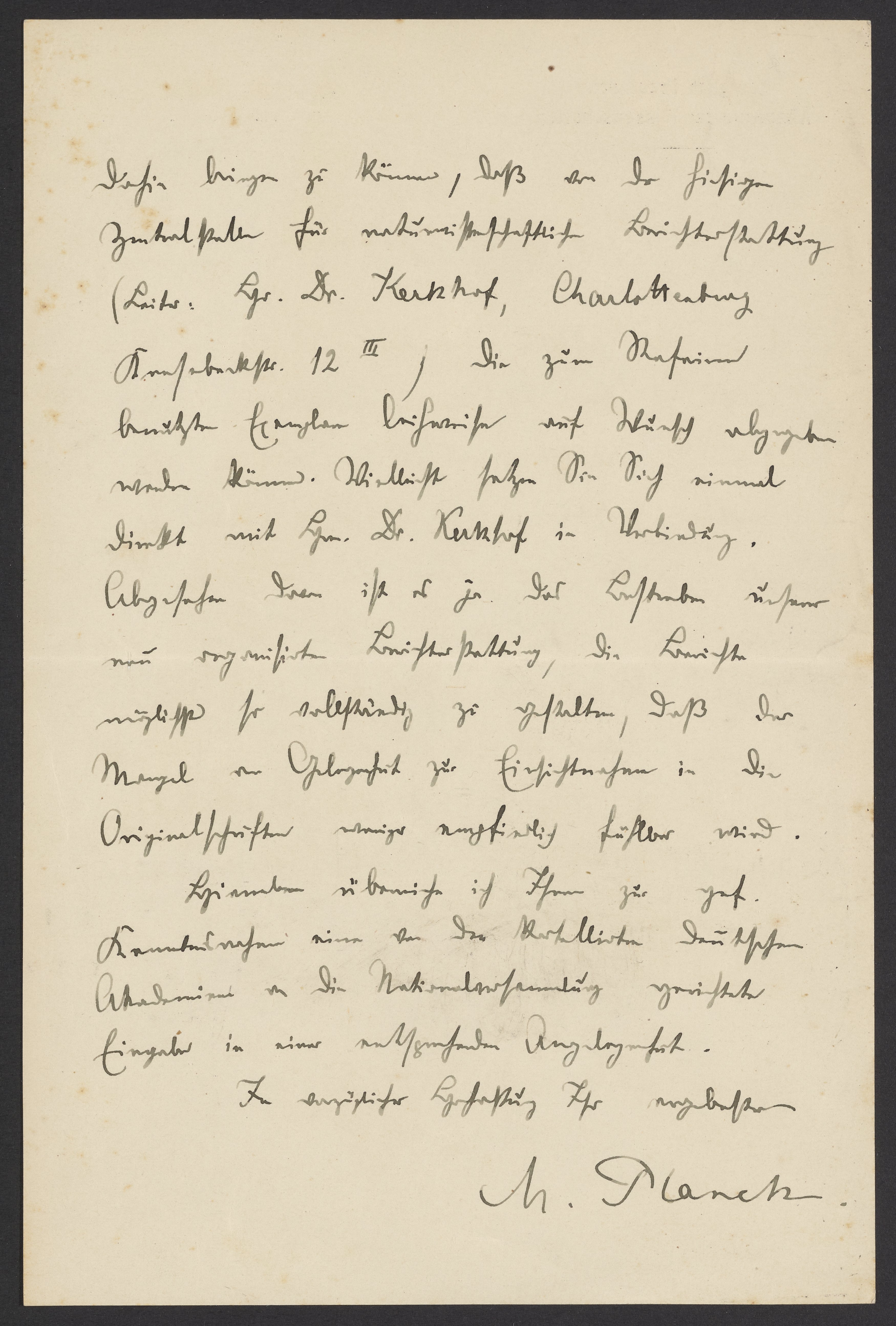 Small JPG1200 x 1786px — 276 KBLarge JPG2880 x 4287px — 1.5 MBFull-sized JPG3480 x 5180px — 2.1 MBOriginal fileTIFF — 3480 x 5180px — 51.6 MBMax Planck (1858-1947), a German theoretical physicist who won the 1918 Nobel Prize in Physics for discovering energy quanta, informs Georg Bredig (1868-1944) of a new lending service for foreign language scientific journals at the Central Office for Scientific Reporting.