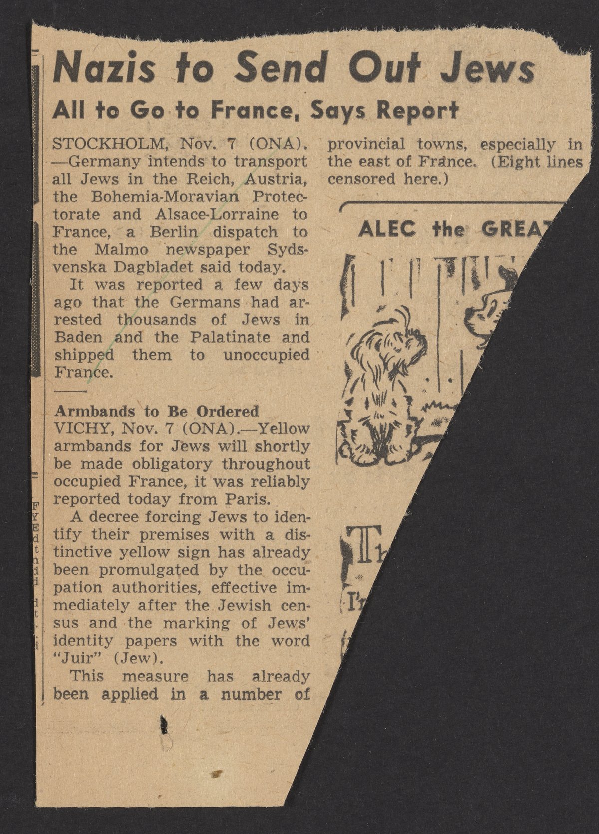 Newspaper clipping featuring articles stating that Germany intends to transport all Jewish people to unoccupied France. The second article states that in occupied France Jewish people will be forced to wear yellow armbands and their identity papers will have to have the word "Juir" (Jew) on them.