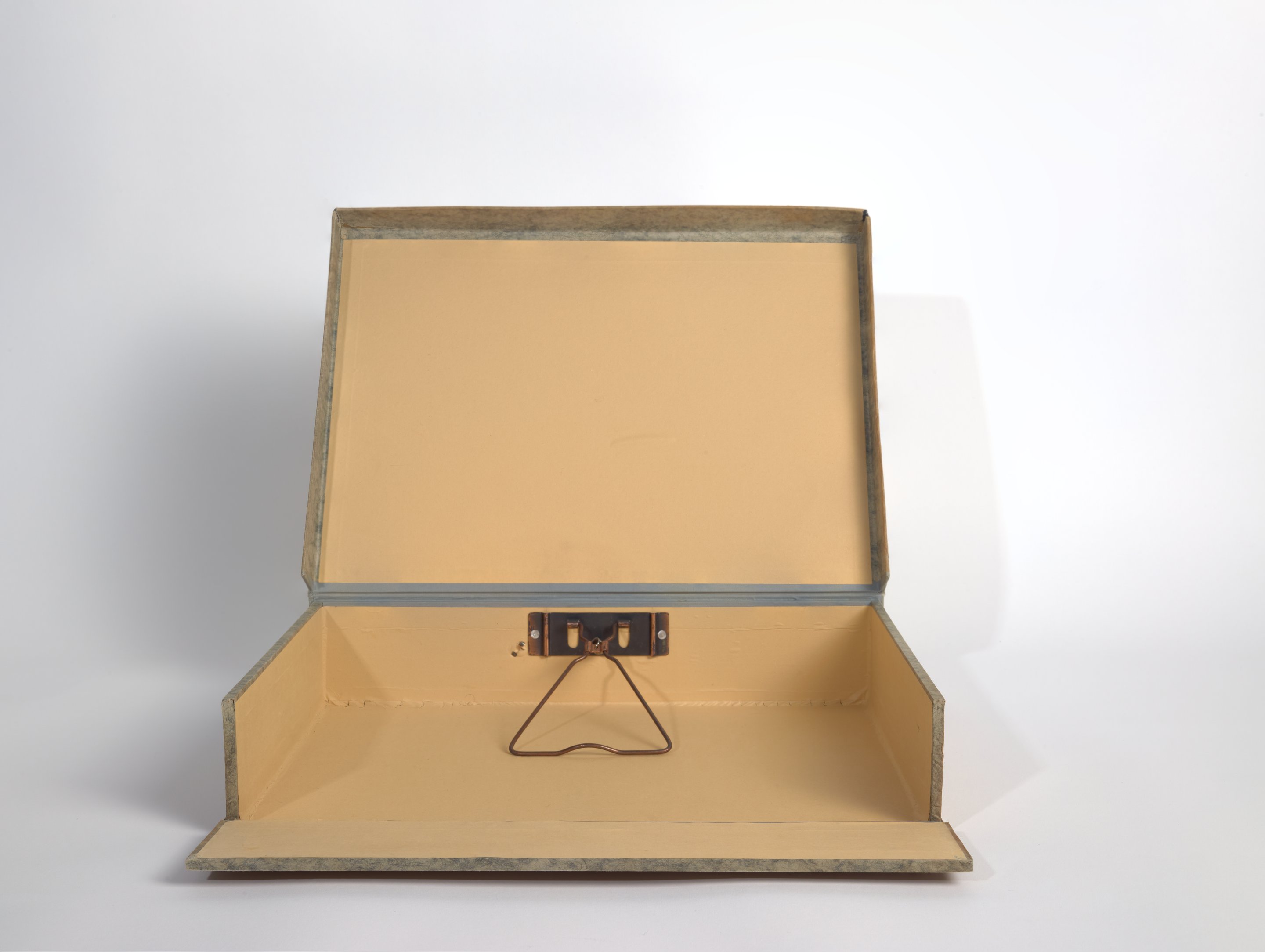 The file box has a gray-blue fabric spine with a leather pull. Inside, it is lined with yellow paper and has a spring-loaded mechanism to keep contents in place. "Foolscap" refers to a standard size of paper, 8 x 13 inches.