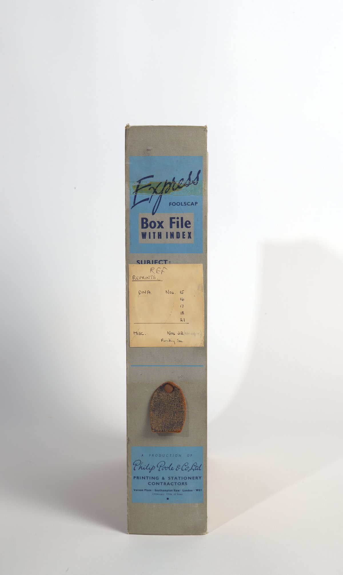 Small JPG1200 x 1664px — 207 KBLarge JPG2880 x 3994px — 975 KBFull-sized JPG4606 x 6387px — 2.2 MBOriginal fileTIFF — 4606 x 6387px — 168 MBFile box belonging to Rosalind Franklin (1920-1958). The box is labeled "REF Reprints. DNA Nos. 15, 16, 17, 18, 21. Misc. Nos 32 (no copies) Faraday Soc."