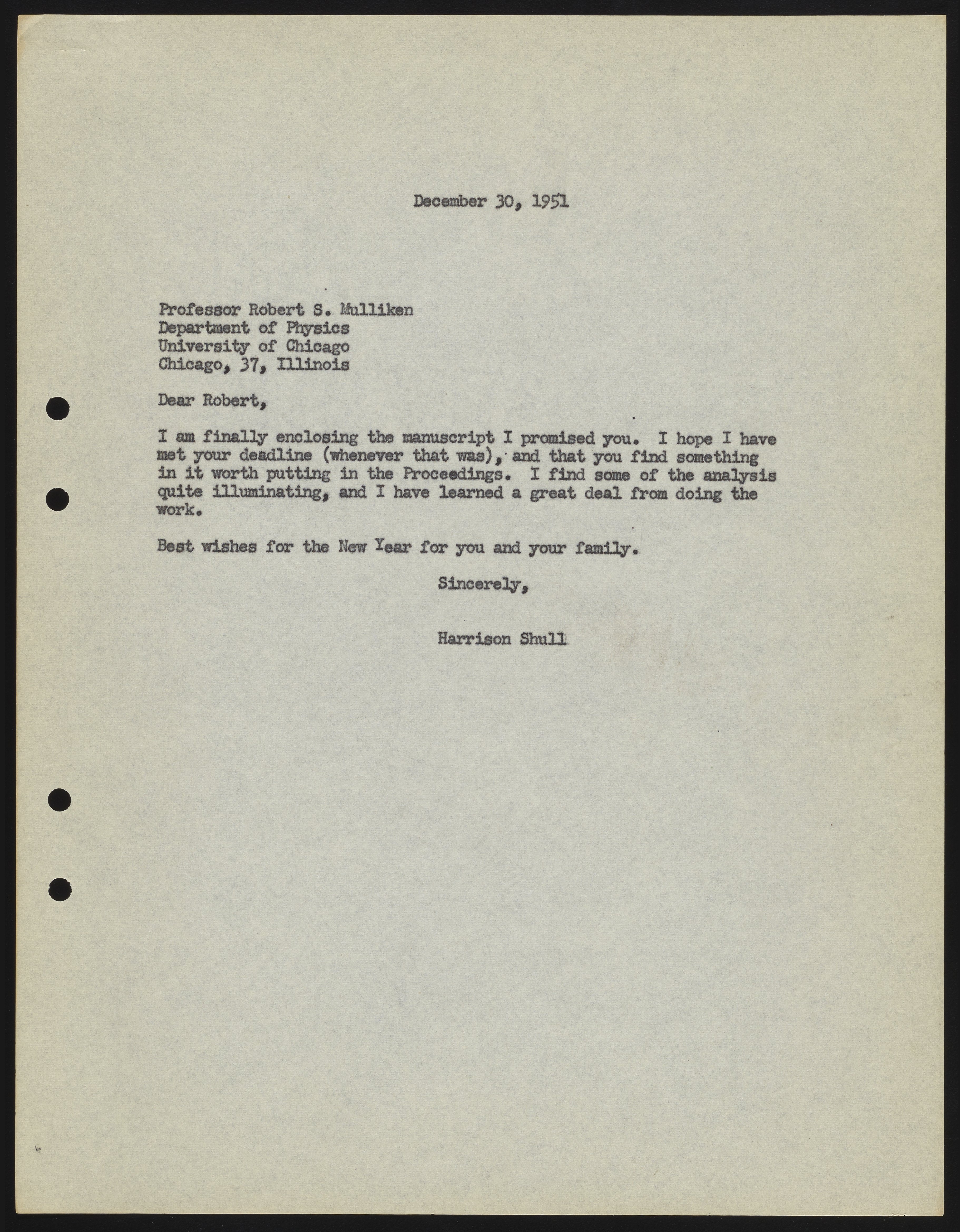 Shull, Harrison. “Letter from Harrison Shull to Robert S. Mulliken, 1951,” December 30, 1951. Robert S. Mulliken & Harrison Shull Correspondence, Box 1. Science History Institute. Philadelphia. https://digital.sciencehistory.org/works/bc386j278.