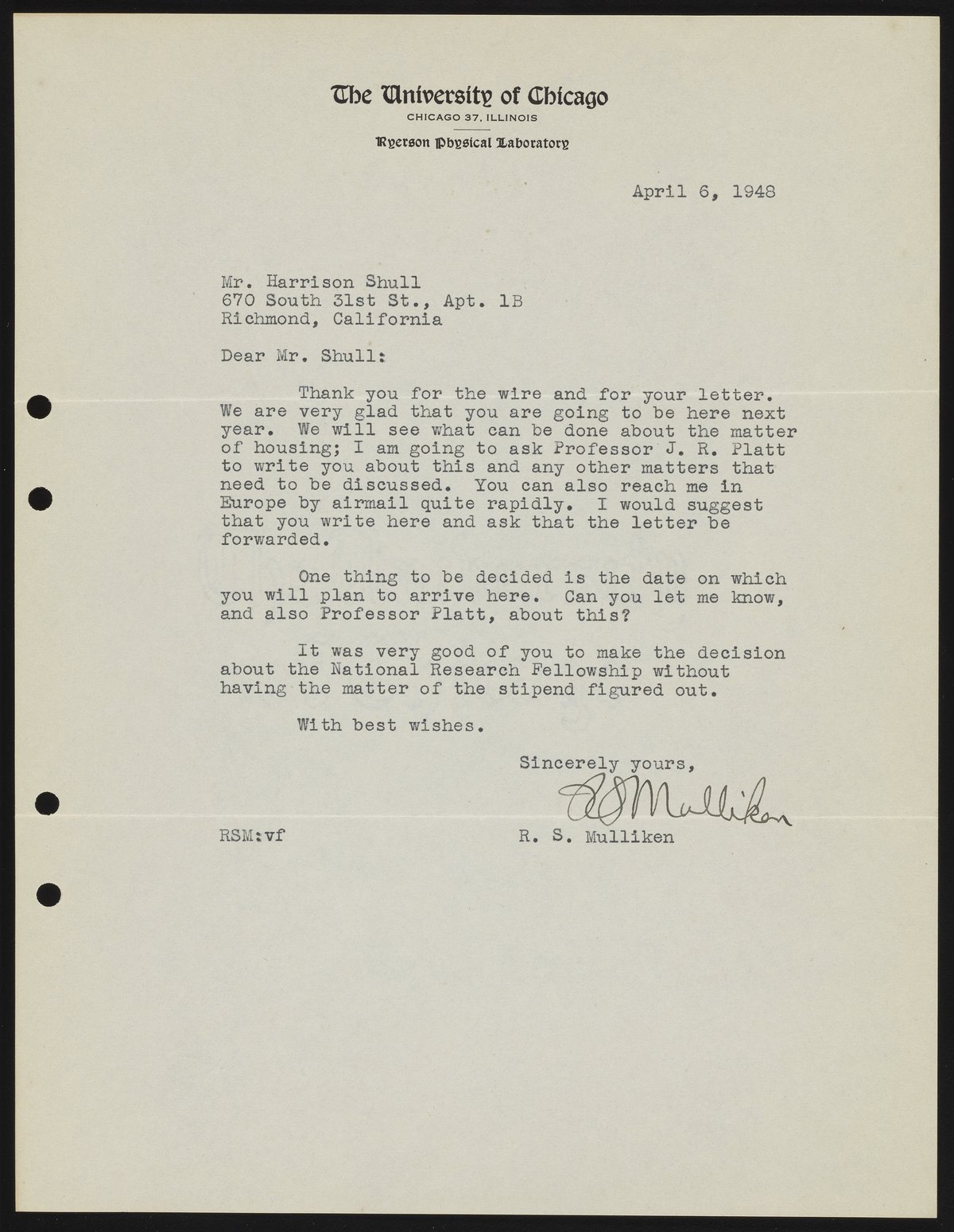 Mulliken, Robert Sanderson. “Letter from Robert S. Mulliken to Harrison Shull, 1948,” April 6, 1948. Robert S. Mulliken & Harrison Shull Correspondence, Box 1. Science History Institute. Philadelphia. https://digital.sciencehistory.org/works/bg257f160.