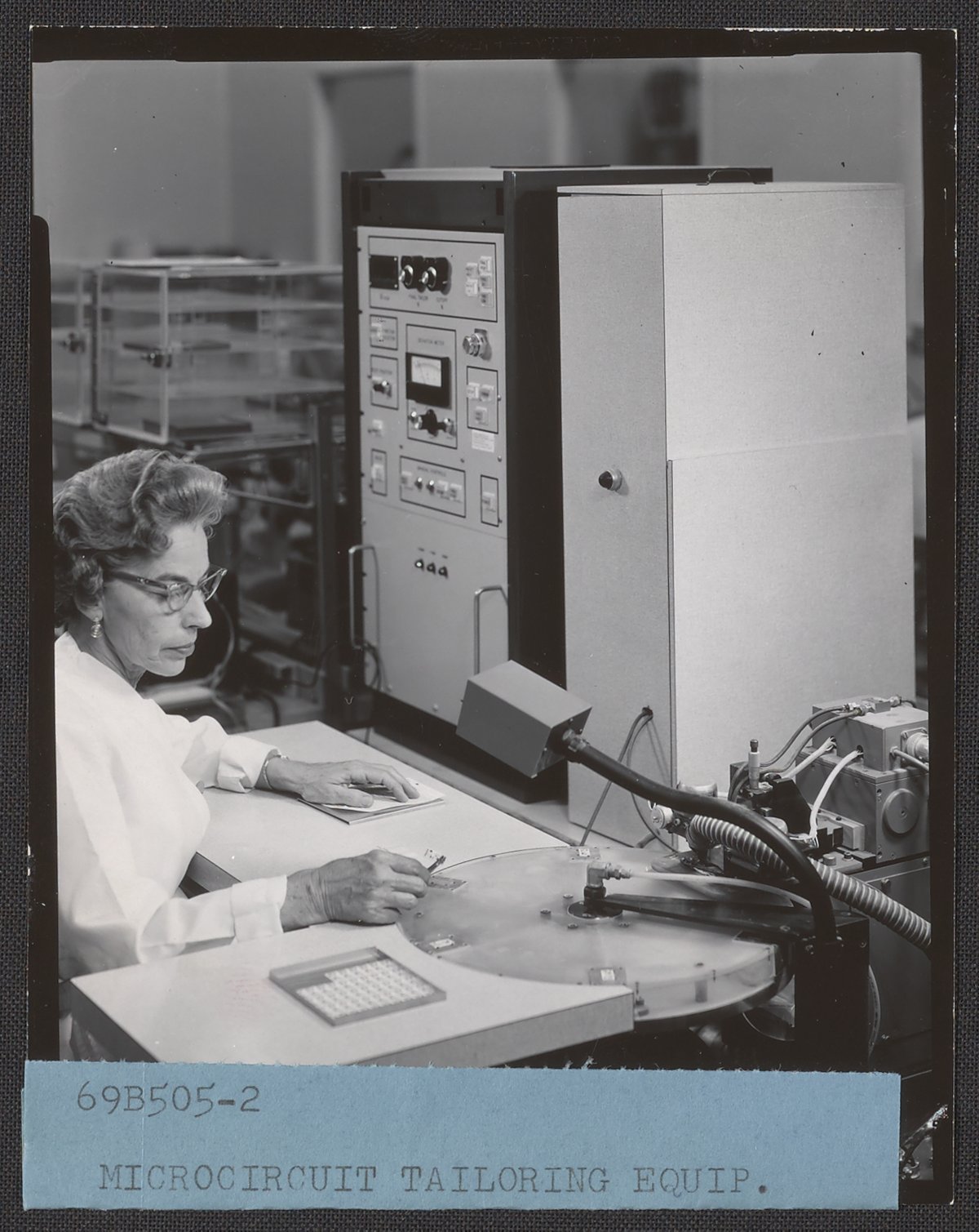 Beckman Instruments Photographic Services Section. “Woman Using Microcircuit Tailoring Equipment,” 1960–1969. Beckman Historical Collection, Box 85. Science History Institute. Philadelphia. https://digital.sciencehistory.org/works/bk128b23n.