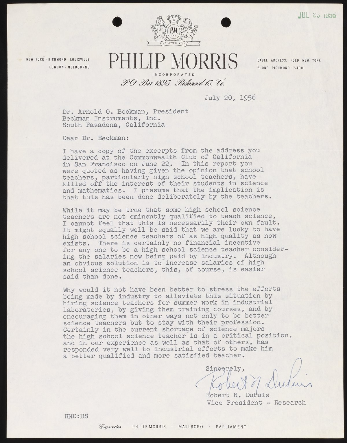 This is one of many letters written to Arnold Beckman in response to his speech on the topic of education. Robert DuPuis, a vice president of Philip Morris, suggests that improved salaries and industry-sponsored training courses might improve the quality of science teachers.