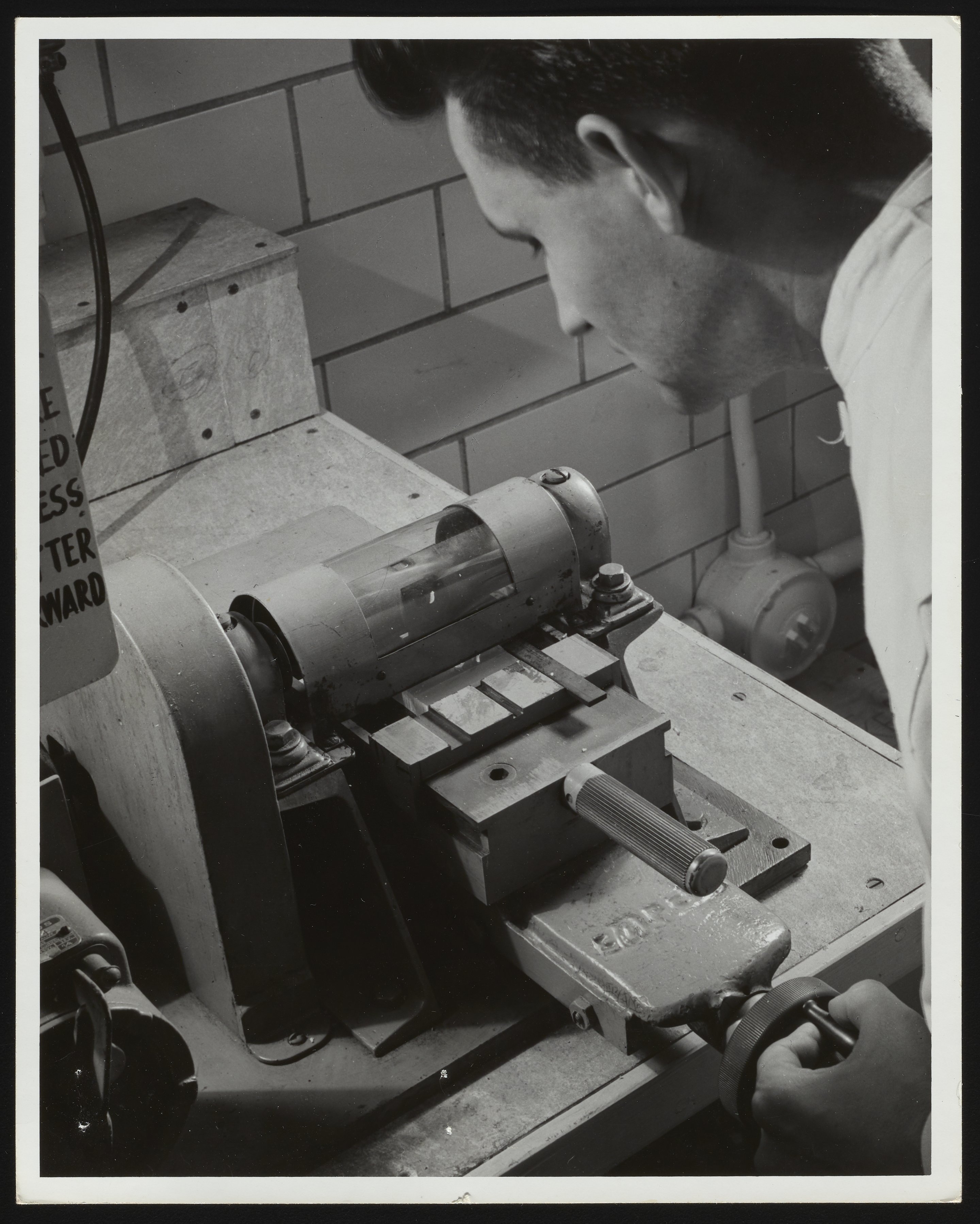 Close-up view of J.P. Drew operating a milling cutter used in the Plastics Laboratory at the Hercules Powder Company plant in Parlin, New Jersey. Per notations accompanying the photograph, the cutter was used to cut notches of uniform depth and cross-section into test specimens used to test the impact resistance of plastics made from the raw materials manufactured at the plant. The Parlin plant commonly produced ethyl cellulose, nitrocellulose, and cellulose acetate, which were purchased by a variety of public and private industries as a raw material for use in plastics, films, lacquers, and other materials.