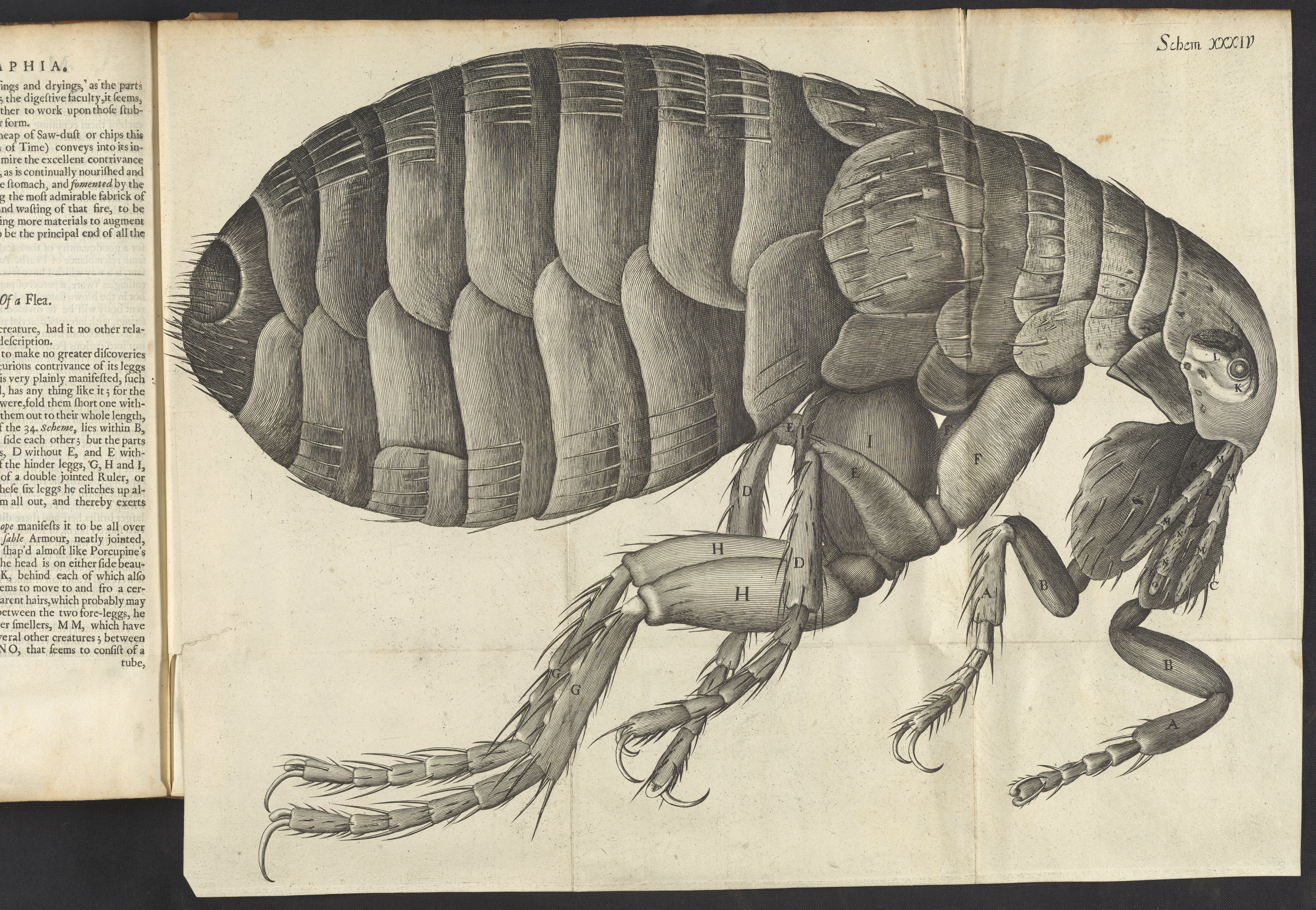 Hooke, Robert. “Microscopic View of a Flea.” In Micrographia : or, Some Physiological Descriptions of Minute Bodies Made by Magnifying Glasses. With Observations and Inquiries Thereupon. London, England: J. Martyn, 1665. https://digital.sciencehistory.org/works/bk128c17q.