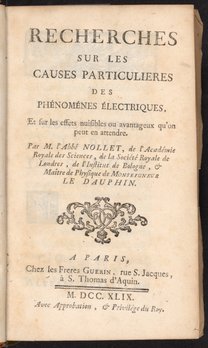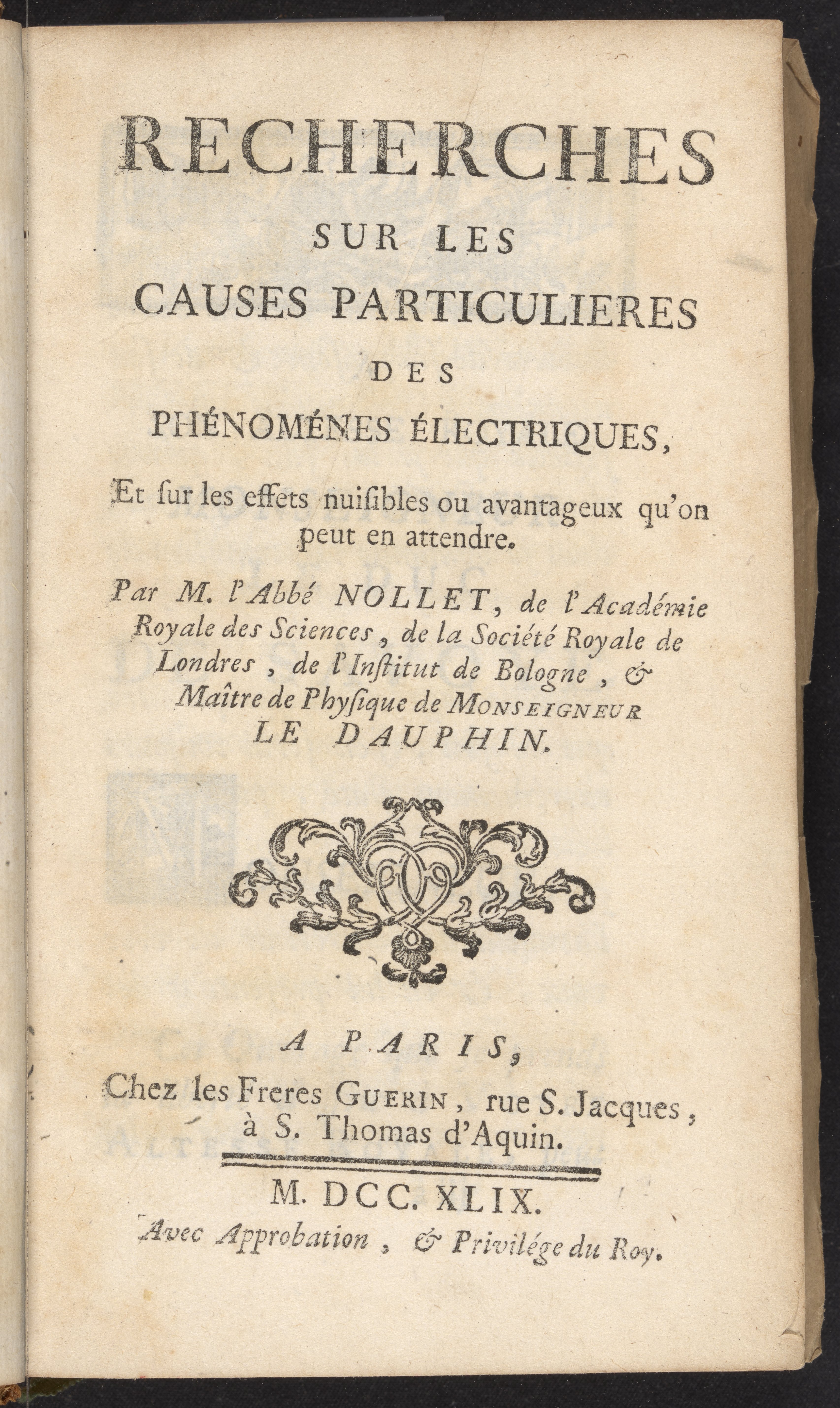 Nollet, abbé (Jean Antoine). Recherches Sur Les Causes Particulieres Des Phénoménes Électriques. Frères Guérin, 1749. https://digital.sciencehistory.org/works/bkaqr7q.