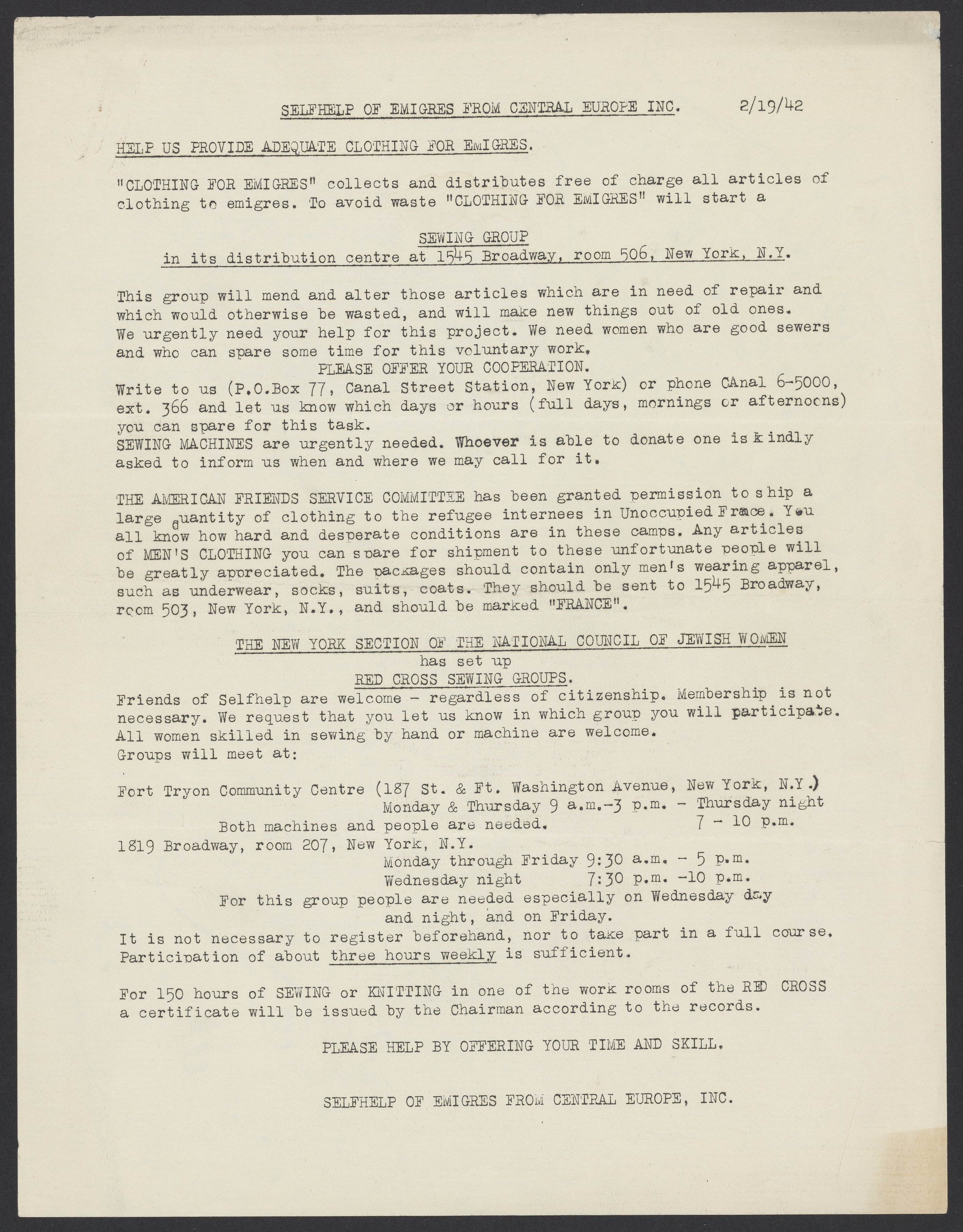 Small JPG1200 x 1535px — 313 KBLarge JPG2880 x 3682px — 1.6 MBFull-sized JPG5369 x 6865px — 5.4 MBOriginal fileTIFF — 5369 x 6865px — 106 MBSelfhelp of Emigres from Central Europe, Inc. was founded in 1936 by German Jews in New York to support new immigrants fleeing persecution in Nazi-occupied Europe. Today, the foundation still exists as Selfhelp Community Services. This February 1942 newsletter contains a call for participation in sewing groups, as many incoming refugees are in need of clothing.