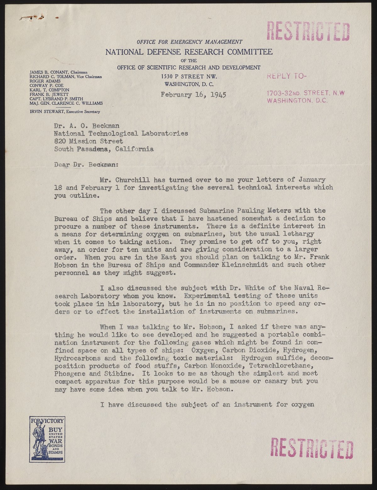 Small JPG1200 x 1559px — 354 KBFull-sized JPG2498 x 3246px — 1.3 MBOriginal fileTIFF — 2498 x 3246px — 23.3 MBThe letter regards the procurement of Pauling meters for use on submarines and issues of cost and portability.
