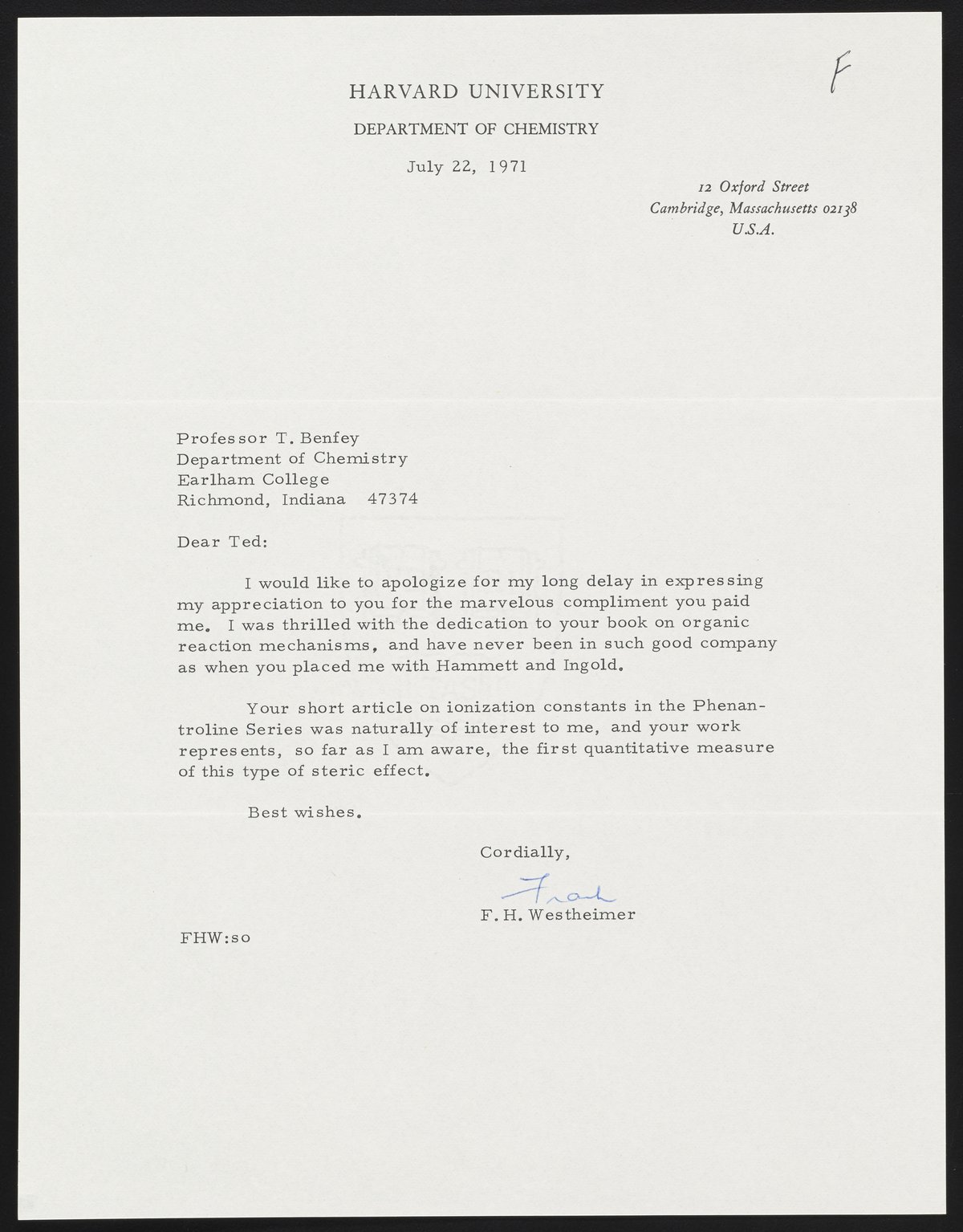 Letter from Frank H. Westheimer to Theodore Benfey