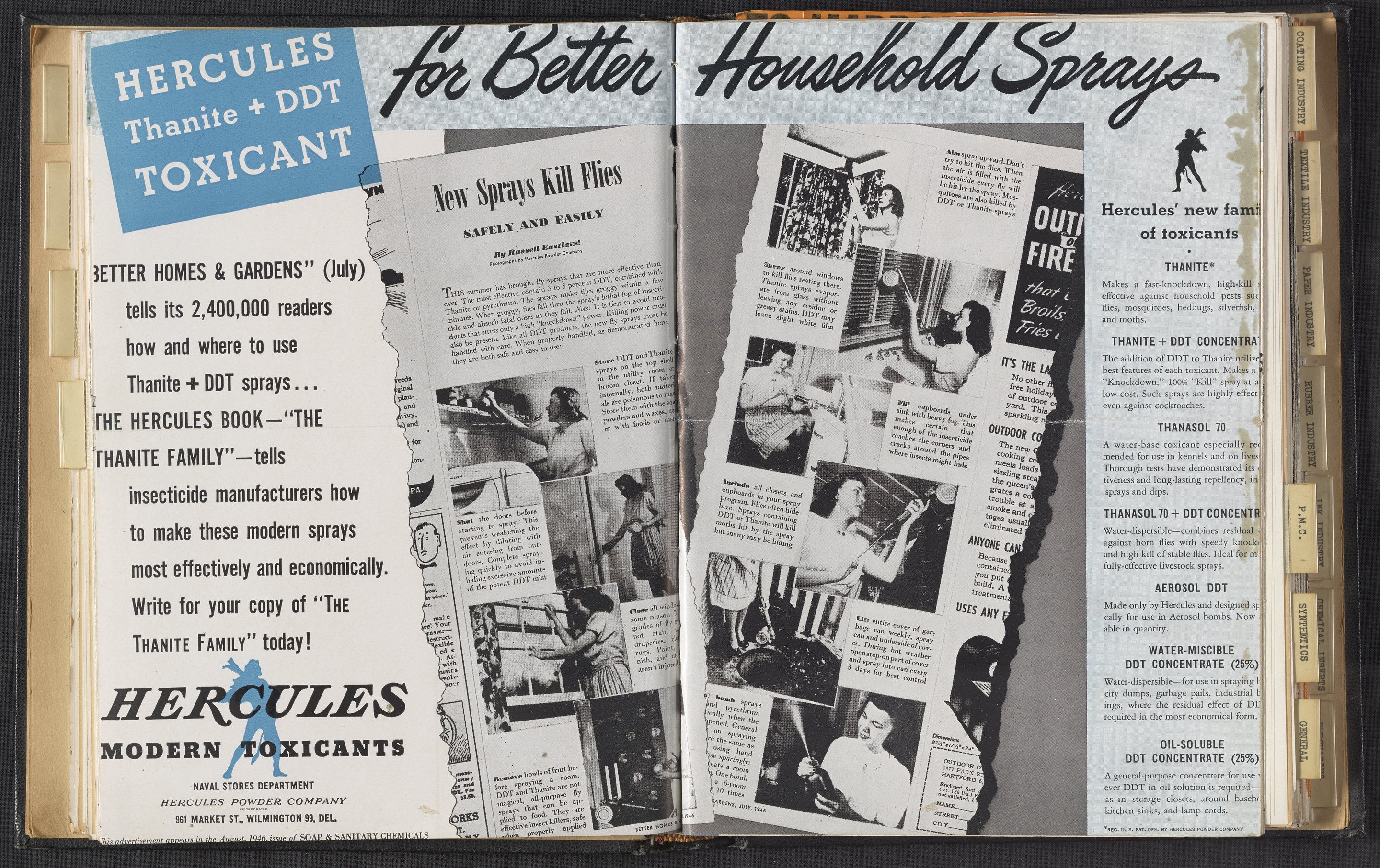 Three-page brochure advertising toxicants, including Thanite and Thanasol, manufactured and sold by the Hercules Powder Company for use in the manufacture of household insecticide sprays. Formed in 1912 as part of an anti-trust settlement with DuPont, the Hercules Powder Company (later Hercules Inc.) initially specialized in the manufacture of explosives and smokeless powders and subsequently diversified its business to encompass a variety of industrial products, including pine and paper chemicals, synthetics, pigments, polymers, and cellulose.