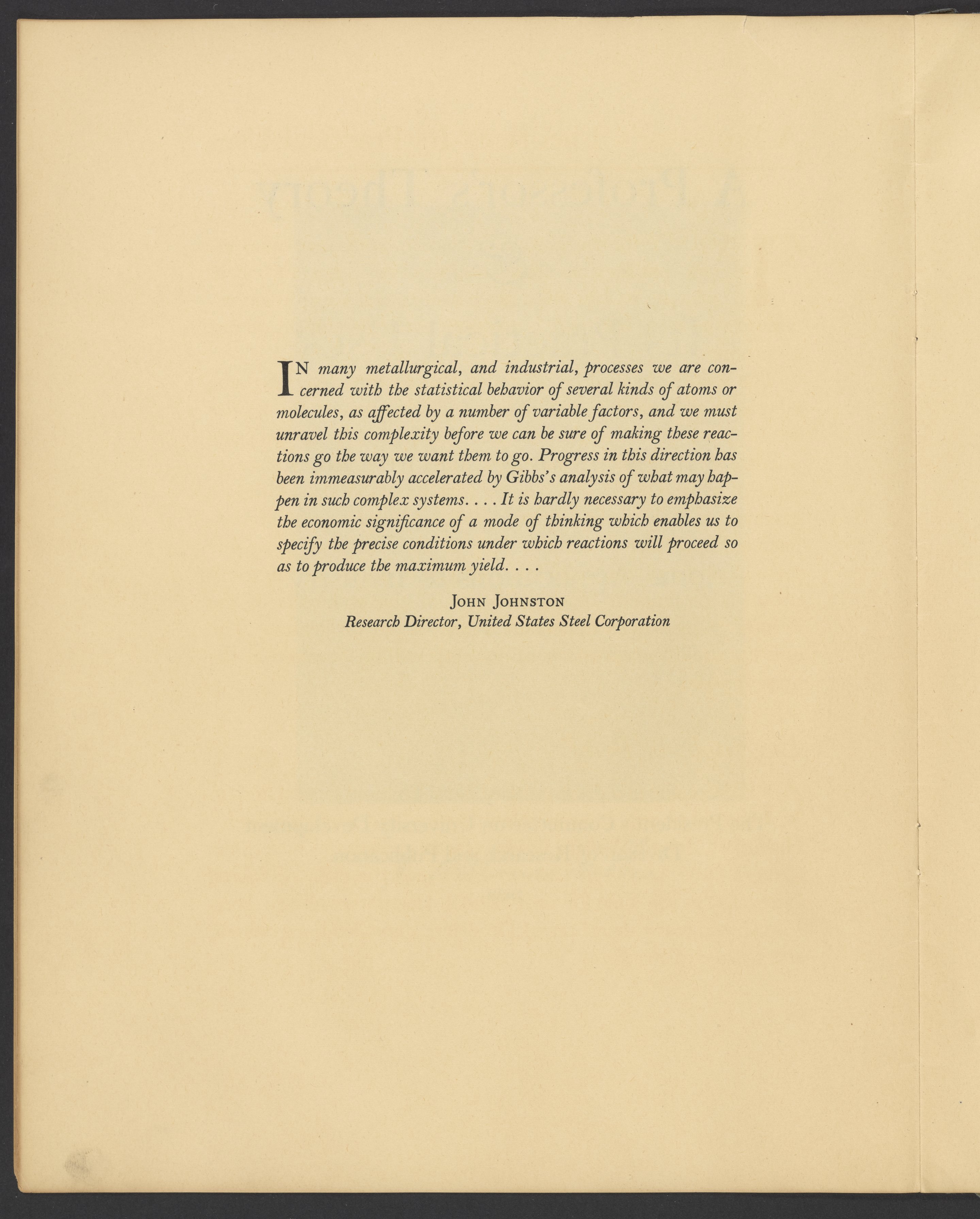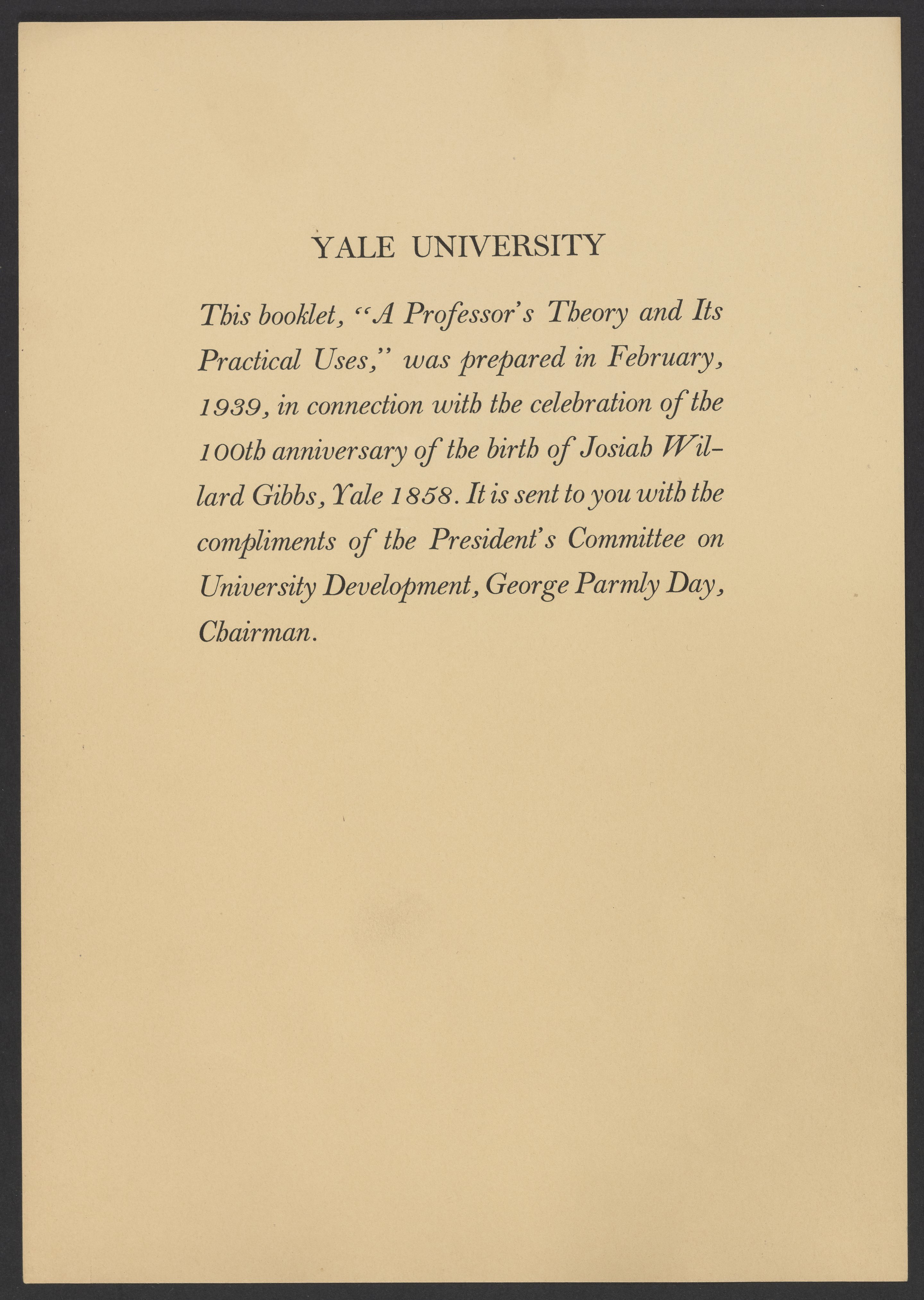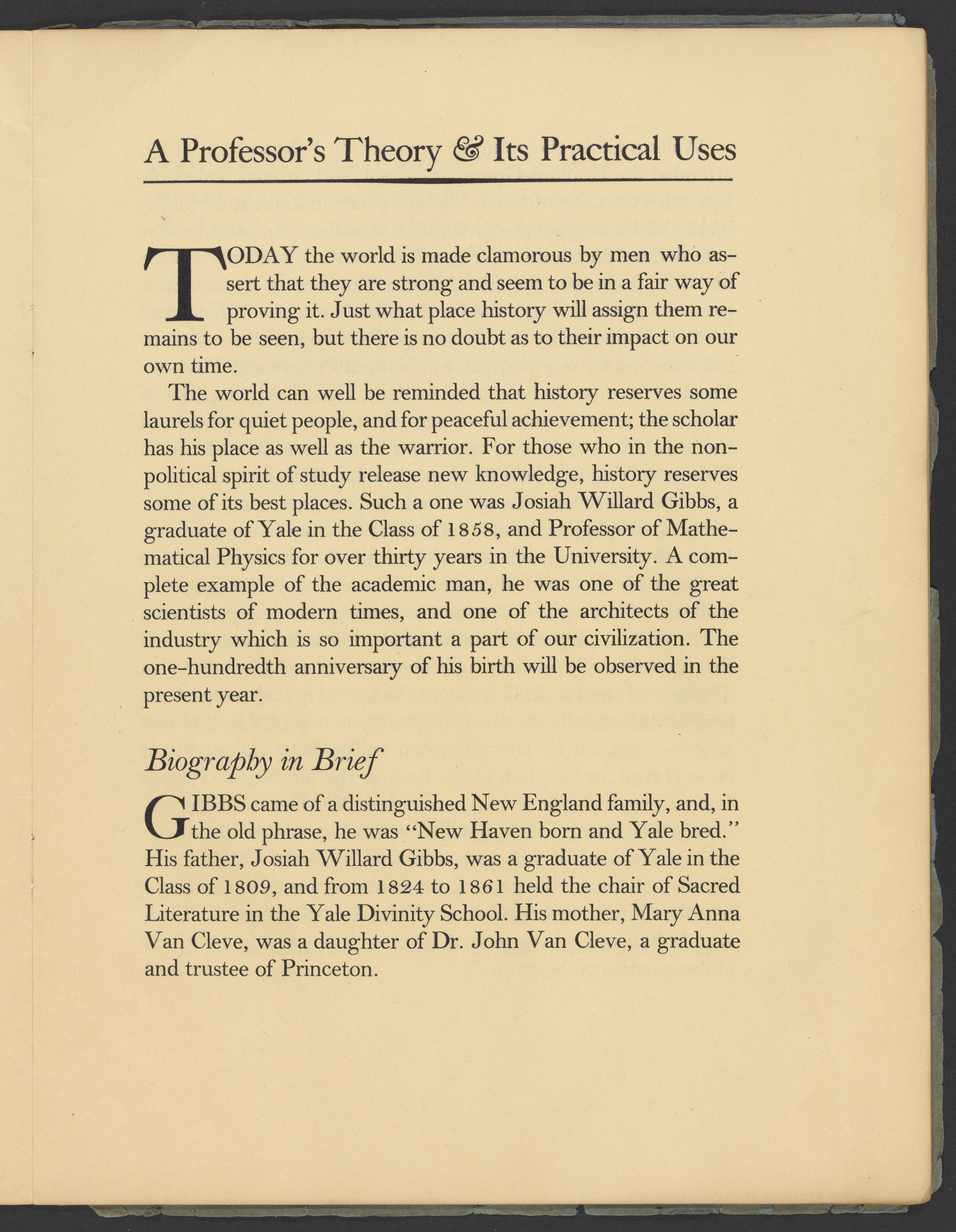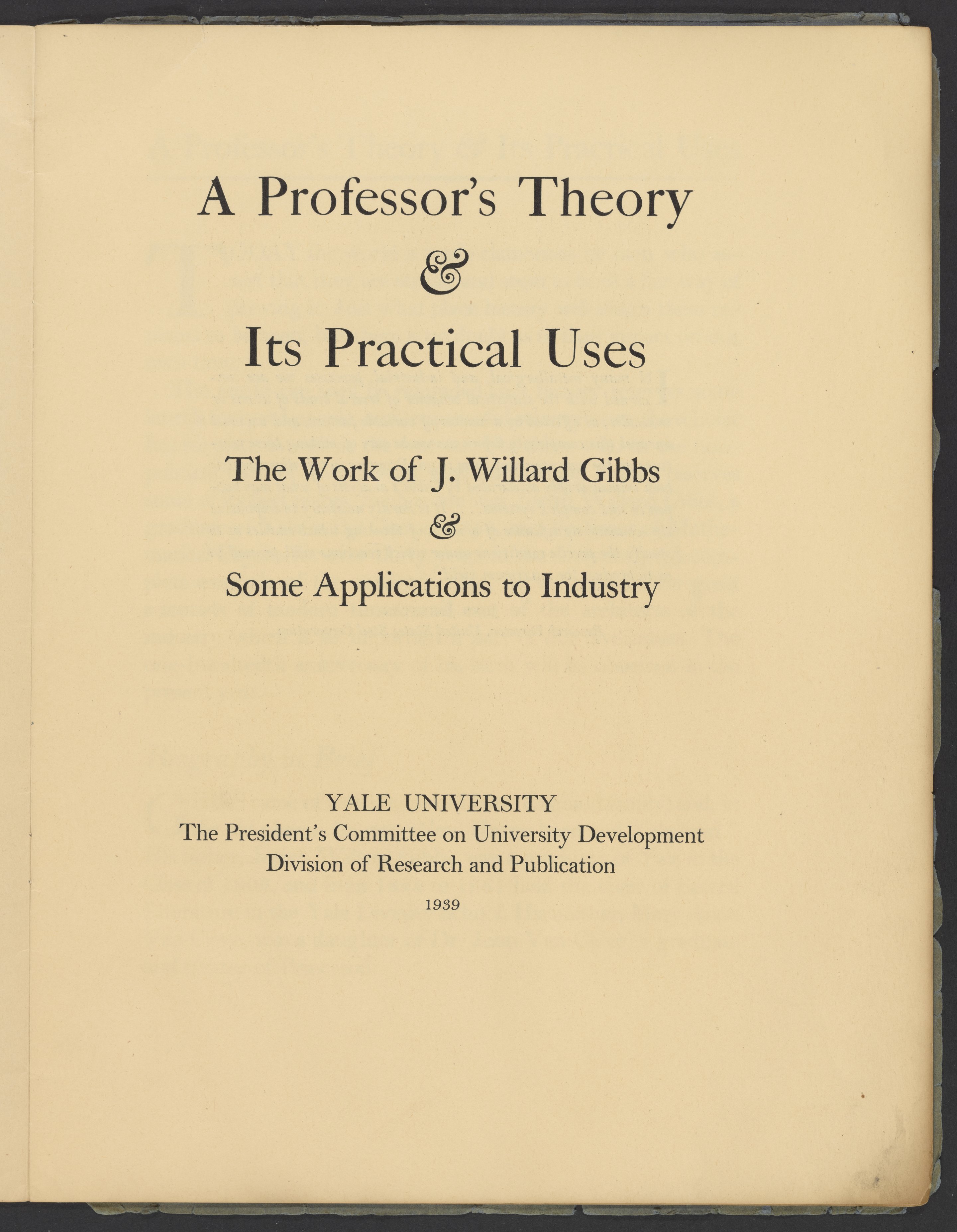 Yale University. “A Professor's Theory and It's Practical Uses: The Work of J. Willard Gibbs & Some Applications to Industry.” New Haven, Connecticut: Yale University Press, 1939. Papers of Georg and Max Bredig, Box 3, Folder 1. Science History Institute. Philadelphia. https://digital.sciencehistory.org/works/brxztg9.