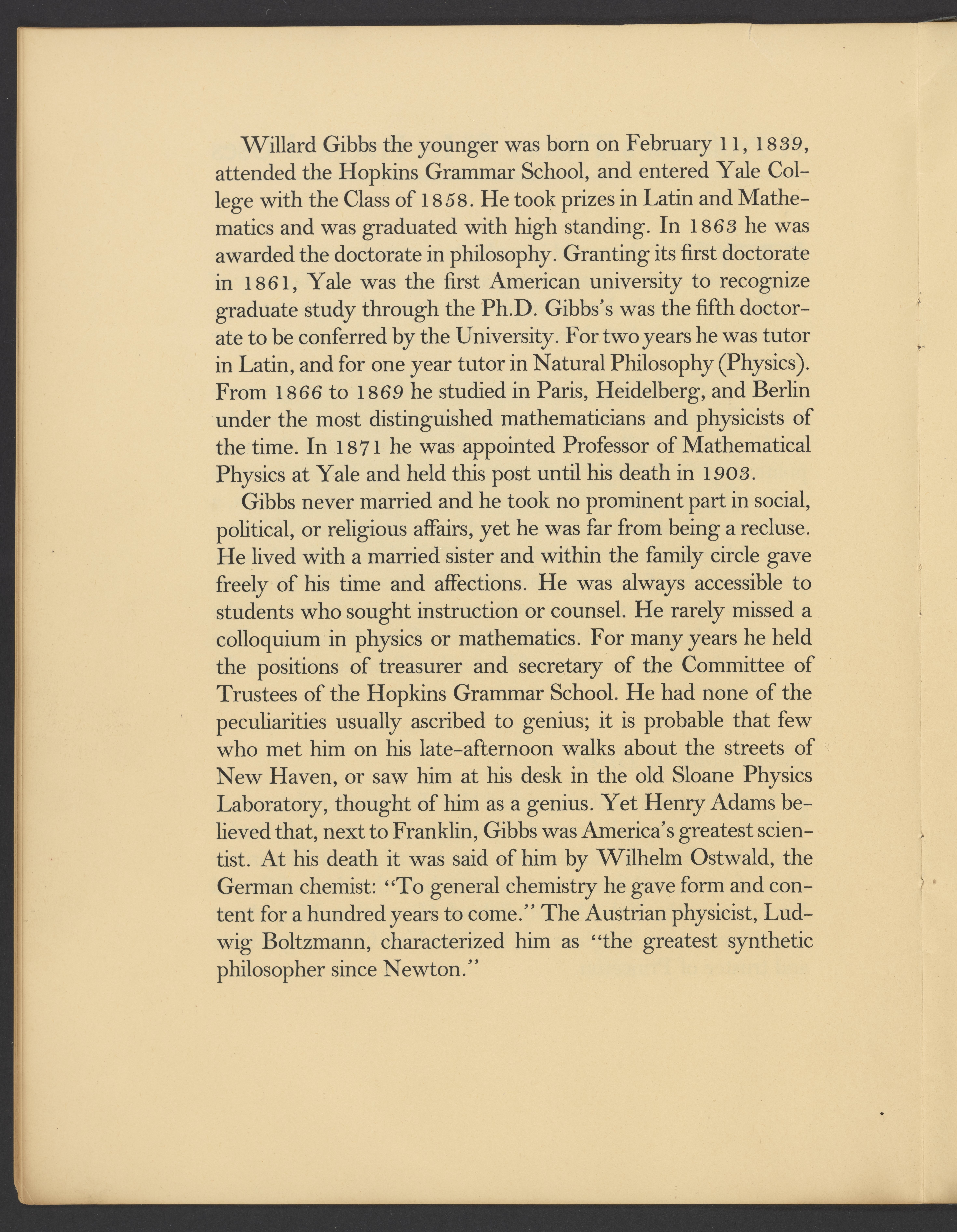 Small JPG1200 x 1574px — 247 KBLarge JPG2880 x 3778px — 1.7 MBFull-sized JPG5775 x 7575px — 6.2 MBOriginal fileTIFF — 5775 x 7575px — 125 MBBooklet created to celebrate the 100th anniversary of the birth of Josiah Willard Gibbs (1839-1903). Gibbs, a Yale alumnus, was an American chemist and pioneer in the field of physical chemistry.