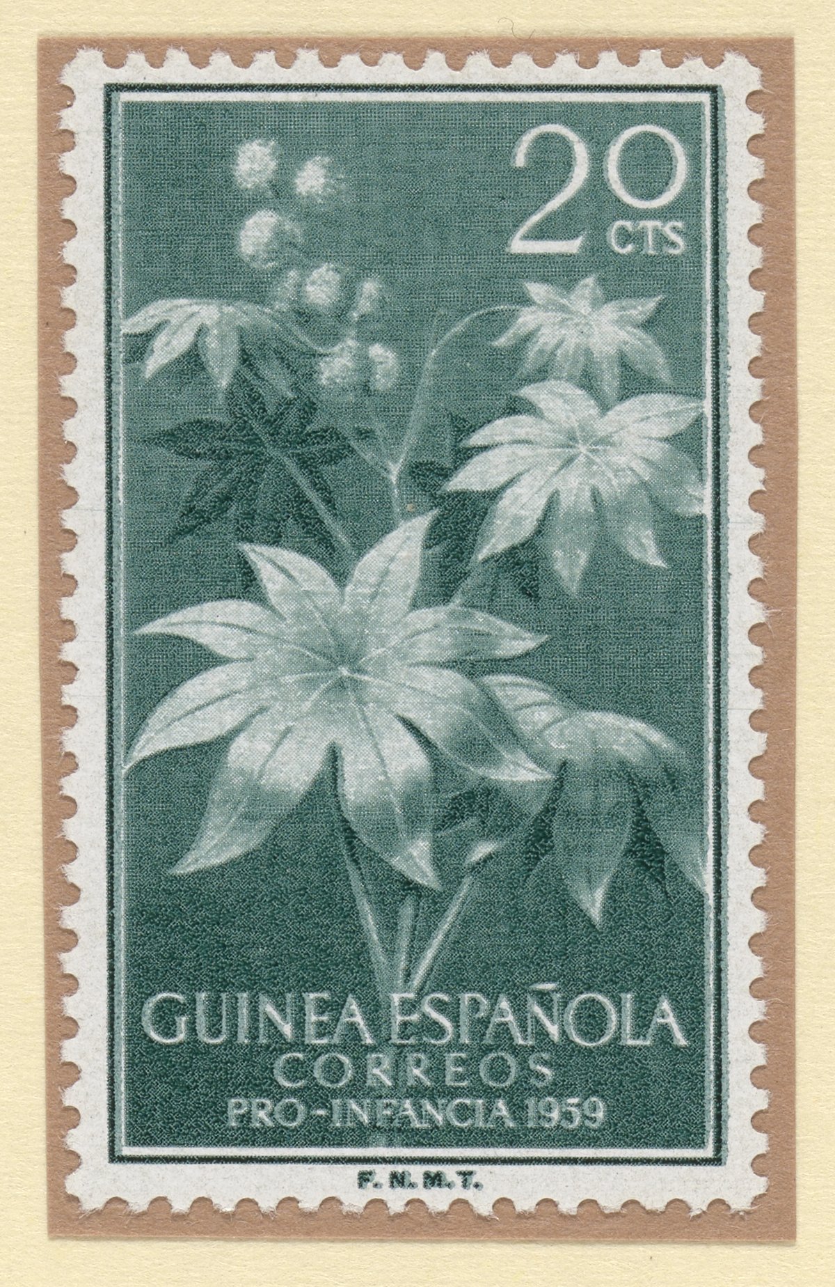 PDFFull-sized JPG1200 x 1848px — 601 KBOriginal fileTIFF — 1200 x 1848px — 6.4 MB1959 postage stamp from Spanish Guinea (Republic of Equatorial Guinea) featuring a castor oil plant. This stamp is part of a series for the "Pro-Infancia" (For Childhood) fund.
