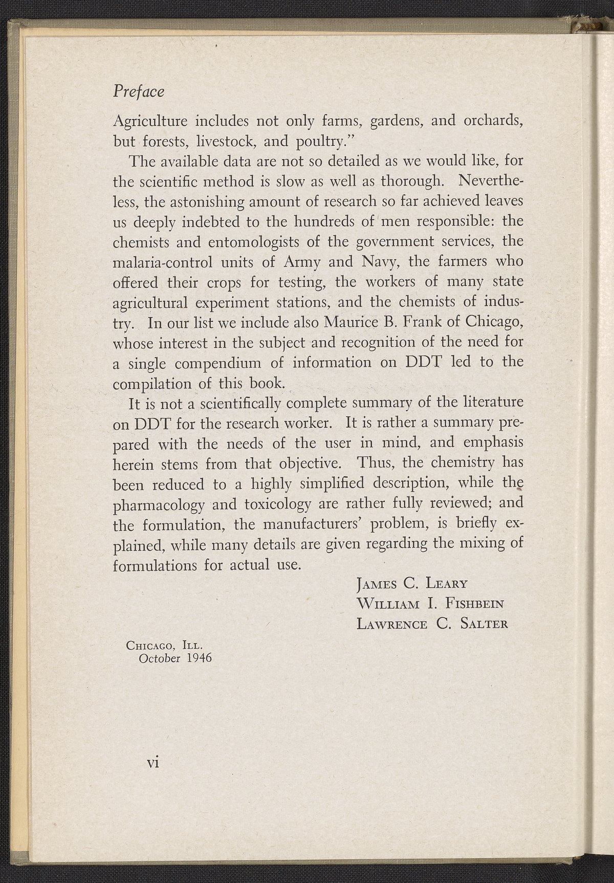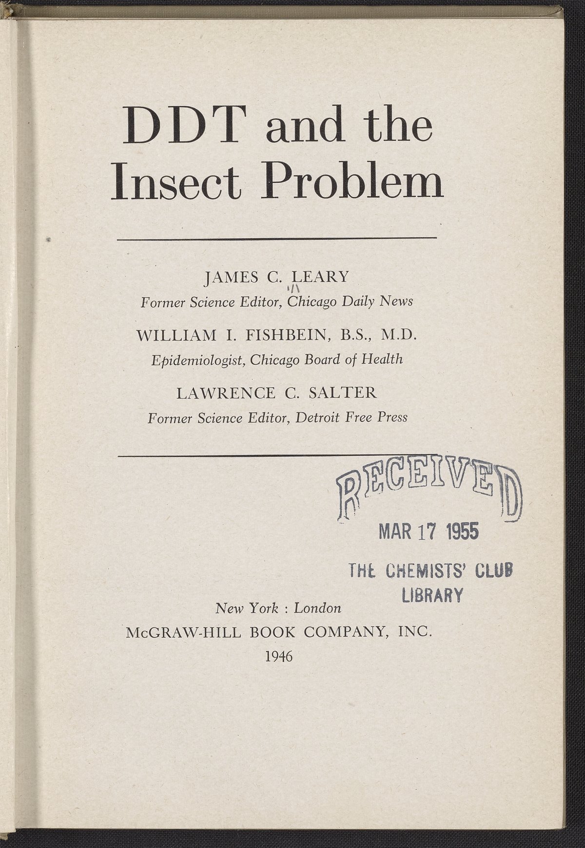 Leary, James C., William I. Fishbein, and Lawrence C. Salter. “DDT and the Insect Problem.” New York, New York: McGraw-Hill Book Company, 1946. SB952.D2 L43 1946. Science History Institute. Philadelphia. https://digital.sciencehistory.org/works/btl9jr0.