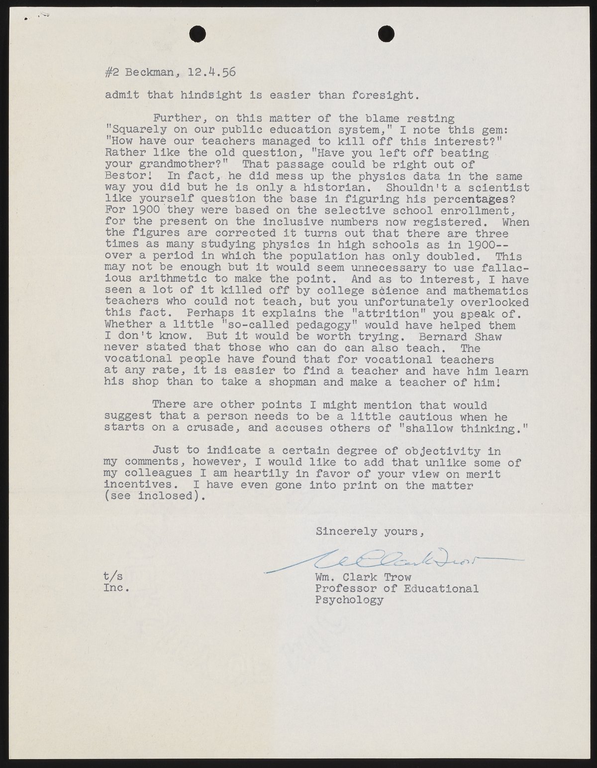 This is one of many letters written to Arnold Beckman in response to his U.S. News & World Report article on the topic of education. William Trow, a professor of educational psychology at the University of Michigan, suggests that criticism of progressive education is often vague and ill-informed, and that the socialism Beckman decries is also responsible for the Soviet science he praises.
