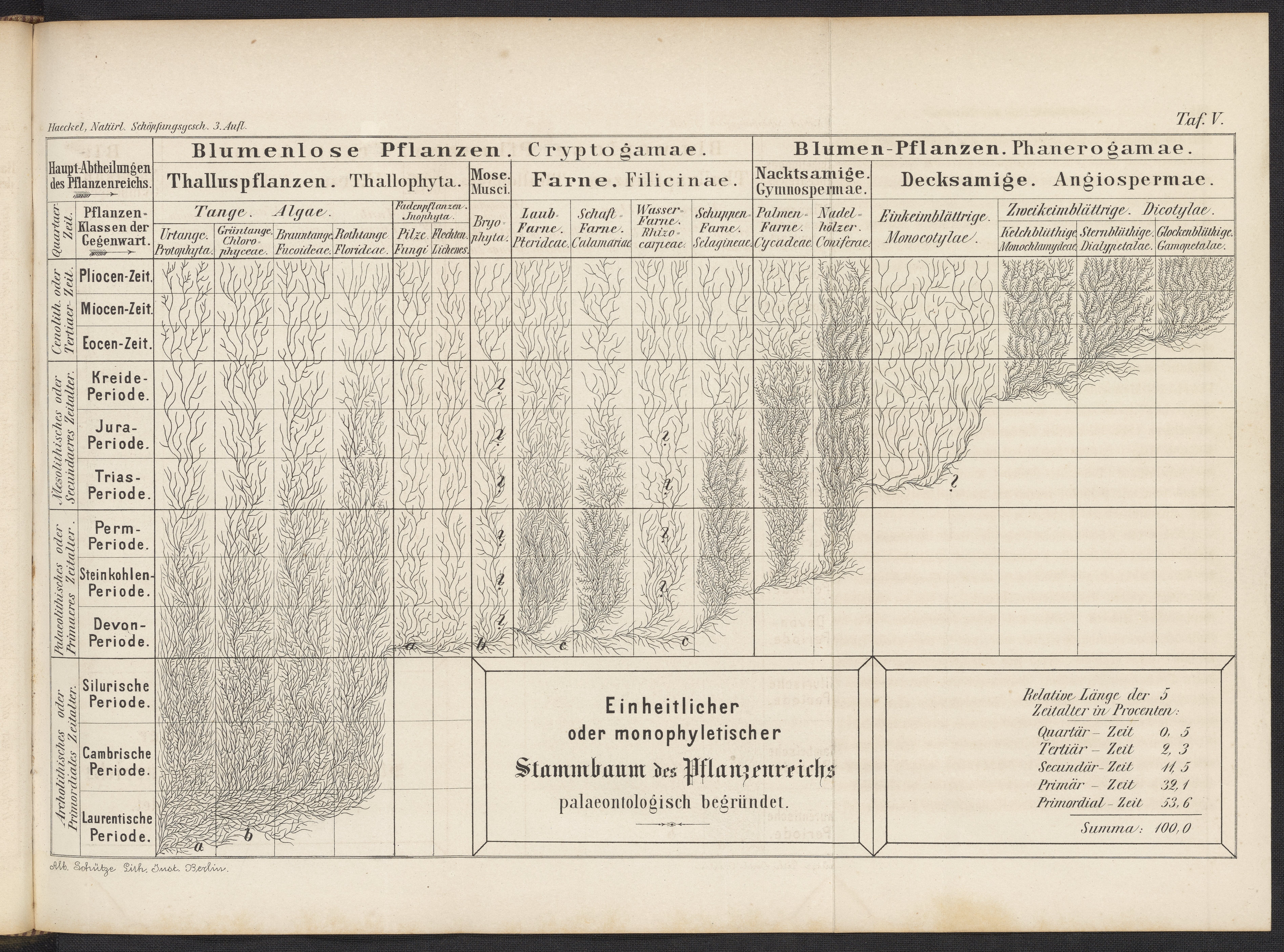 Plate illustrates the paleontological tree of the vegetable kingdom divided by era and species. Title translates to "Single-stemmed or monophyletic pedigree of the vegetable kingdom based on paleontology." Divisions include flowerless/flowering plants, algae, moss, and ferns.