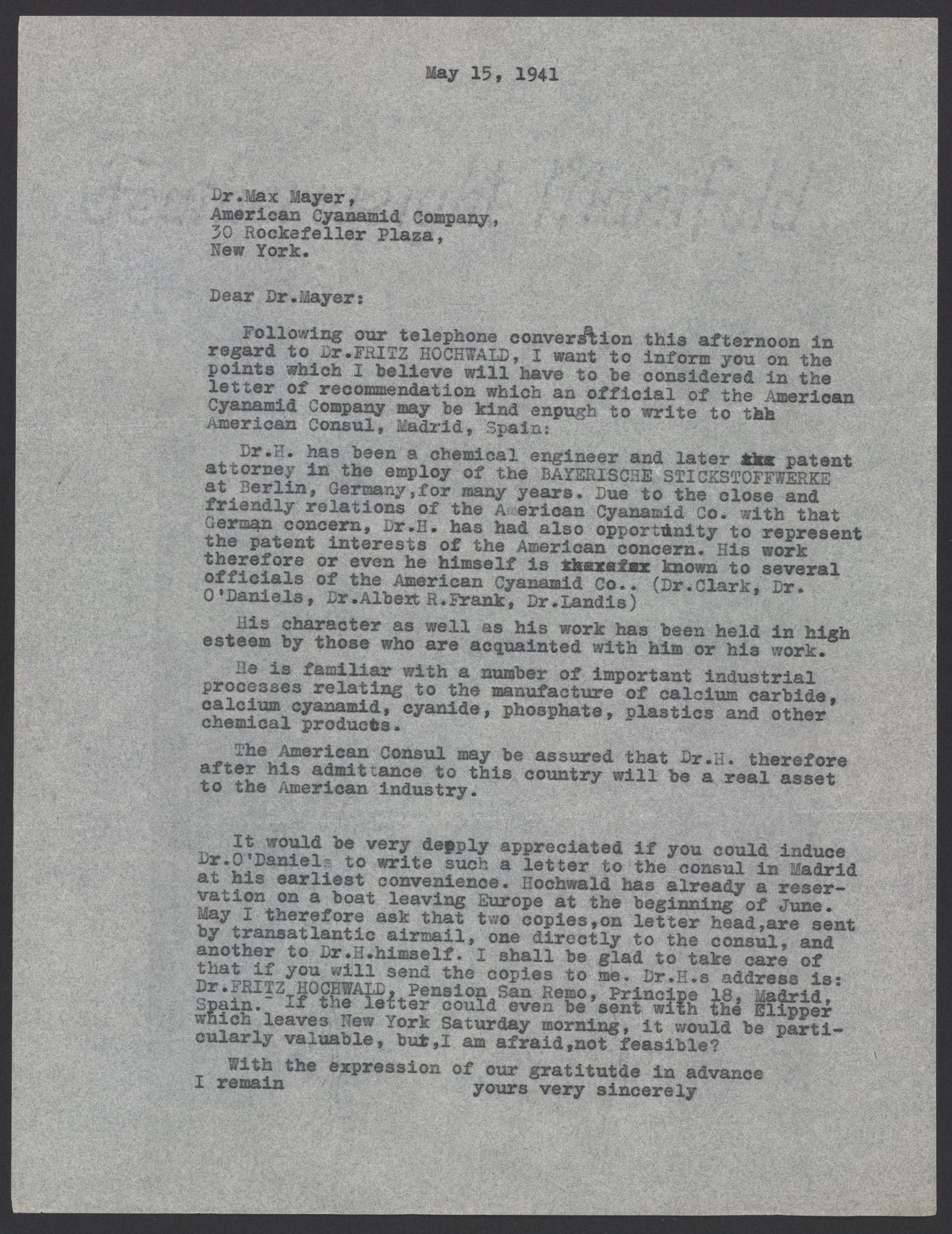 Max Bredig (1902-1977) writes to Max Mayer, regarding a letter of recommendation for Fritz Hochwald (1897-1968). Bredig speaks highly of Hochwald and asks Dr. O'Daniels to write a letter reflecting the contents of this letter.