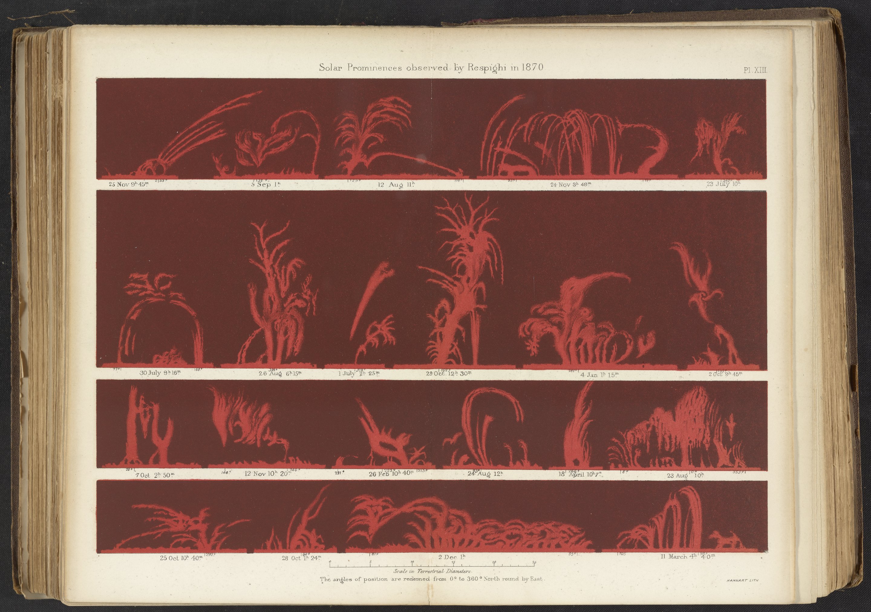 Schellen, Heinrich. “Solar Prominence Observed by Respighi in 1870.” Spectrum Analysis in Its Application to Terrestrial Substances, and the Physical Constitution of the Heavenly Bodies. London, England: M. & N. Hanhart (Printers), 1872. https://digital.sciencehistory.org/works/bz60cx20v.