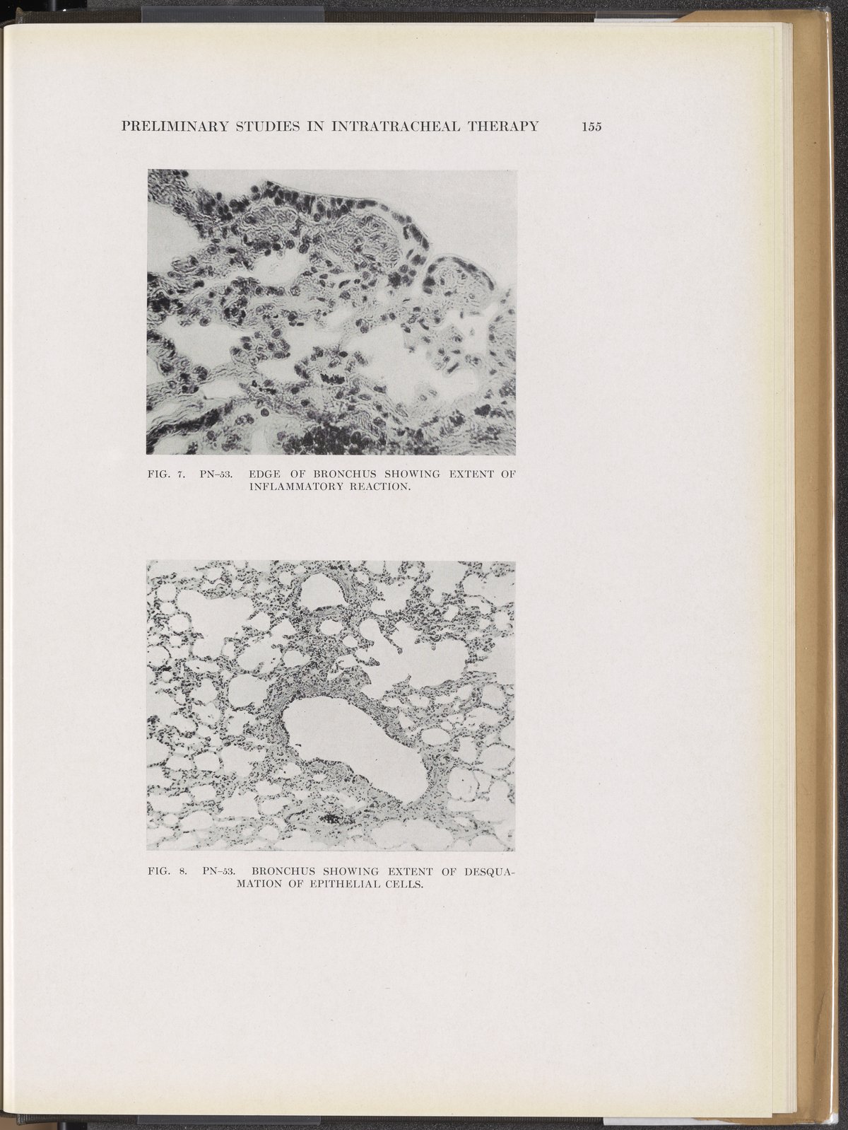 Fig. 7: Edge of bronchus showing extent of inflammatory reaction. Fig. 8: Bronchus showing extent of desquamation of epithelial cells.