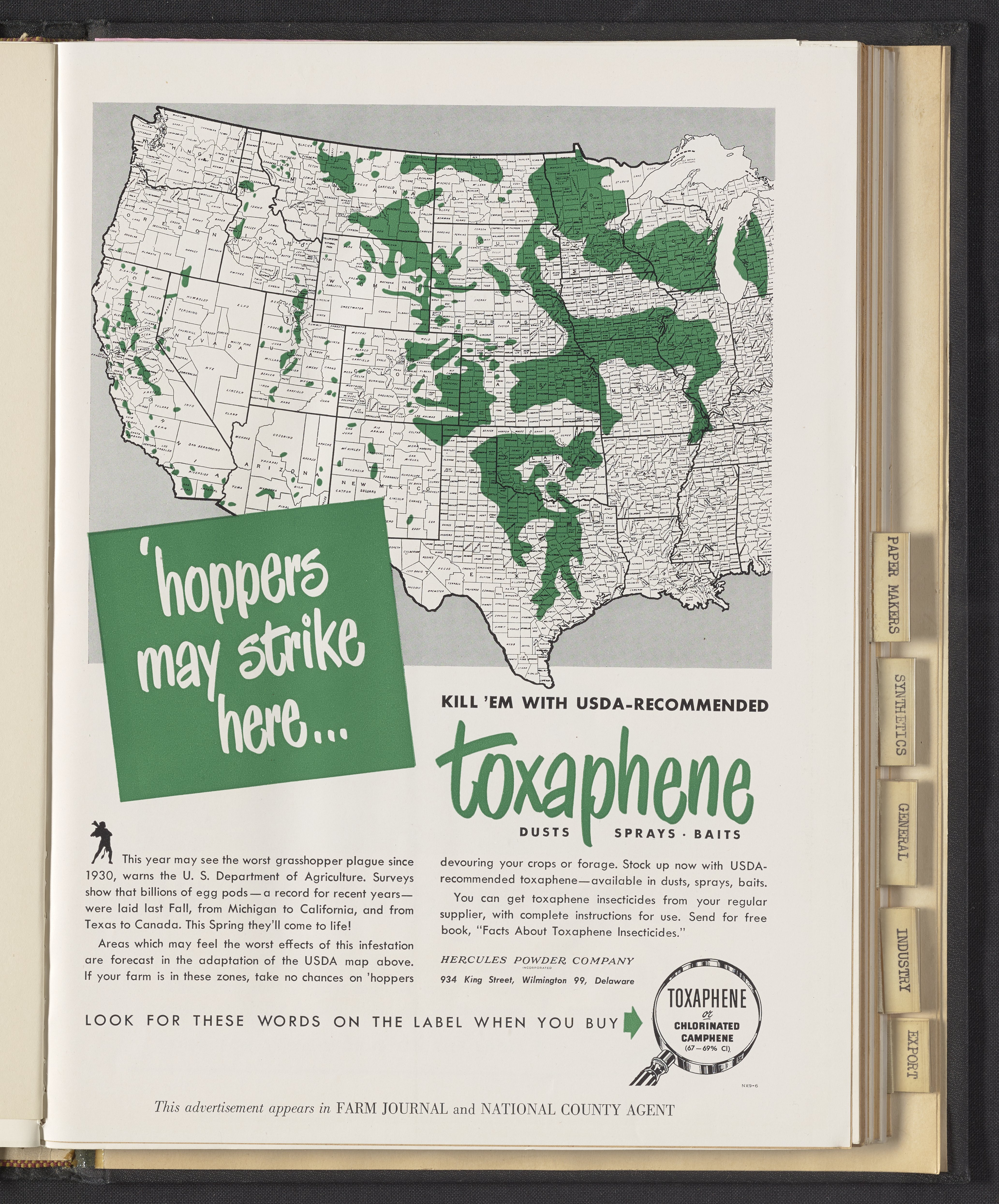 Hercules Incorporated. “'Hoppers May Strike Here...Kill 'Em with USDA-Recommended Toxaphene.” 1949 Hercules Advertisements, 1949. Records of Hercules Incorporated, Volume 1949. Science History Institute. Philadelphia. https://digital.sciencehistory.org/works/c247ds84r.