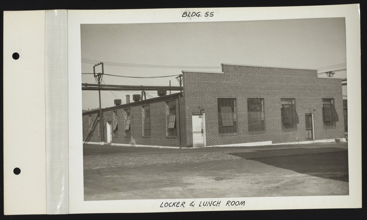 General view of the exterior of the locker and lunch room facilities (Building 55) at the Charles Lennig and Company chemical manufacturing plant in Bridesburg, a neighborhood located along the Delaware River in the Northeast section of Philadelphia, Pennsylvania. Charles Lennig and Company operated as a subsidiary of the Rohm and Haas Company, an international chemical company headquartered in Philadelphia, from 1920 to 1947.