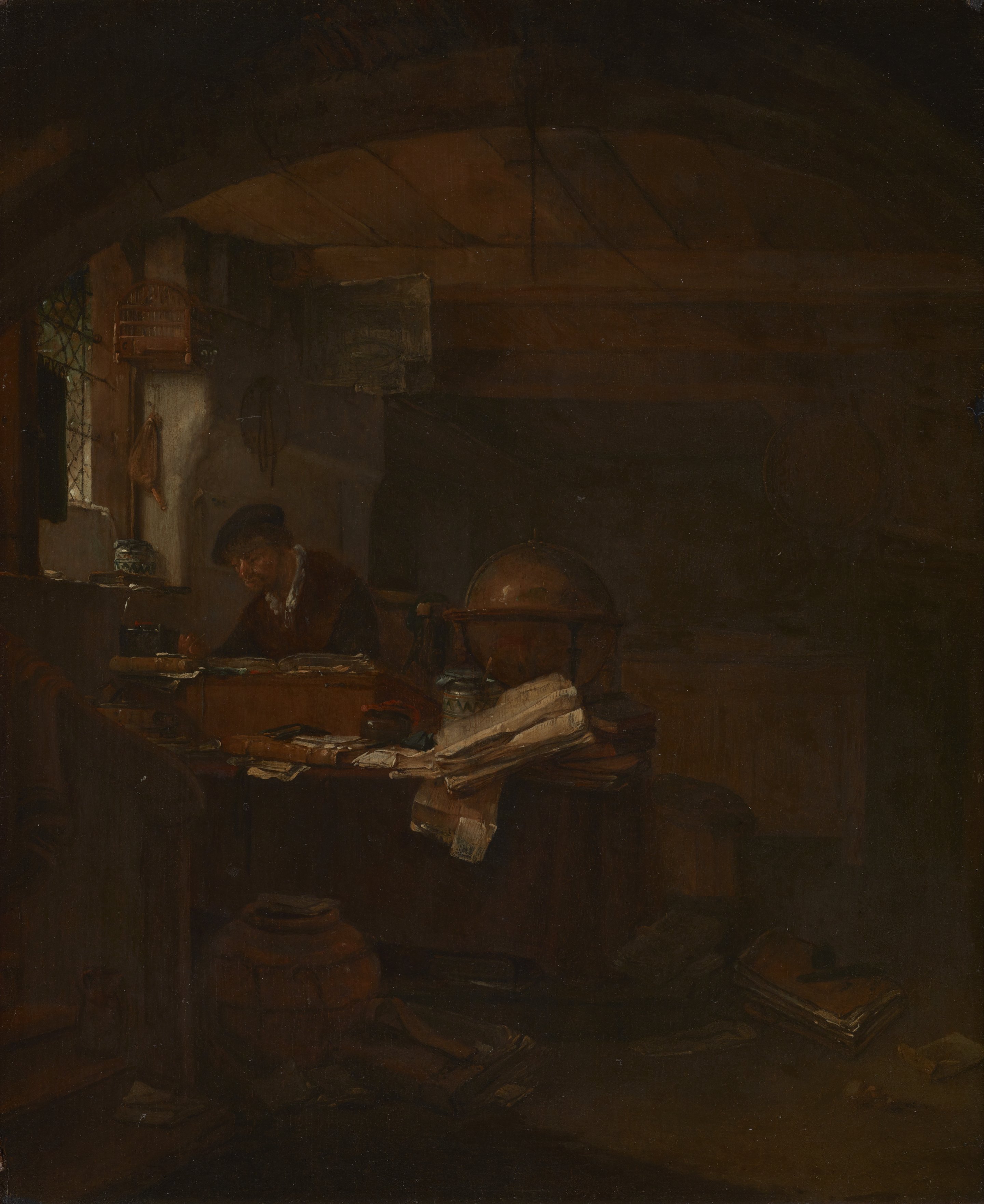 In the warm light of a left-hand window, a scholar sits absorbed in his work. His desk is topped with a wooden lectern, small vials and vessels, a globe, and an apothecary's jar with a red cloth lid. The room in which he works is humble, with a wood-beamed ceiling crossed by an archway. On the floor beside his desk sits a pile of texts and a large earthenware pot, suggesting both practical work and long hours of study.