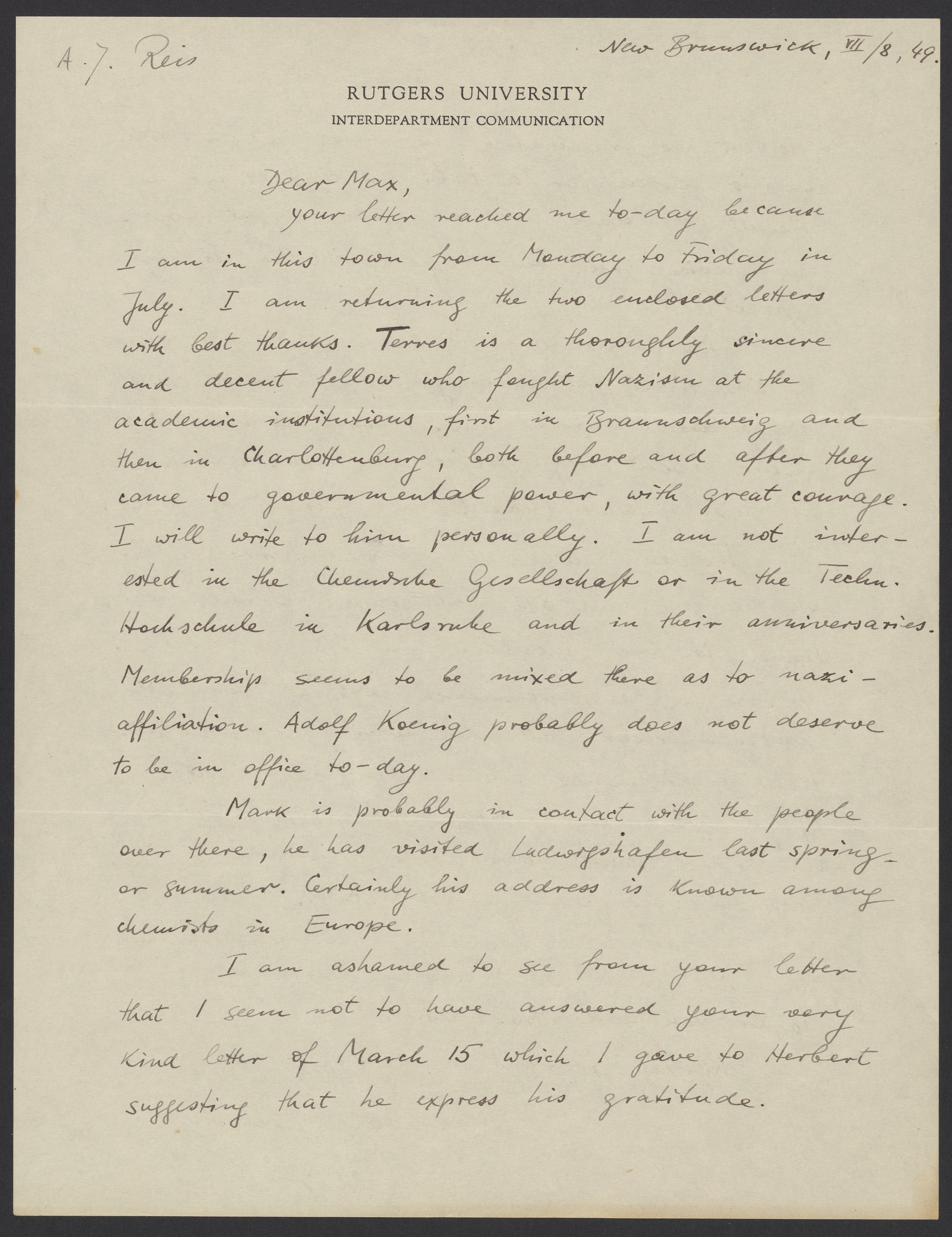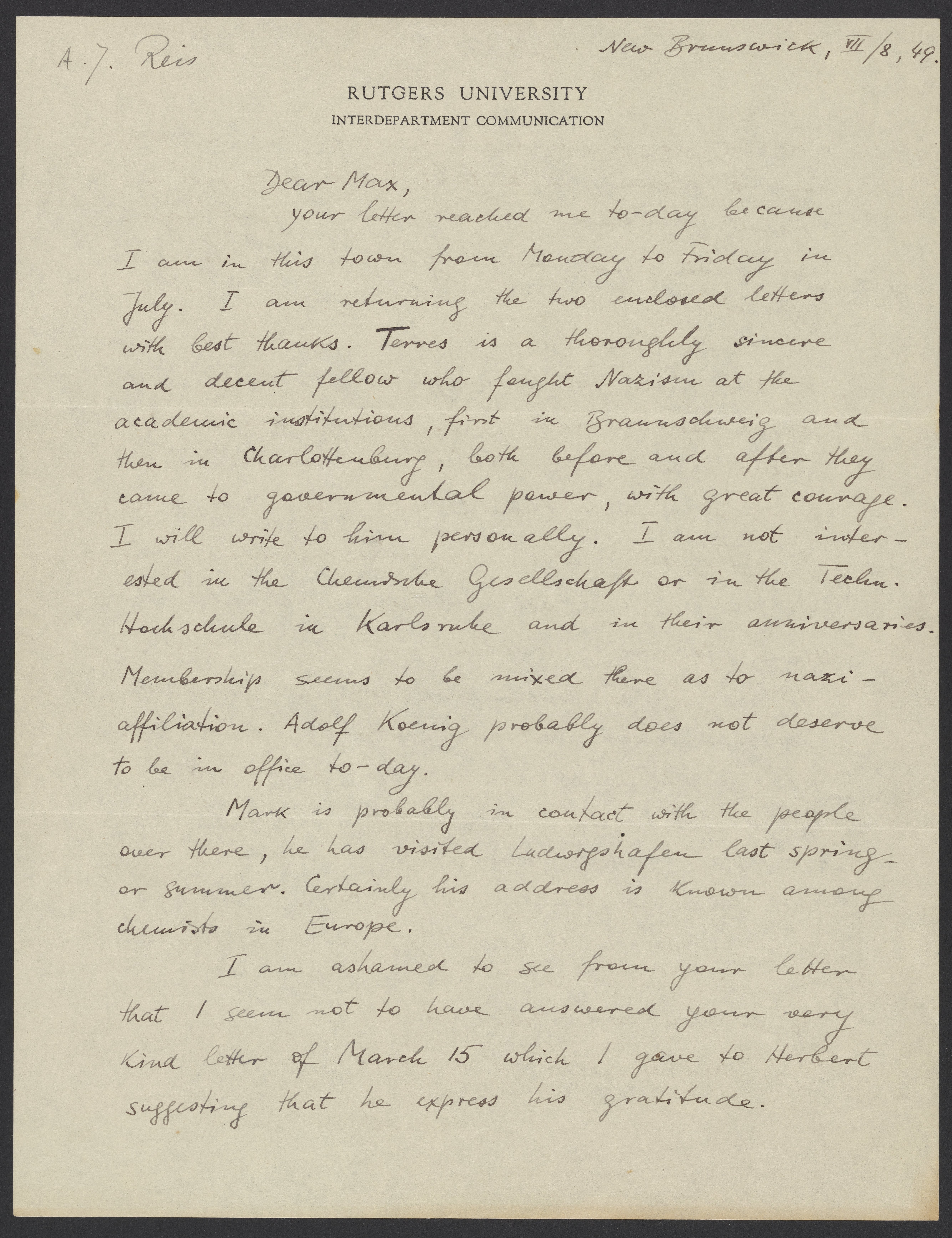 Letter from Alfred Reis to Max Bredig, July 8, 1949