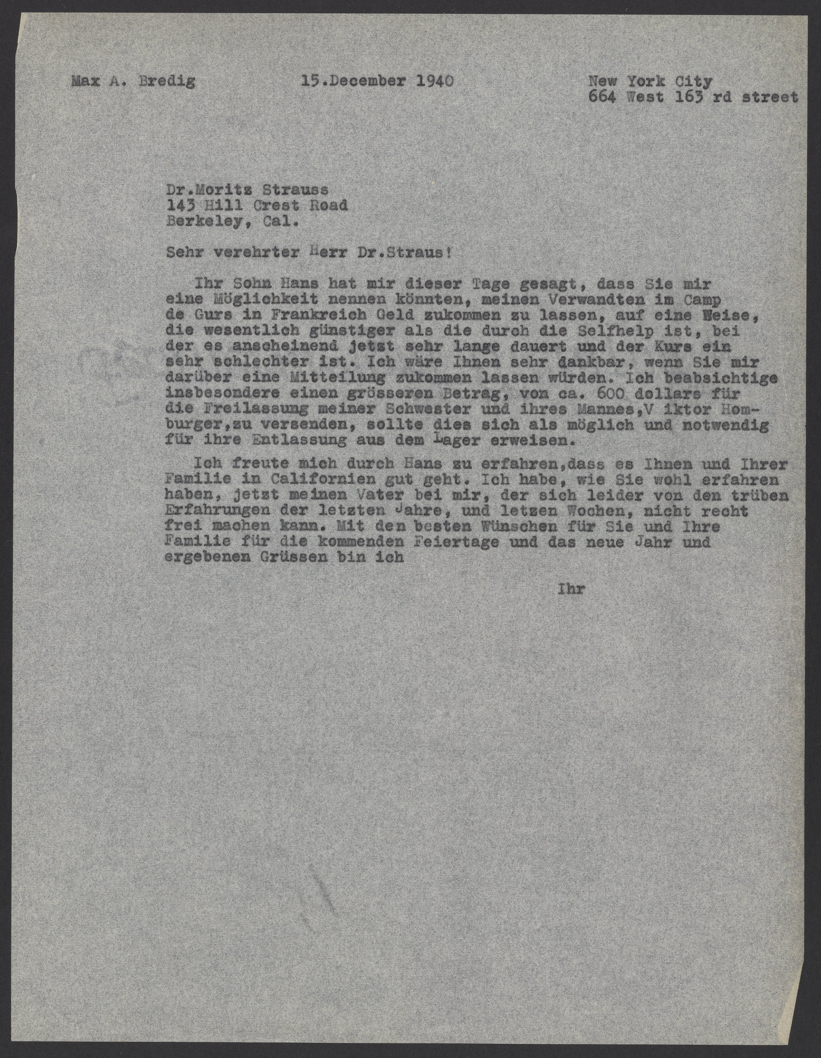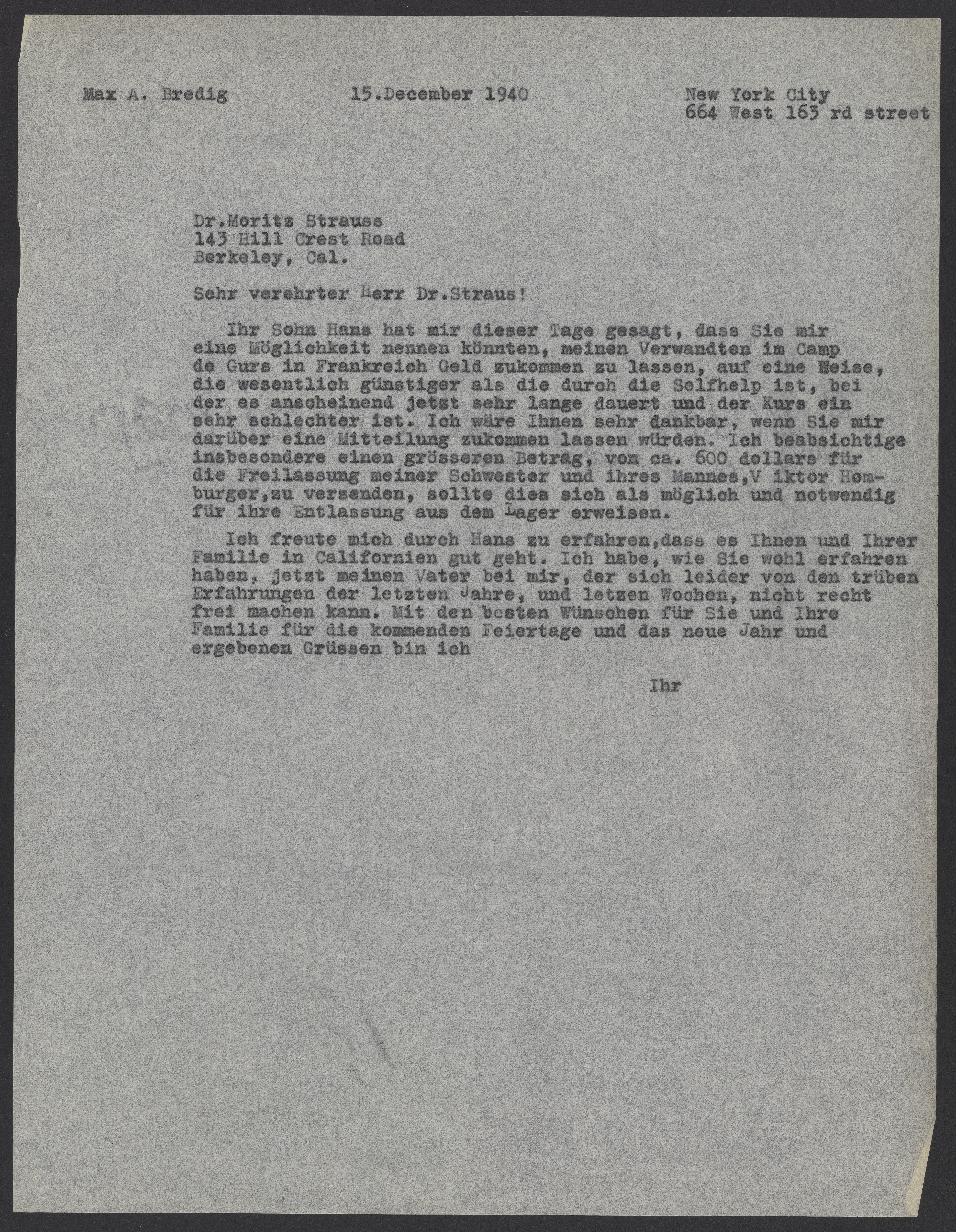 Max Albert Bredig (1902-1977) asks Moritz Straus about sending money to his sister, Marianne Homburger (1903-1986), who is interned at the Gurs concentration camp in France.