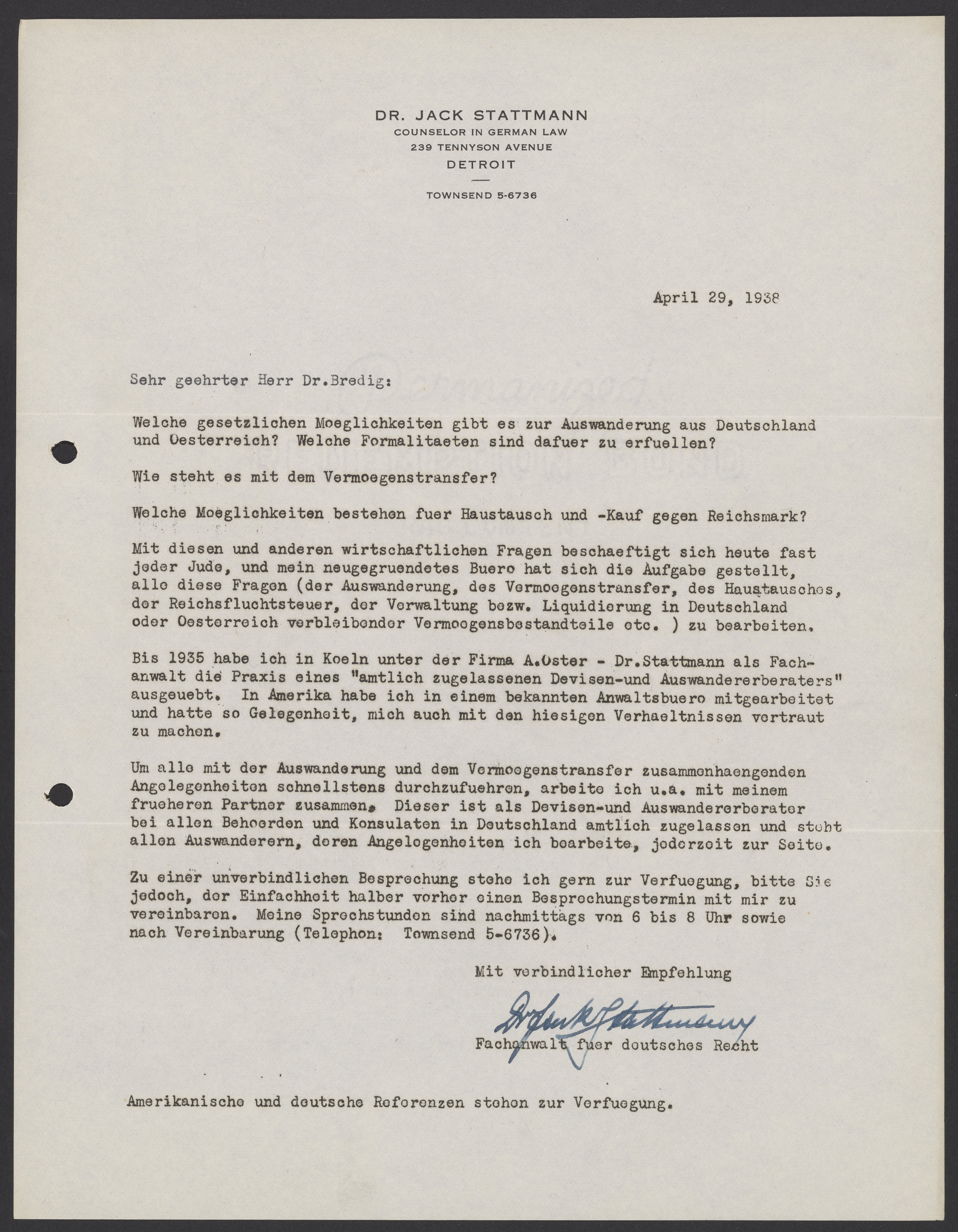 Dr. Jack Stattmann, a specialist attorney in German law and emigration matters, offers his legal services to Max Albert Bredig (1902-1977).